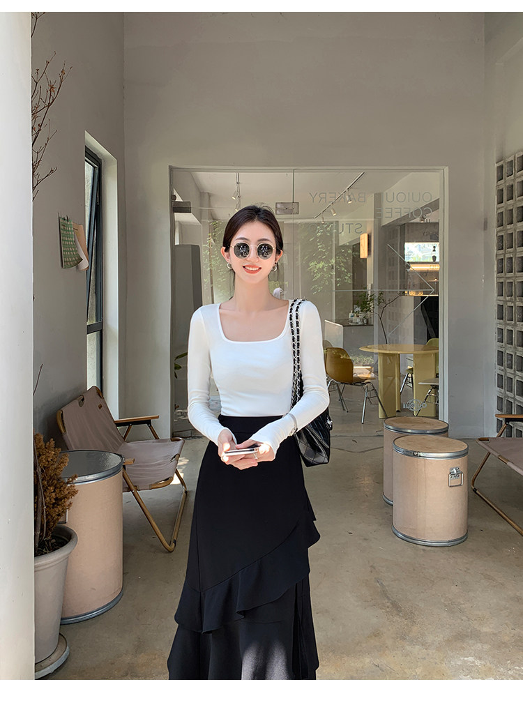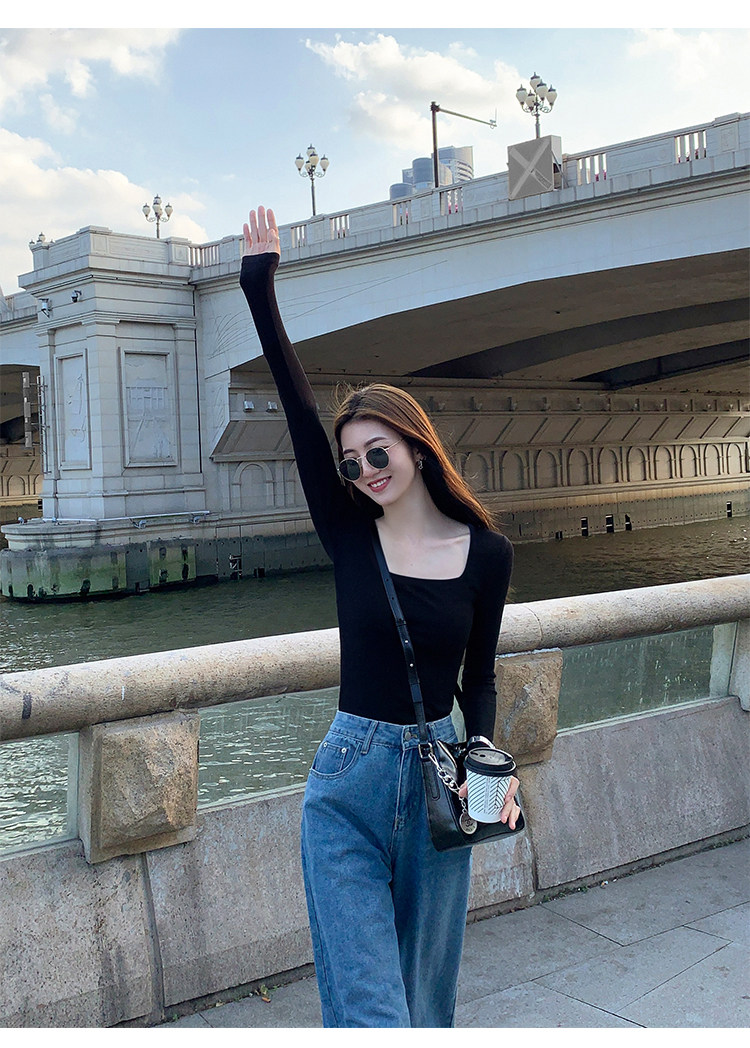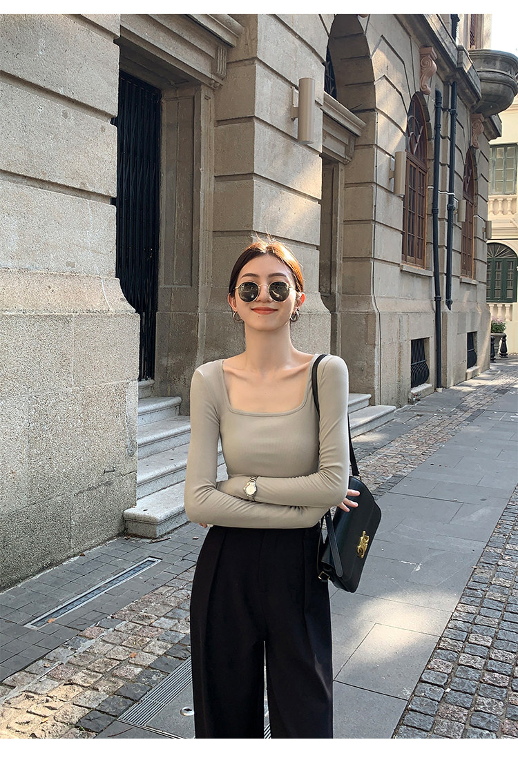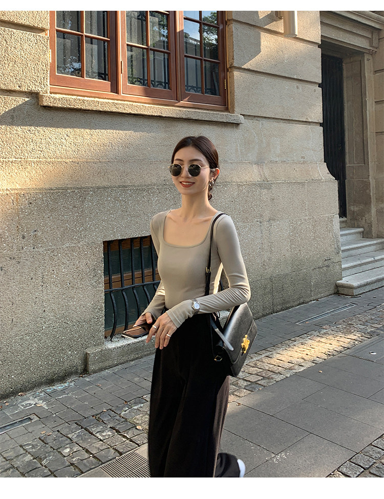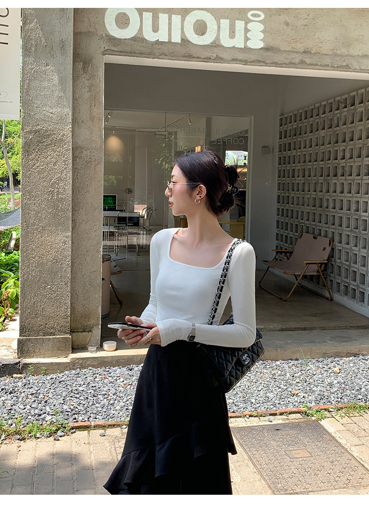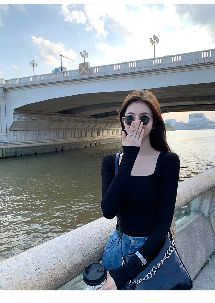 Mulvan Black Square-Neck Long-Sleeve Knit T-Shirt for Women, Autumn and Winter Slim Fit, Slimming, Inner Wear, Collarbone-Exposing Base Shirt Top
