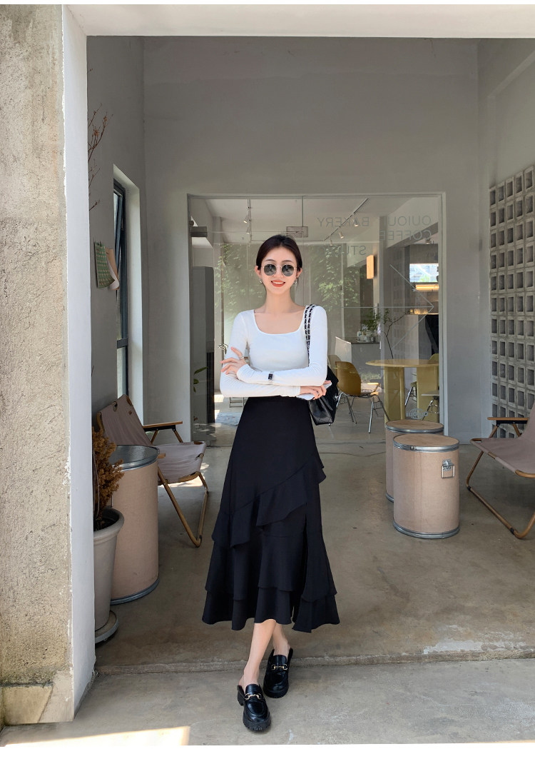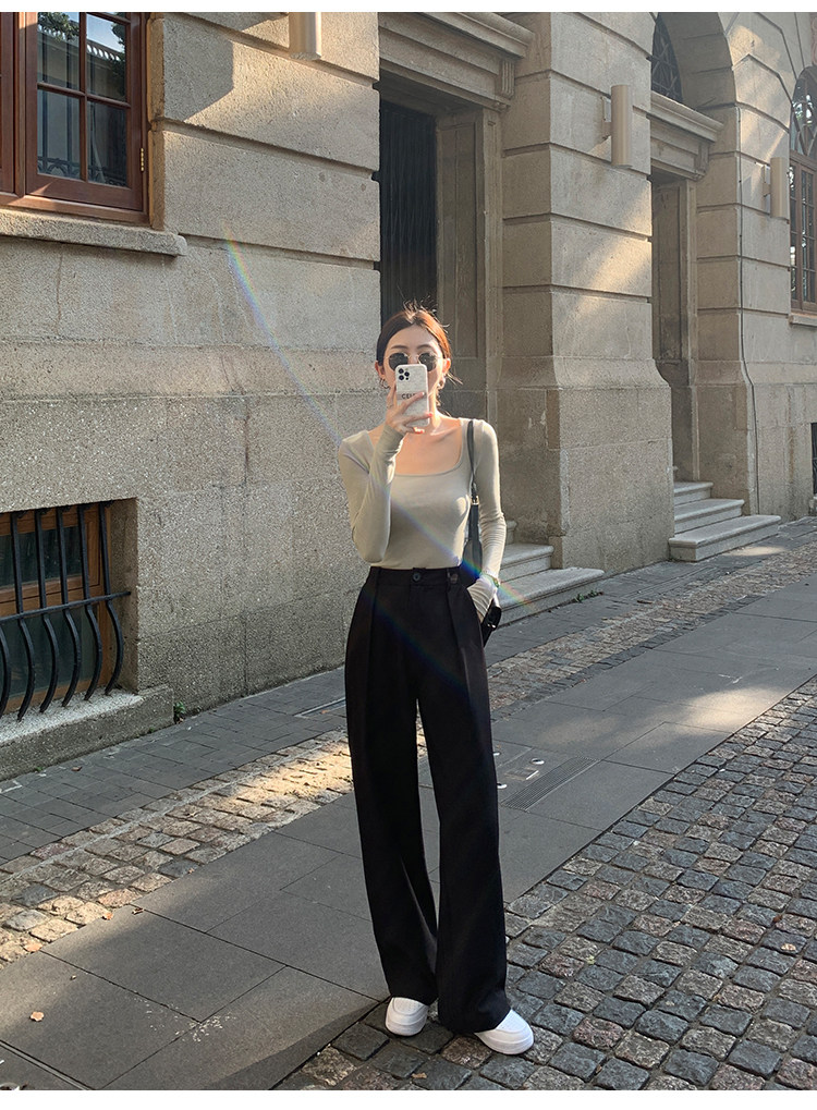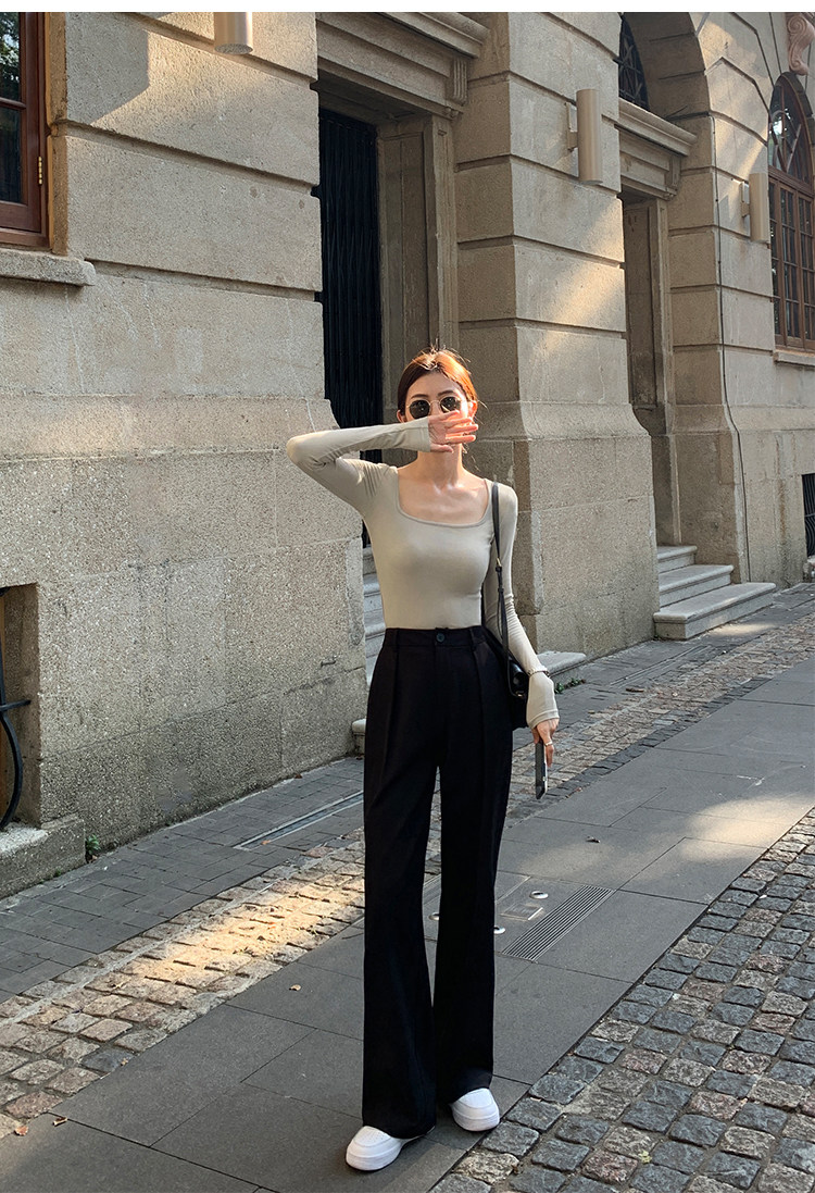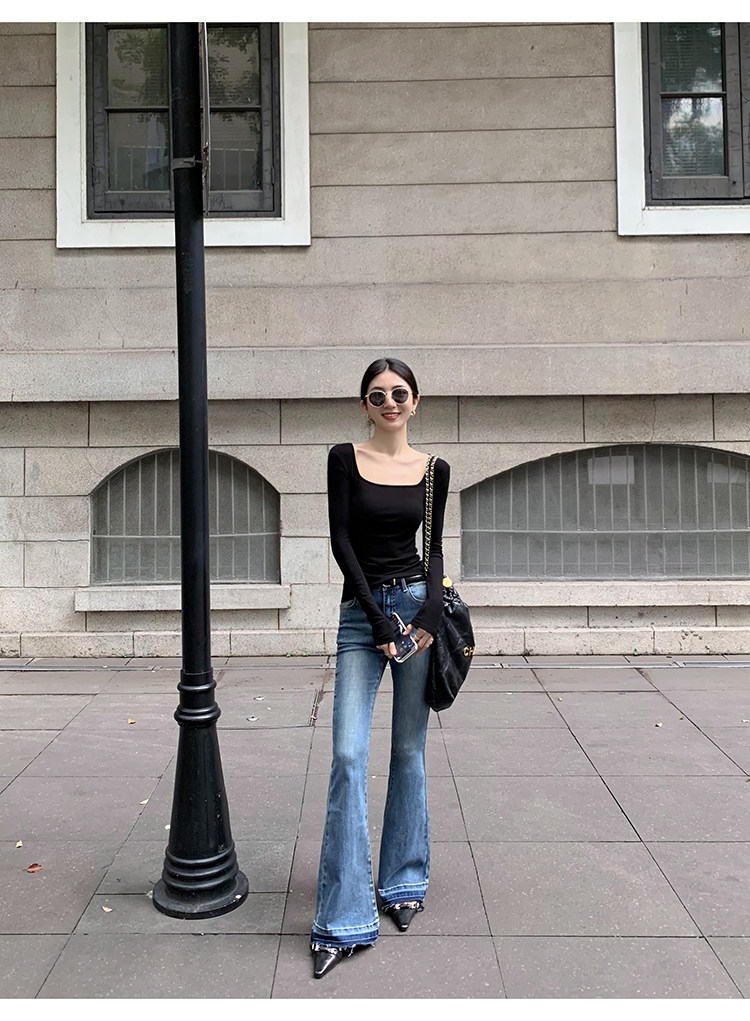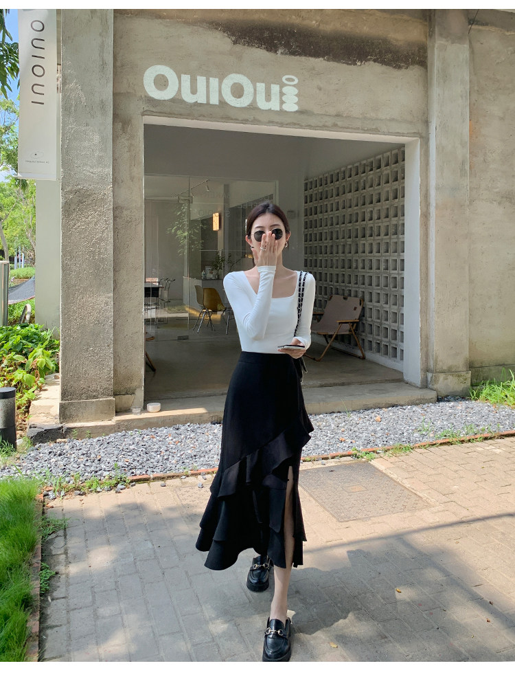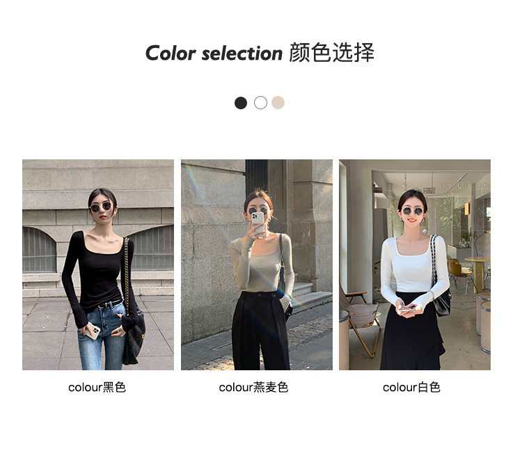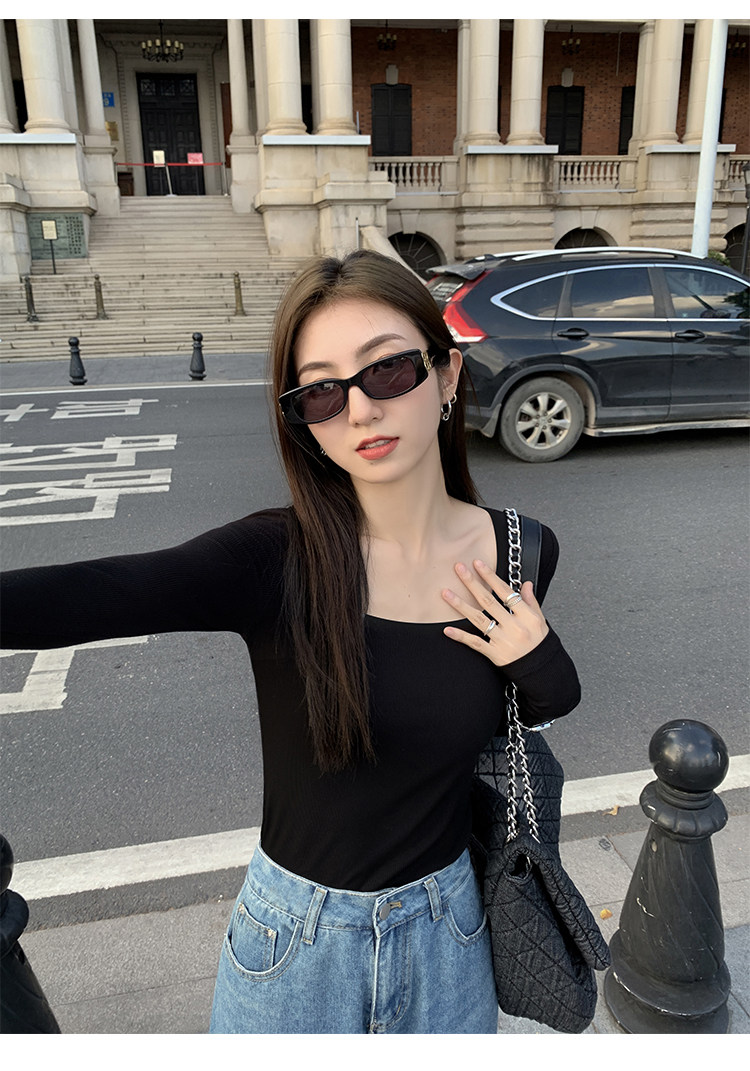 Mulvan Black Square-Neck Long-Sleeve Knit T-Shirt for Women, Autumn and Winter Slim Fit, Slimming, Inner Wear, Collarbone-Exposing Base Shirt Top
