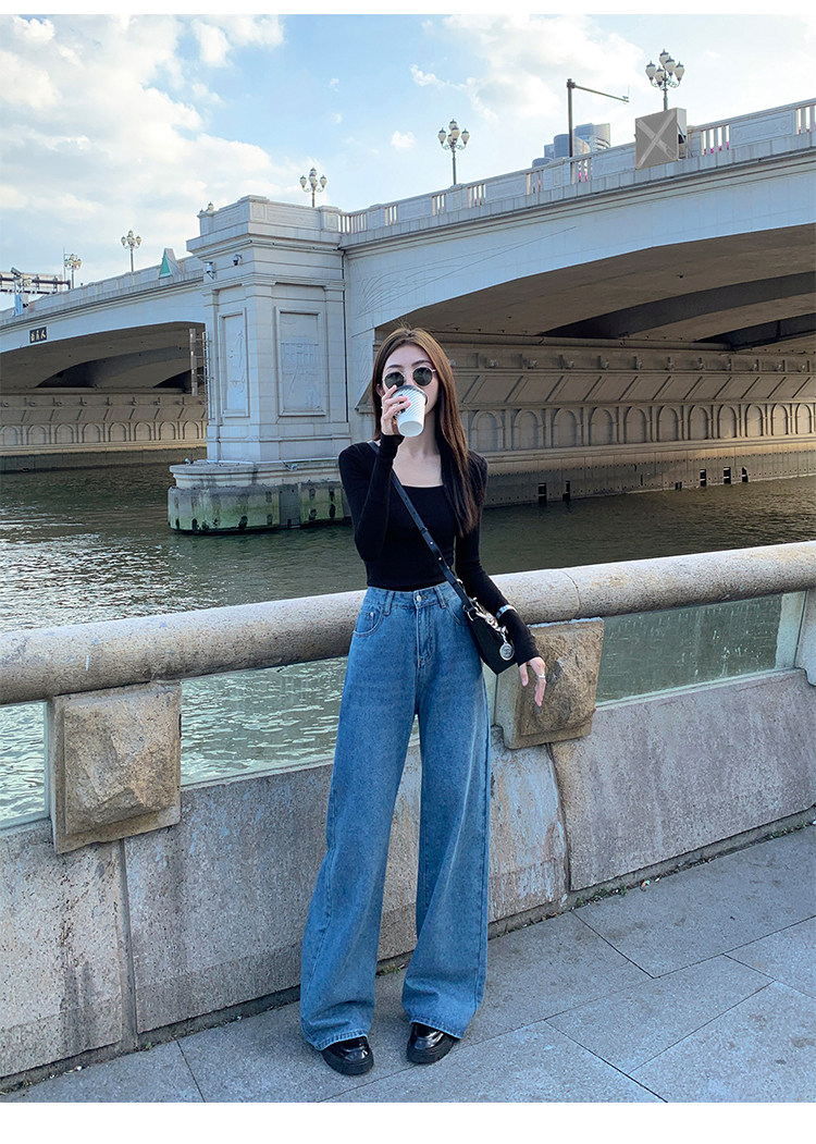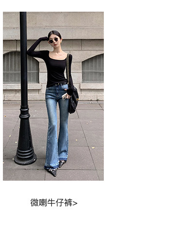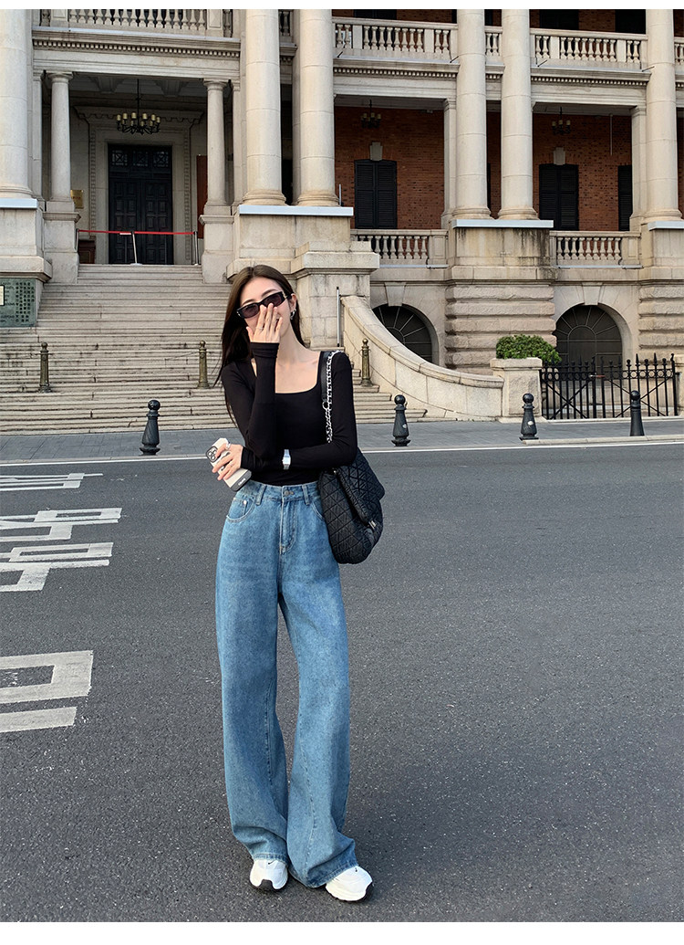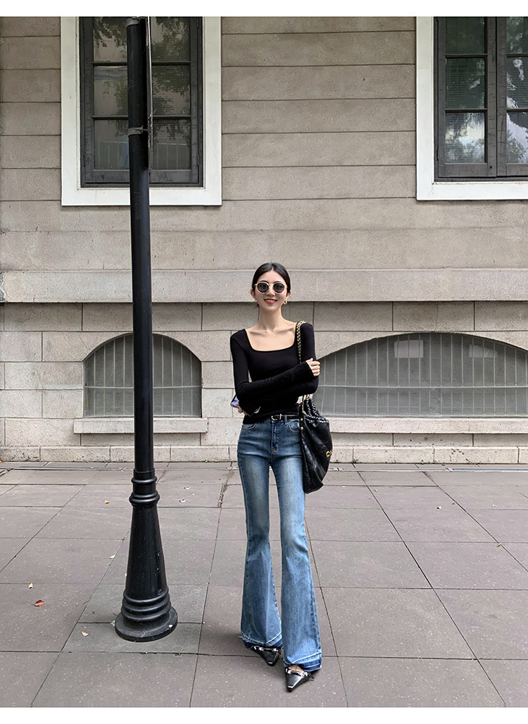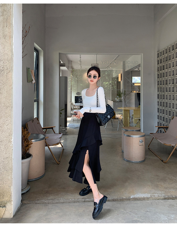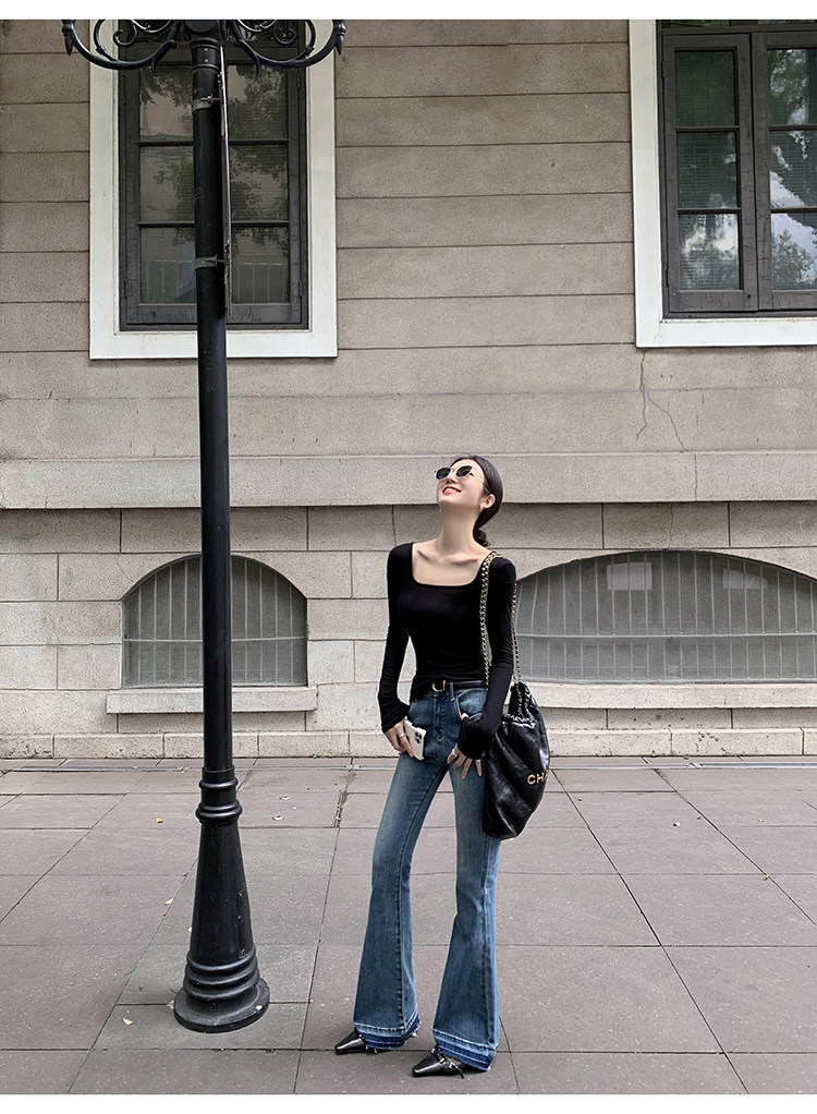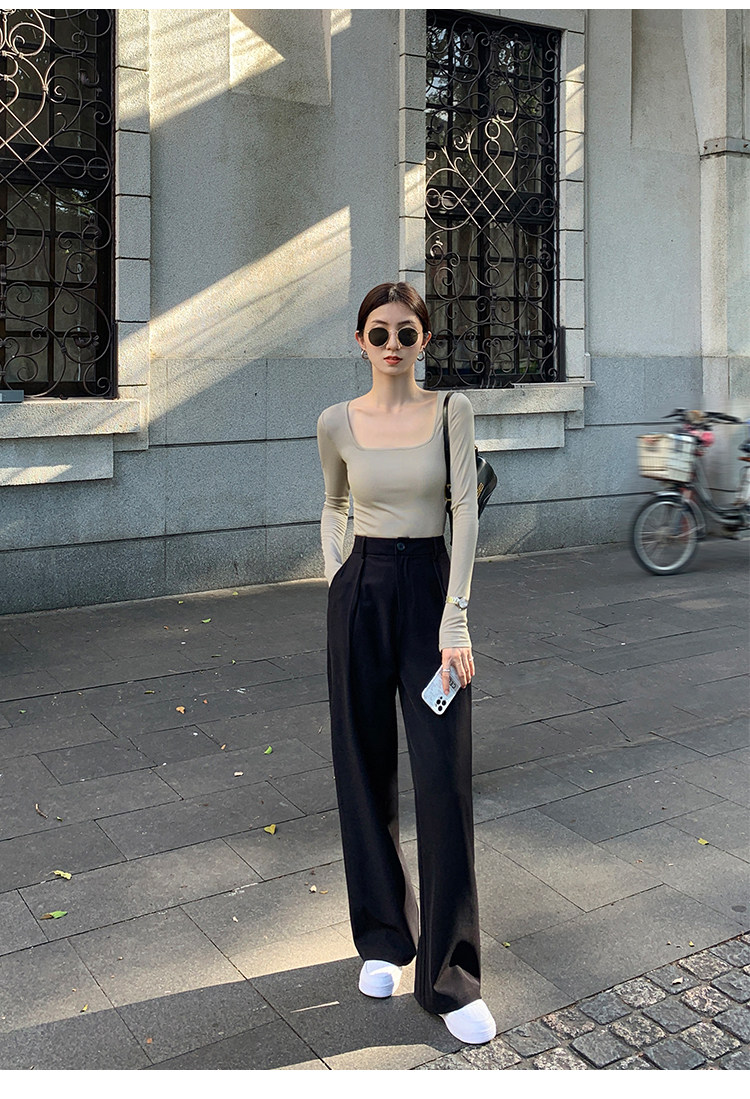 Mulvan Black Square-Neck Long-Sleeve Knit T-Shirt for Women, Autumn and Winter Slim Fit, Slimming, Inner Wear, Collarbone-Exposing Base Shirt Top