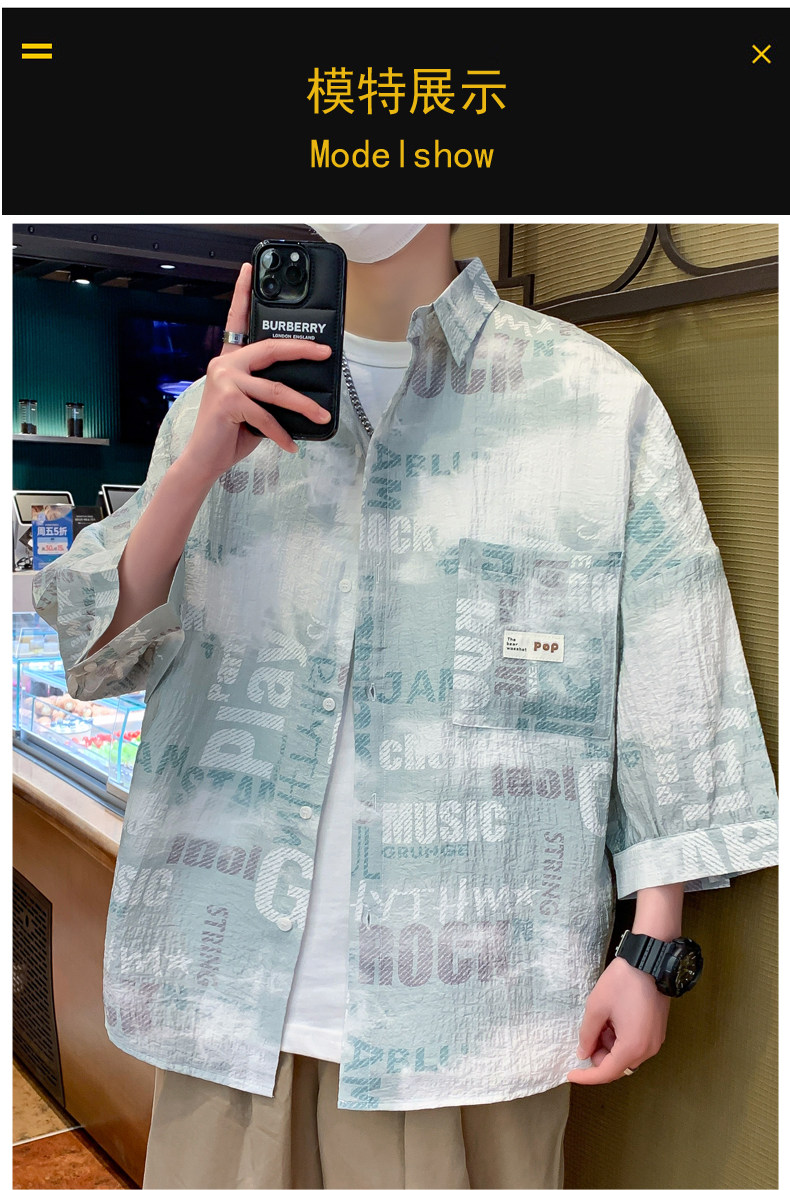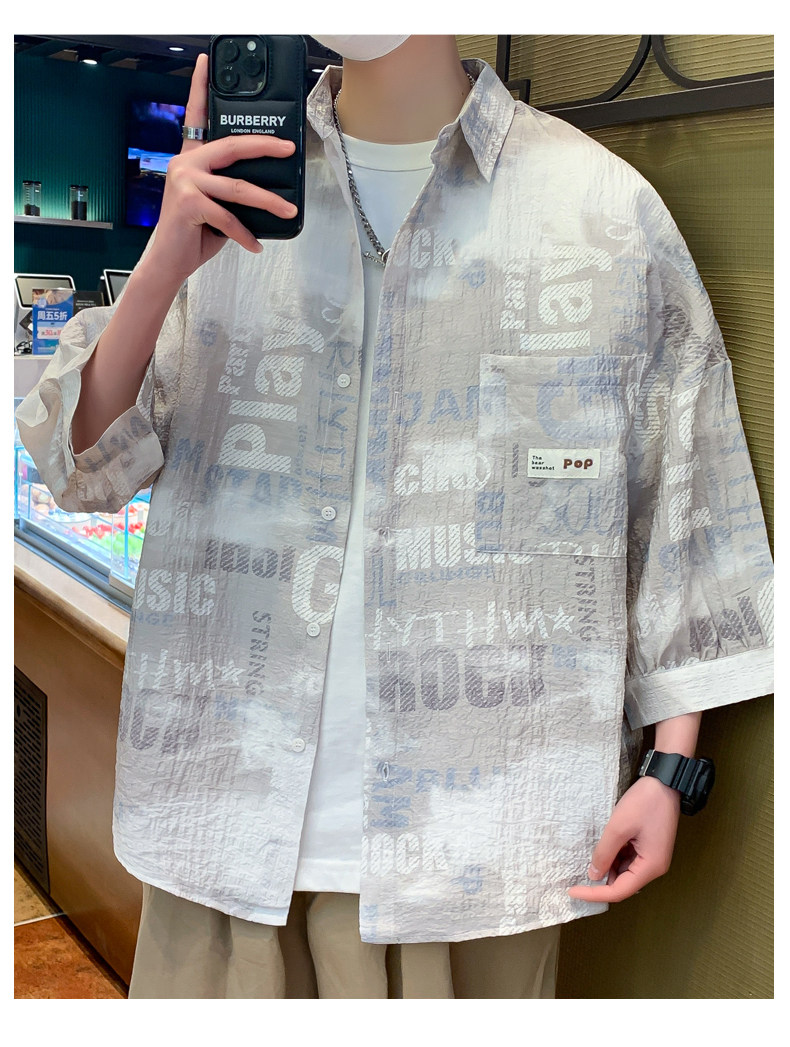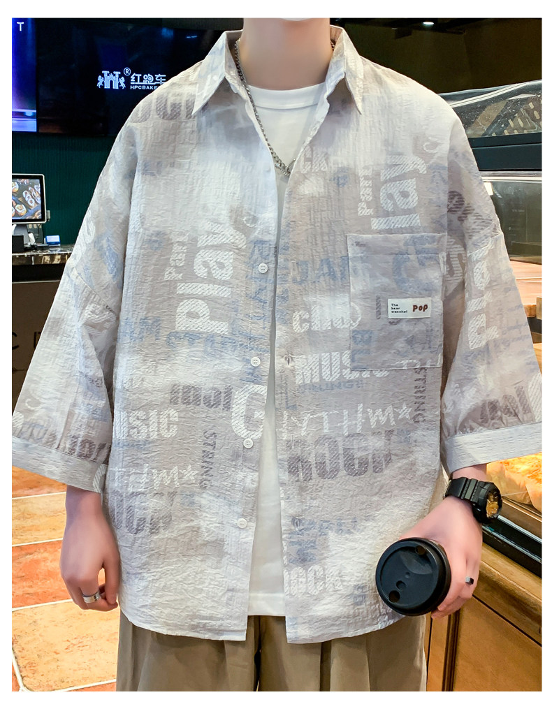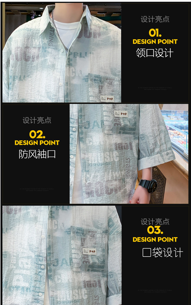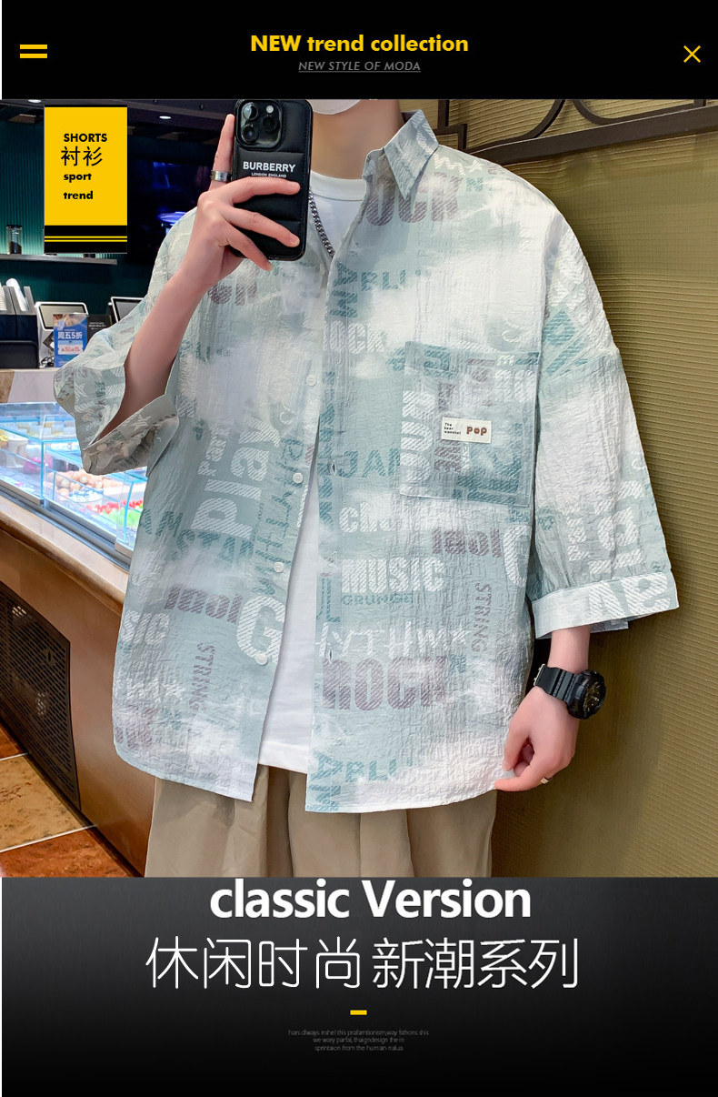 Three-Quarter Sleeve Shirt for Men, Short-Sleeved Summer Trendy Brand, Cool and Stylish Ice Silk Mid-Sleeve Shirt, Youth Sun Protection Jacket