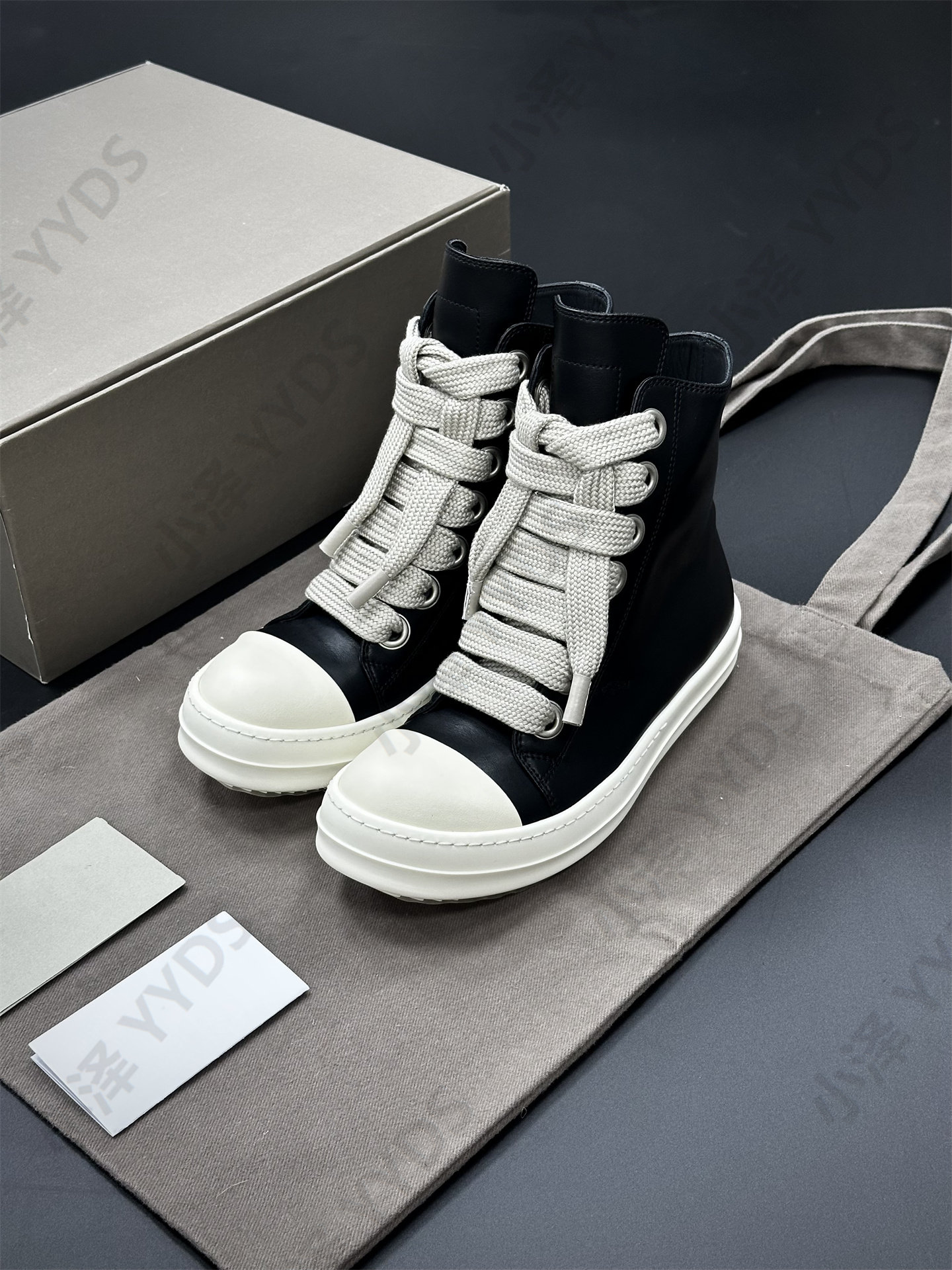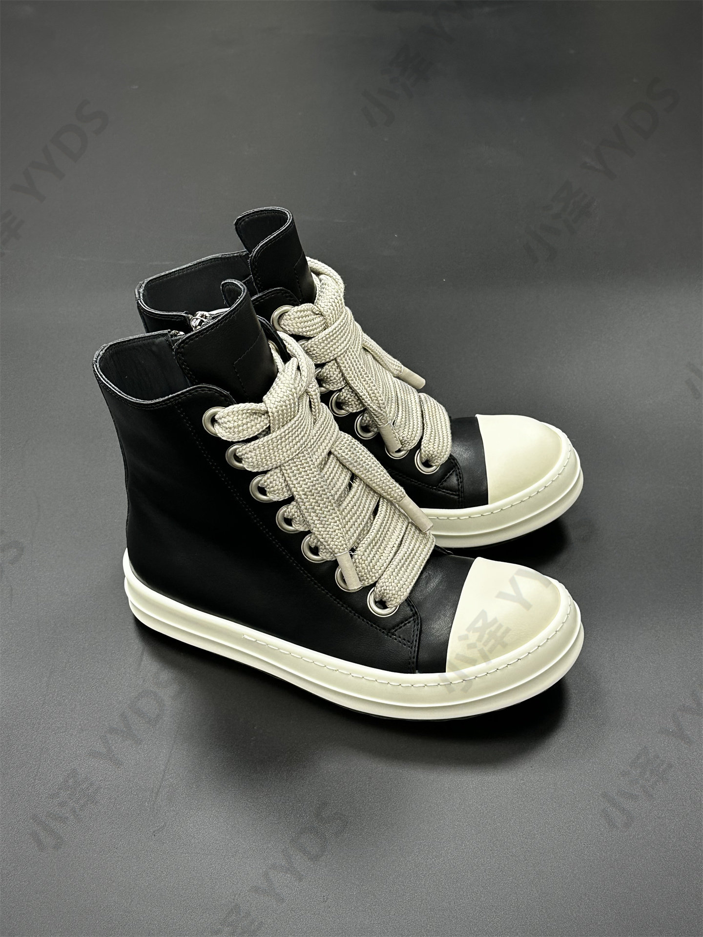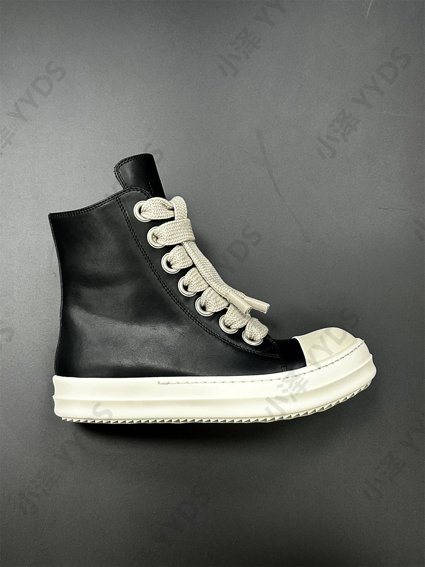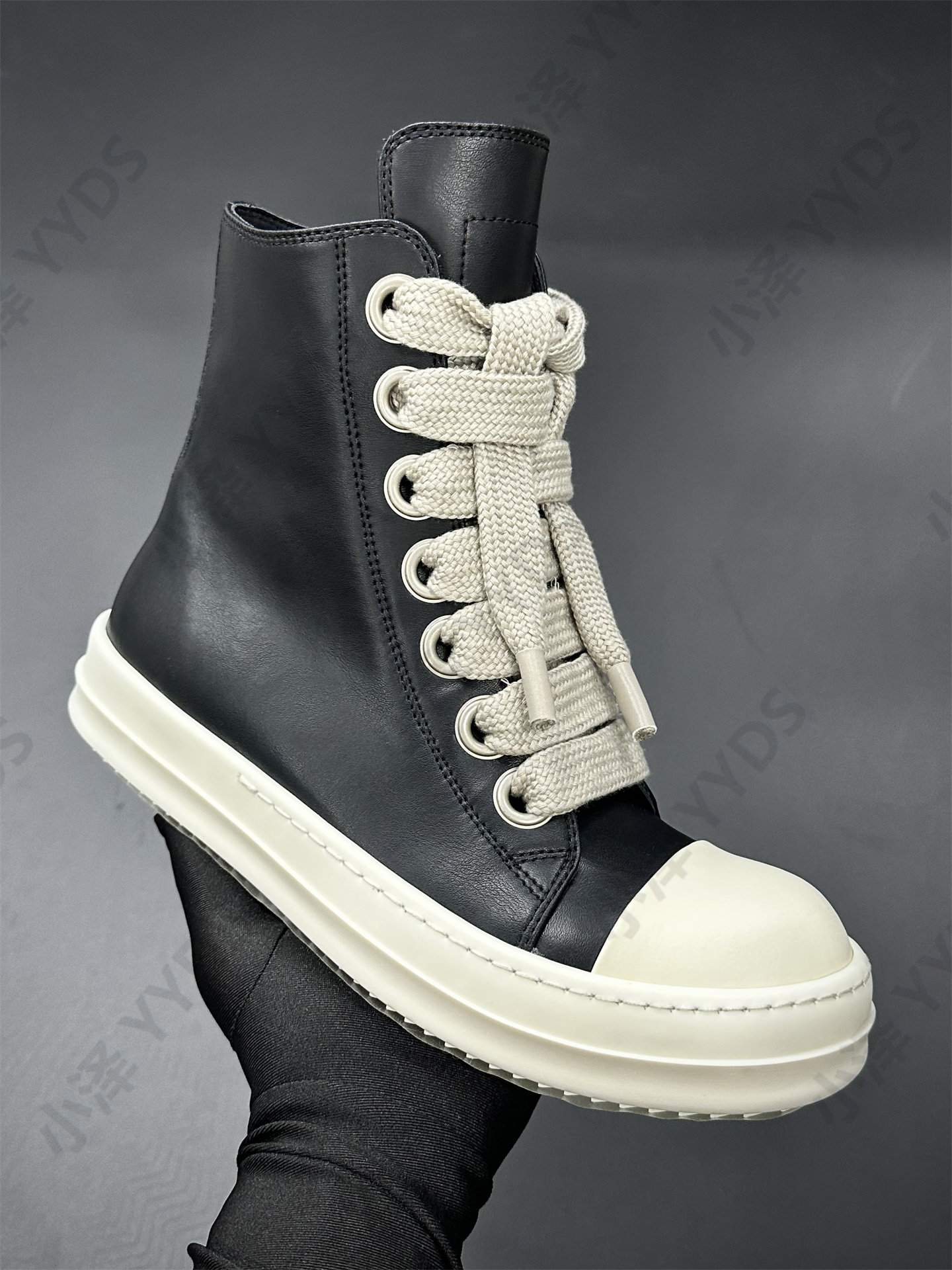 Rick Ocean Ro Independent Main Line Leather Upper, Secondary Line Canvas, Milky White Sole, Thick Shoelaces, Black and White High Street High-Top Shoes