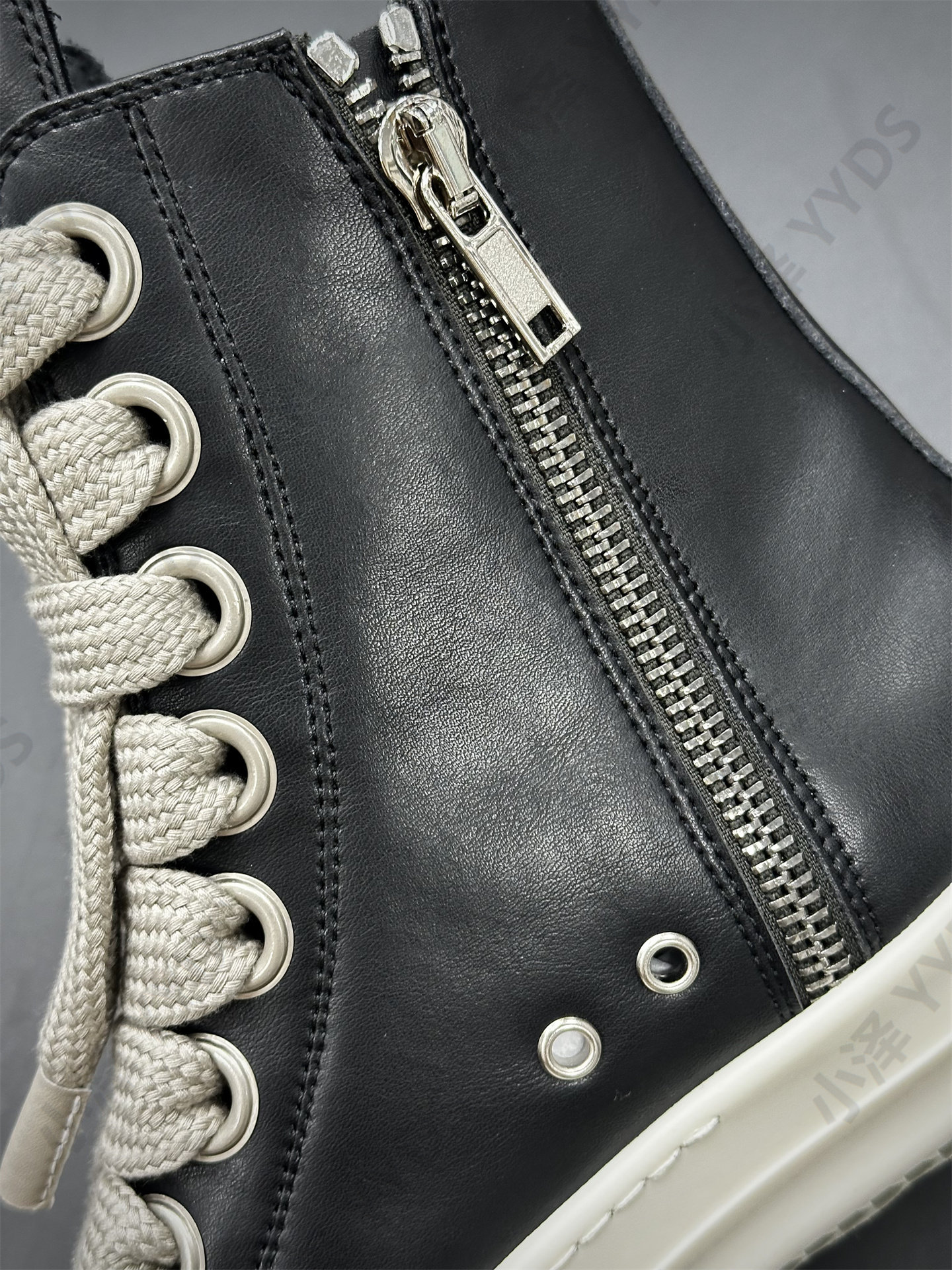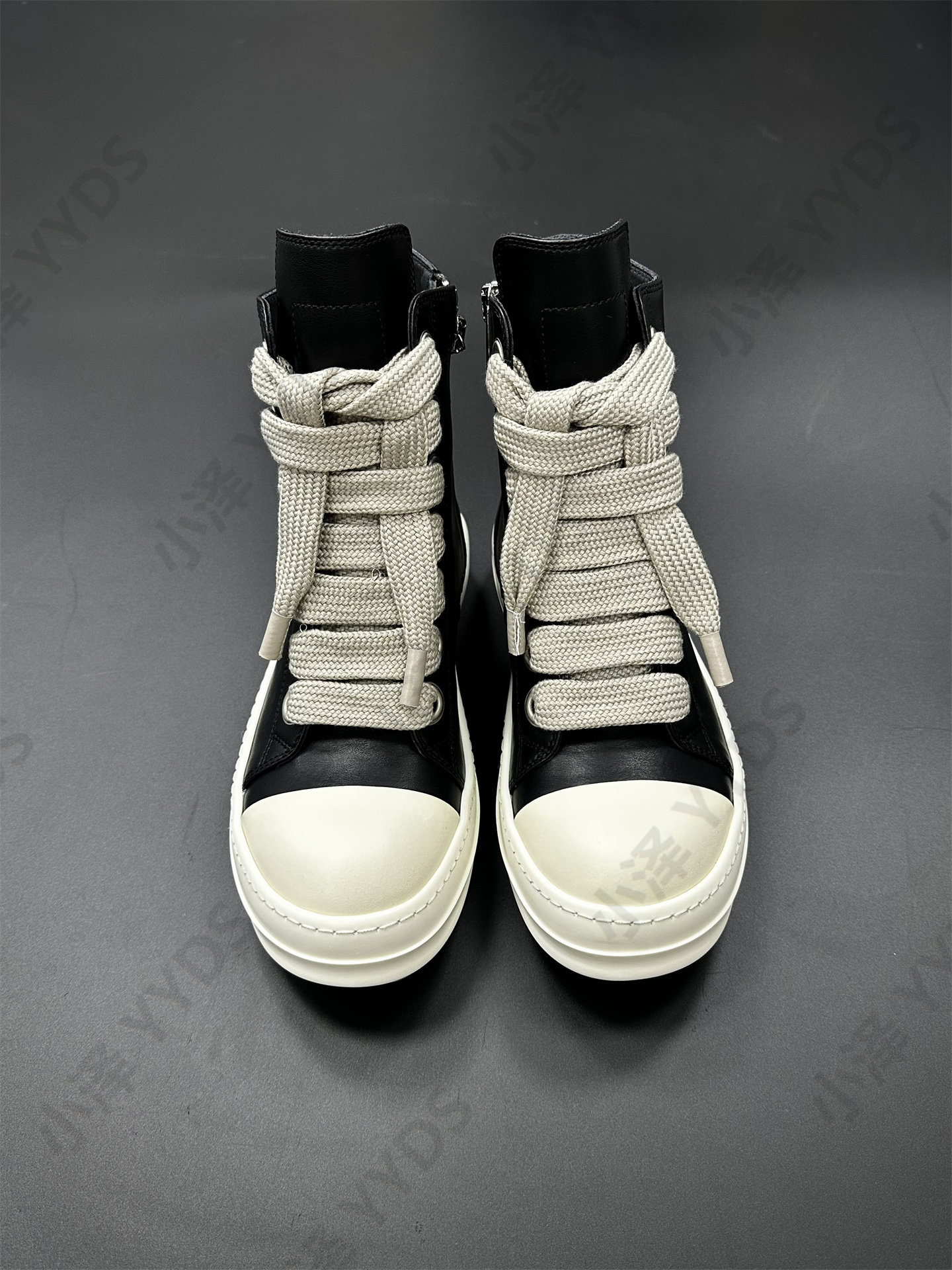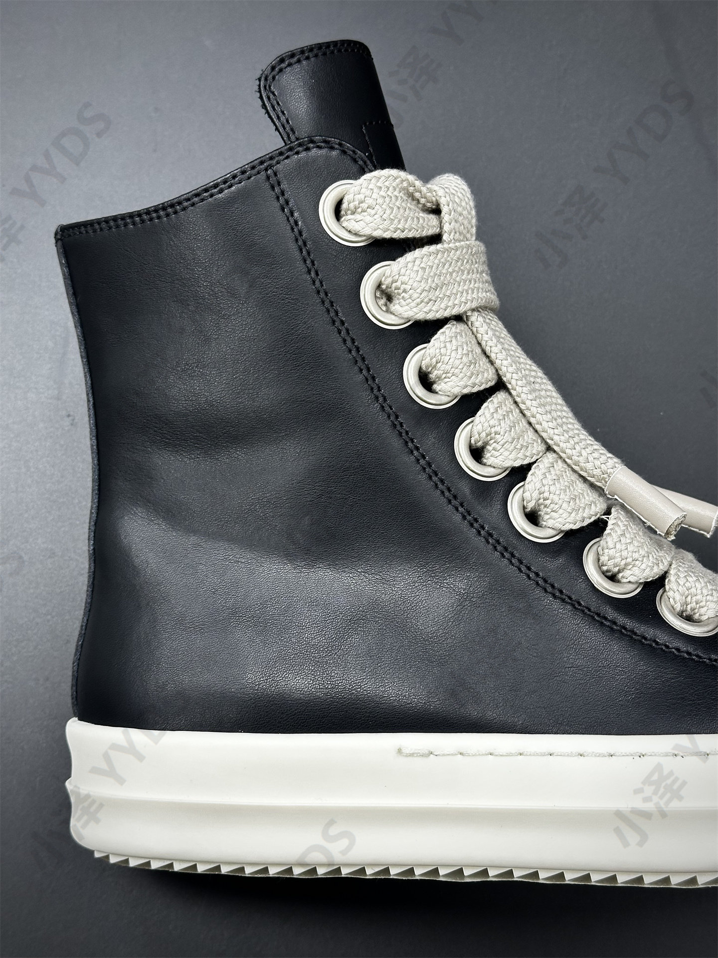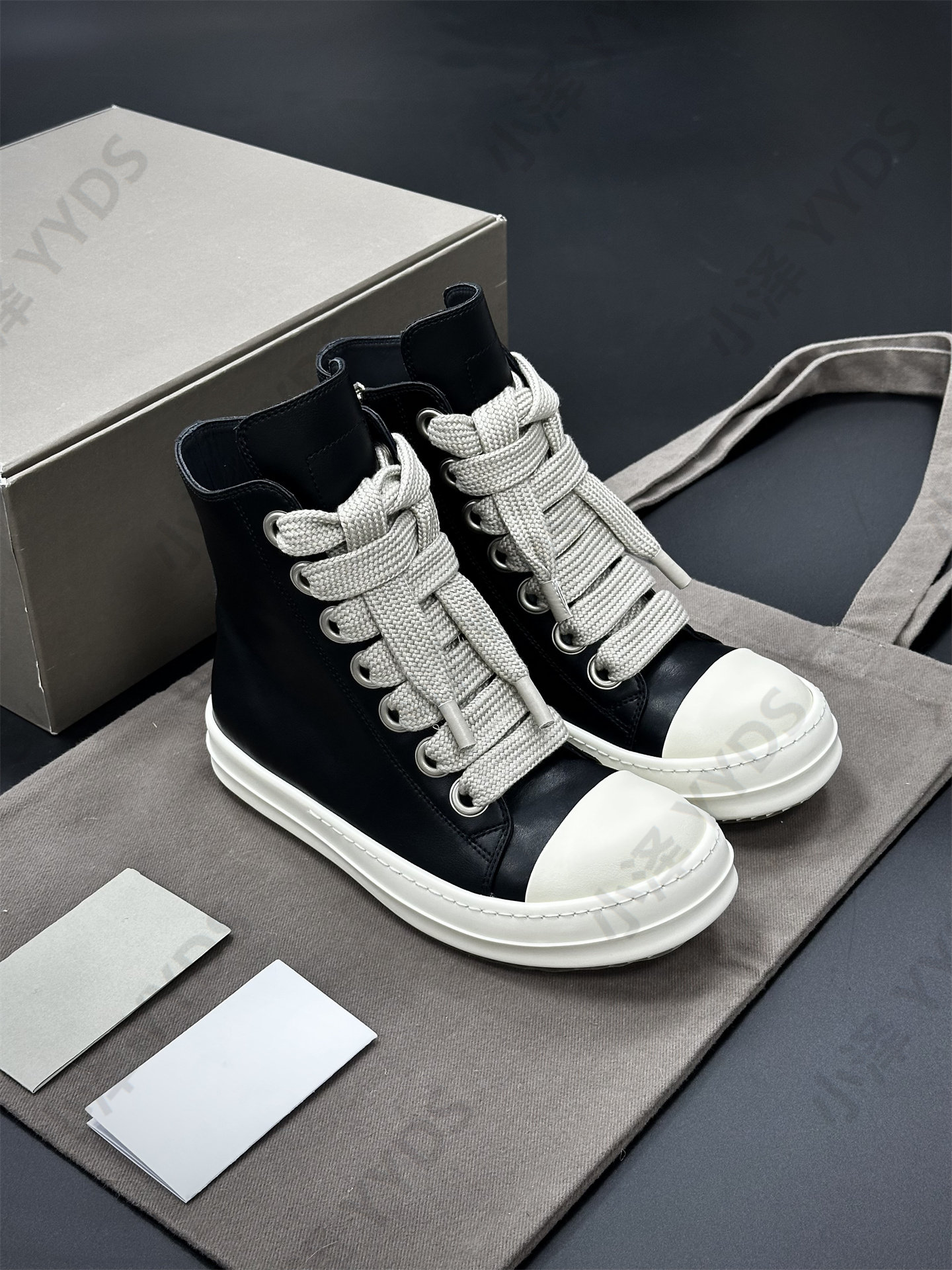 Rick Ocean Ro Independent Main Line Leather Upper, Secondary Line Canvas, Milky White Sole, Thick Shoelaces, Black and White High Street High-Top Shoes