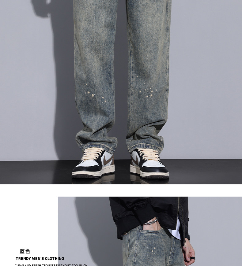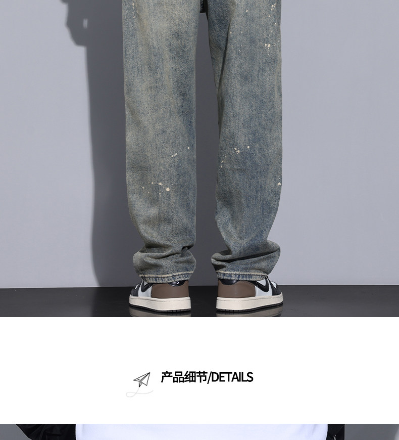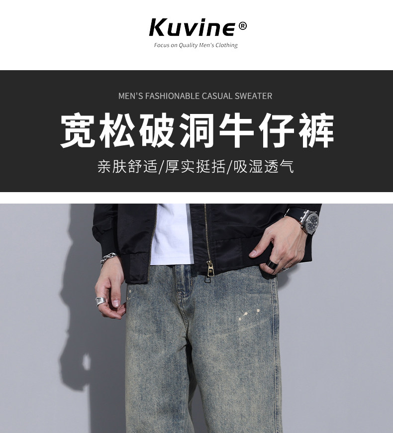Kuvine Autumn and Winter American High Street Retro Splatter Denim Jeans for Men, Fleece-Lined, Loose Straight Wide-Leg Long Pants