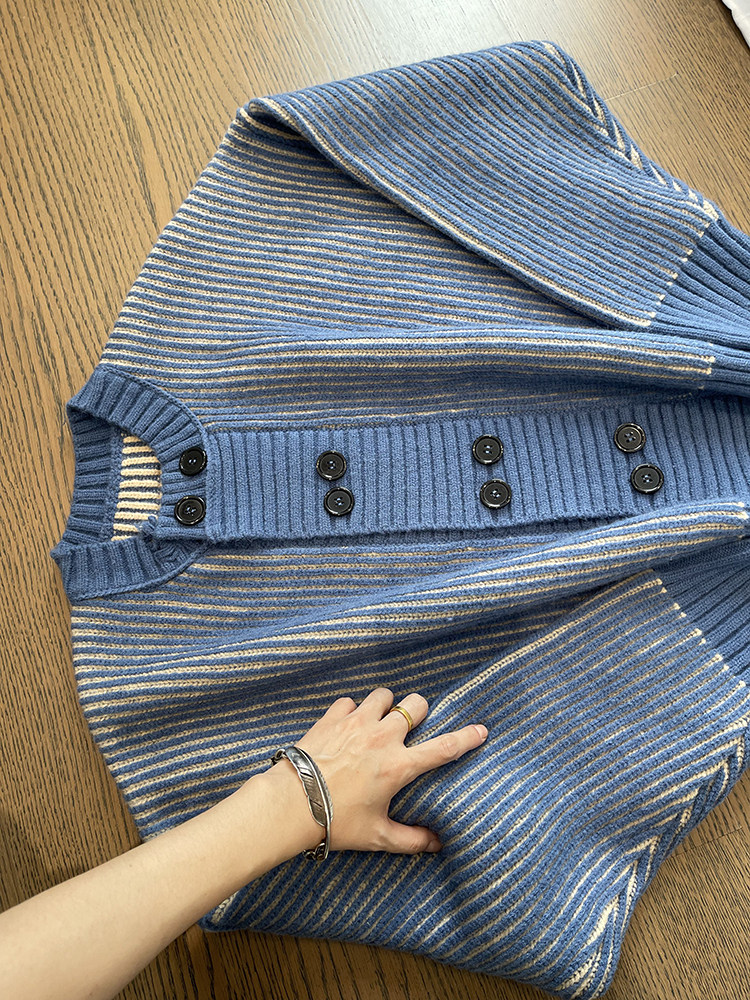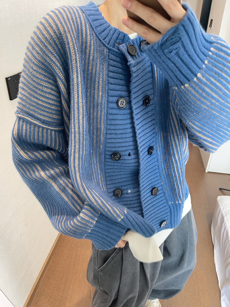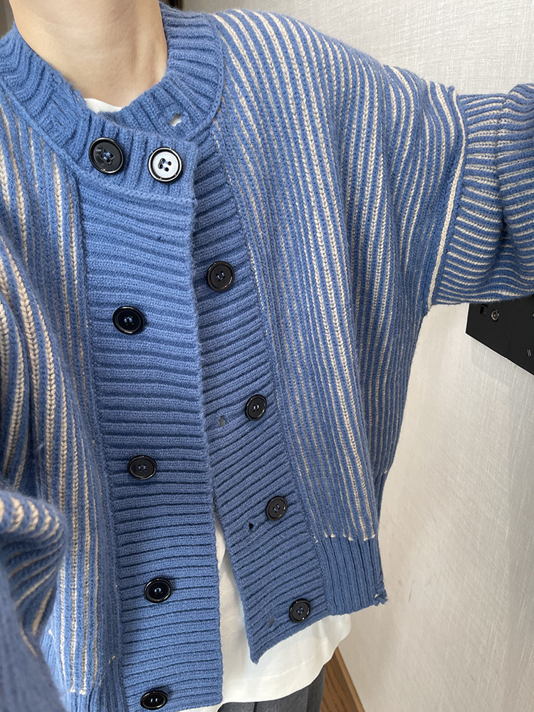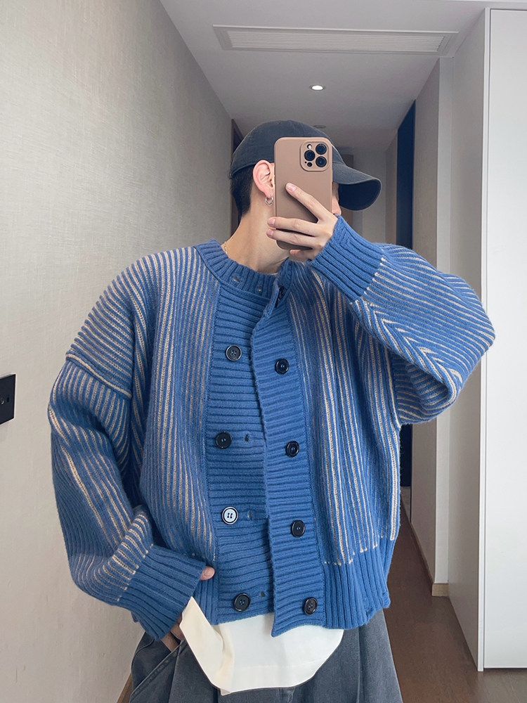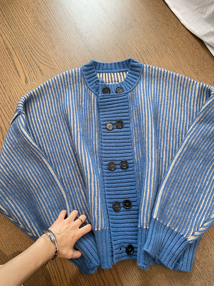 重磅粗条纹双排扣毛衣外套
