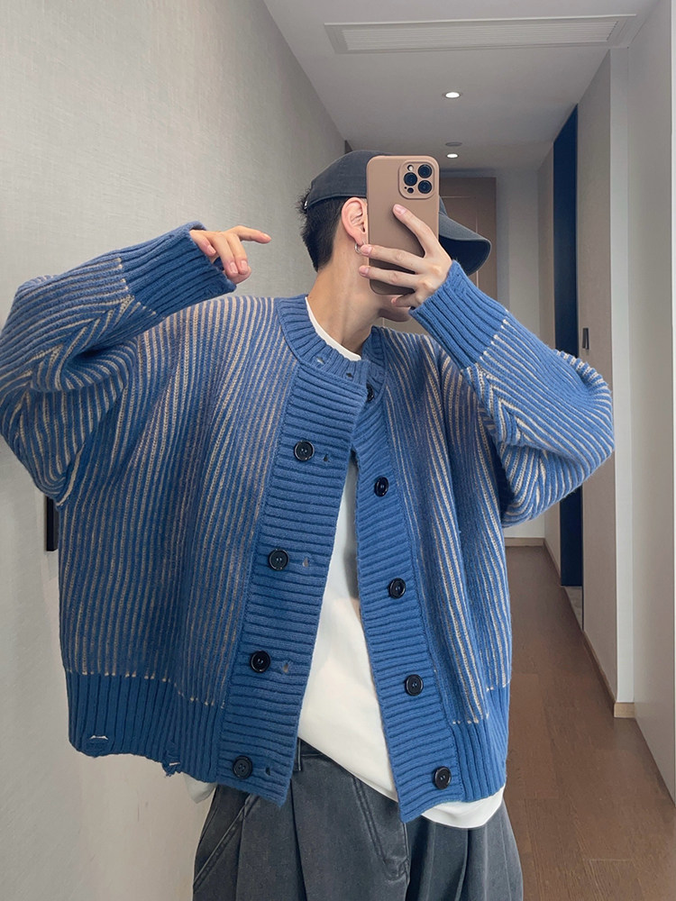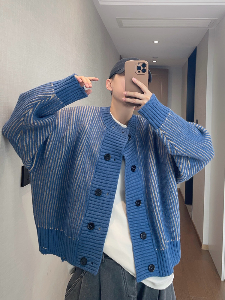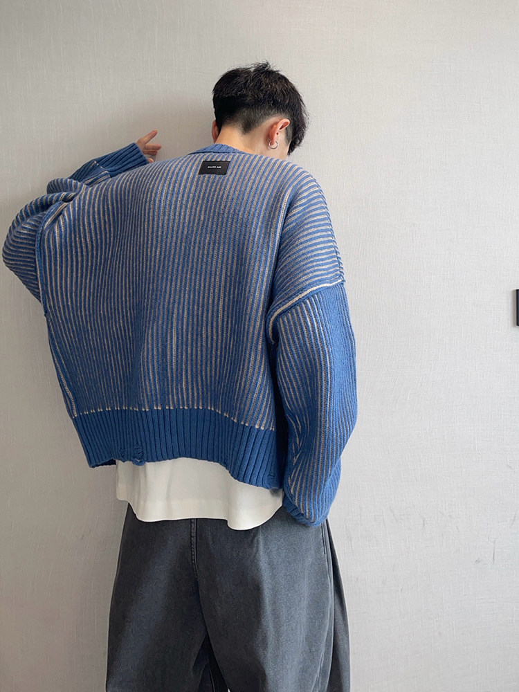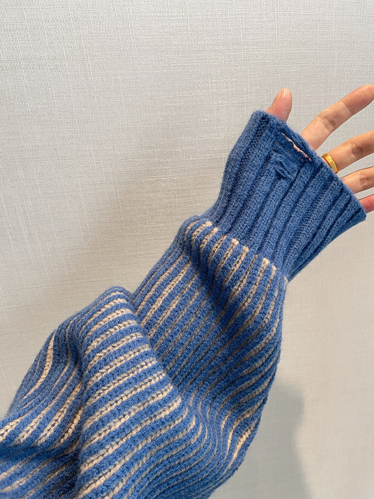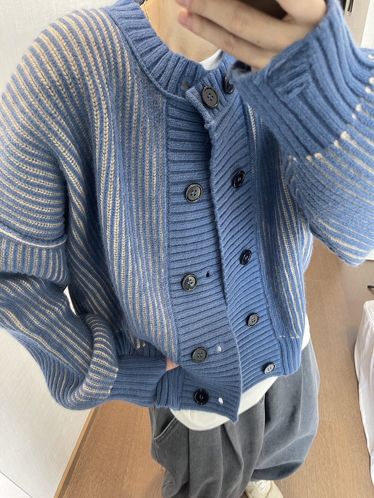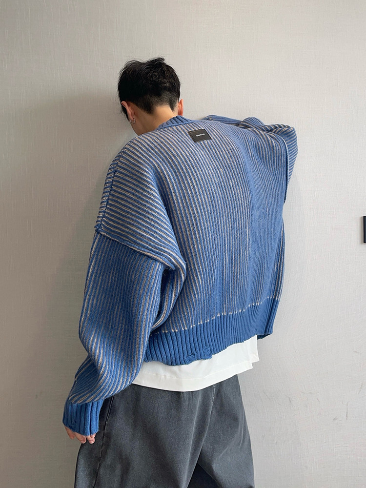 重磅粗条纹双排扣毛衣外套