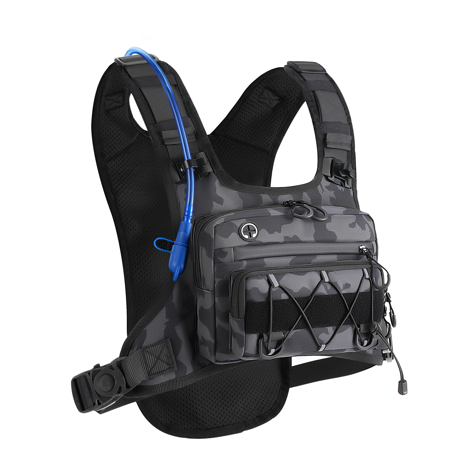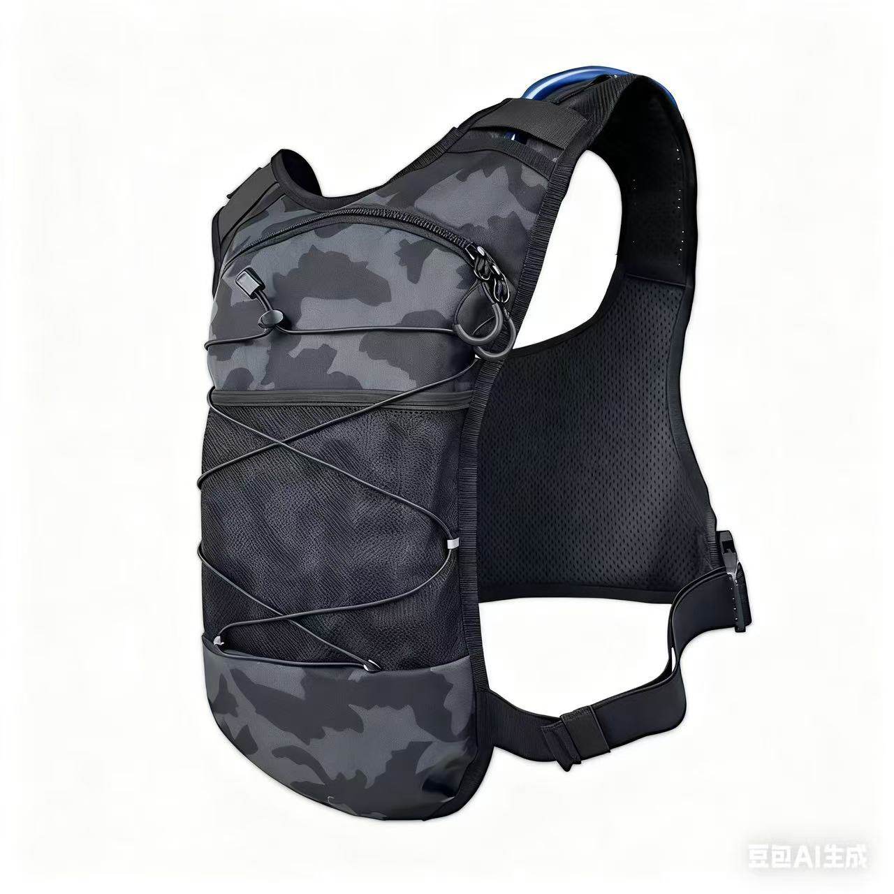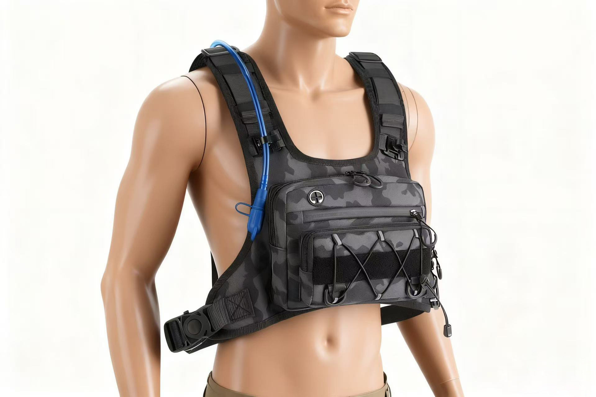 这是一款新款战术胸包 后面有水袋背包。水袋背包专为户外运动设计,内置可装水的水袋,配备吸管,方便运动者在行进中随时补水。它的背负系统贴合人体背部,能分散重量,减轻肩部负担。背包还有多个储物空间,可存放手机、钥匙、能量补给等小物件,且采用轻便、耐磨的材料制作,适合跑步、骑行、徒步等多种户外场景,为户外运动爱好者提供便利的饮水和储物解决方案。前面绳子可以挂登山杖