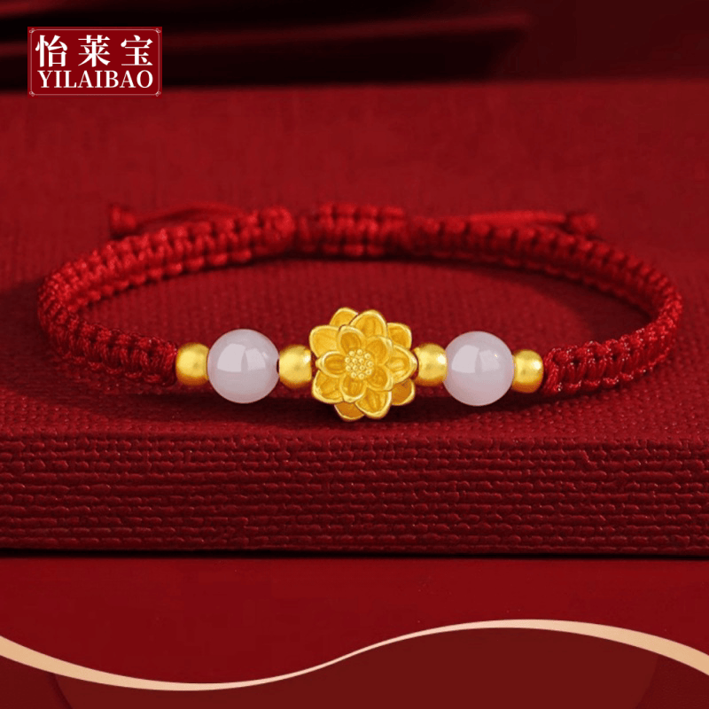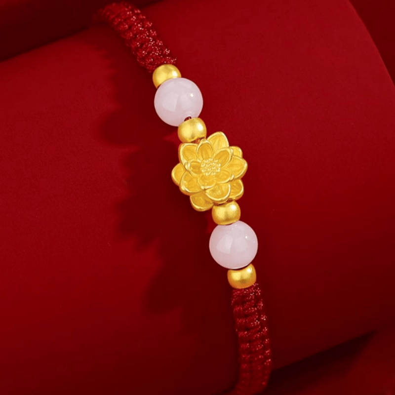 Gold Lotus Bracelet for Women 999 Pure Gold Peach Blossom Fortune Bead Flower Birth Year Braided Red String Holiday Gift