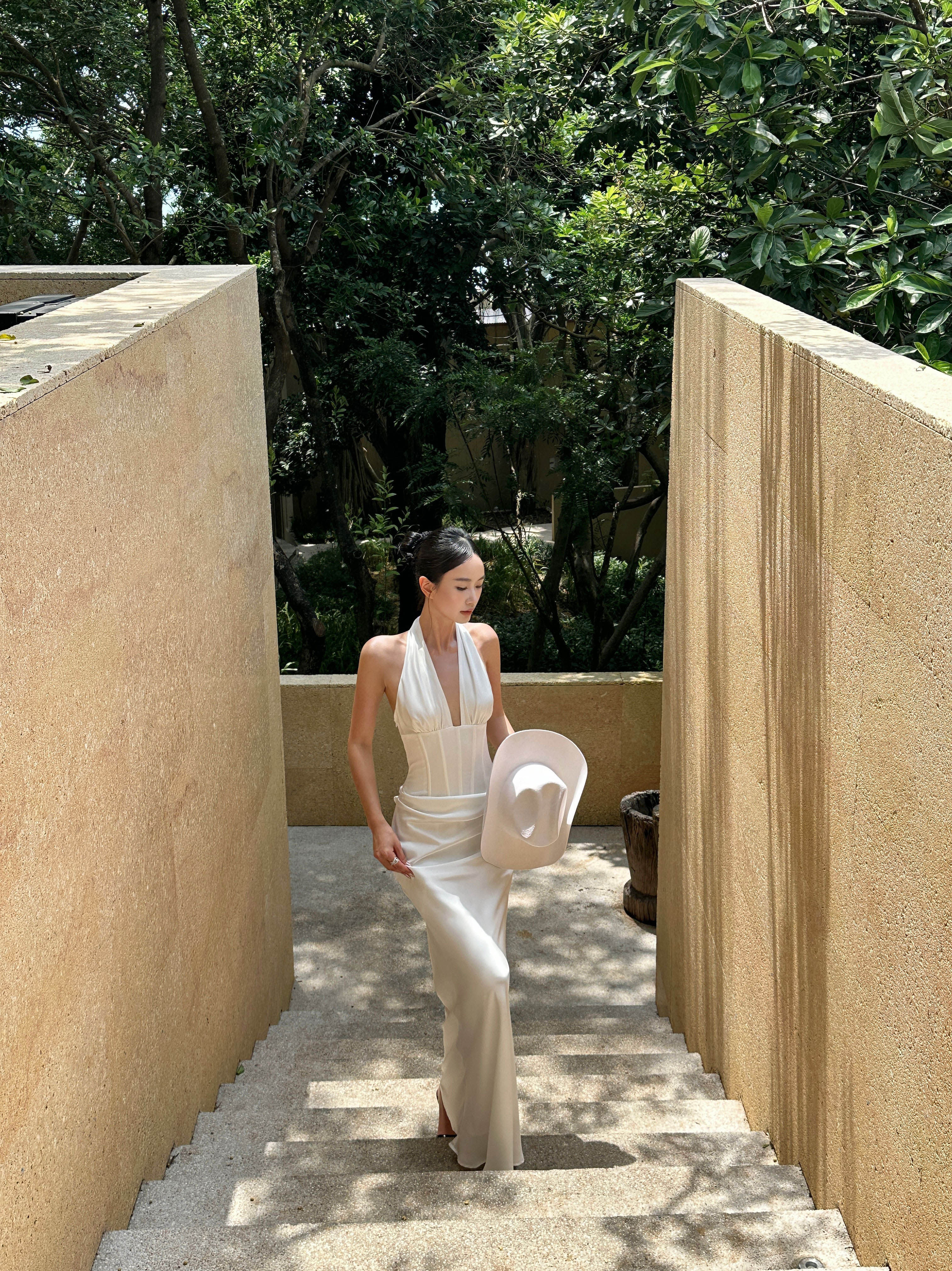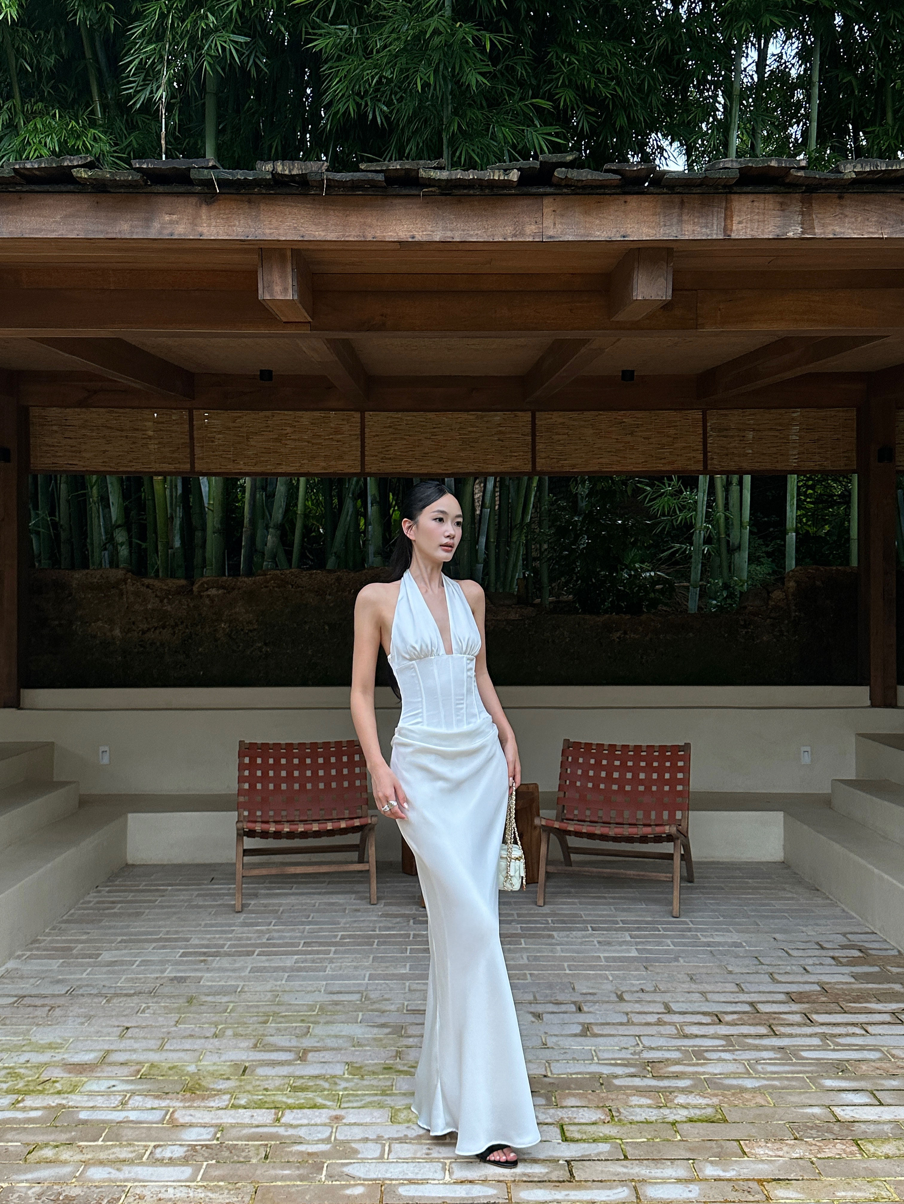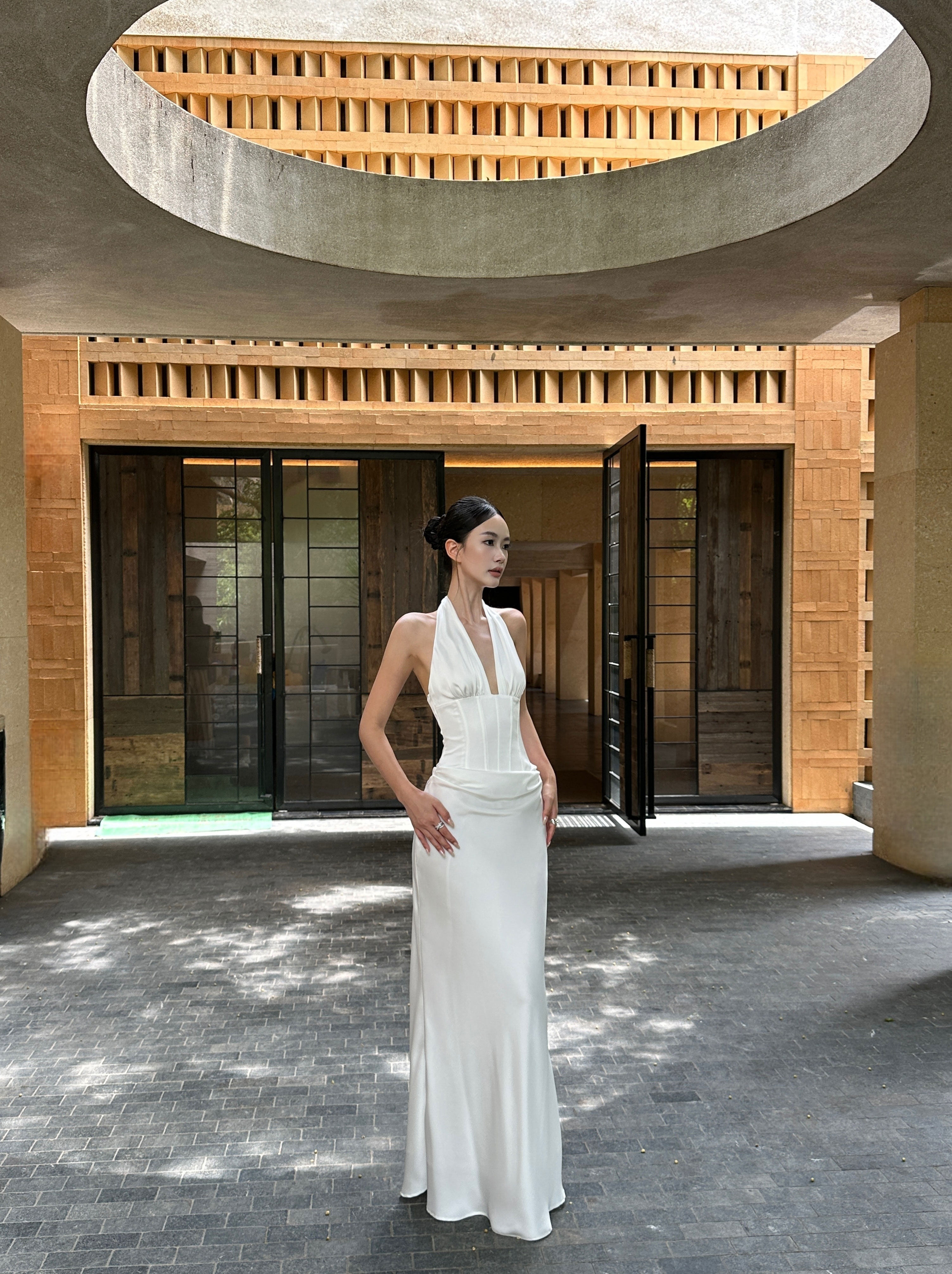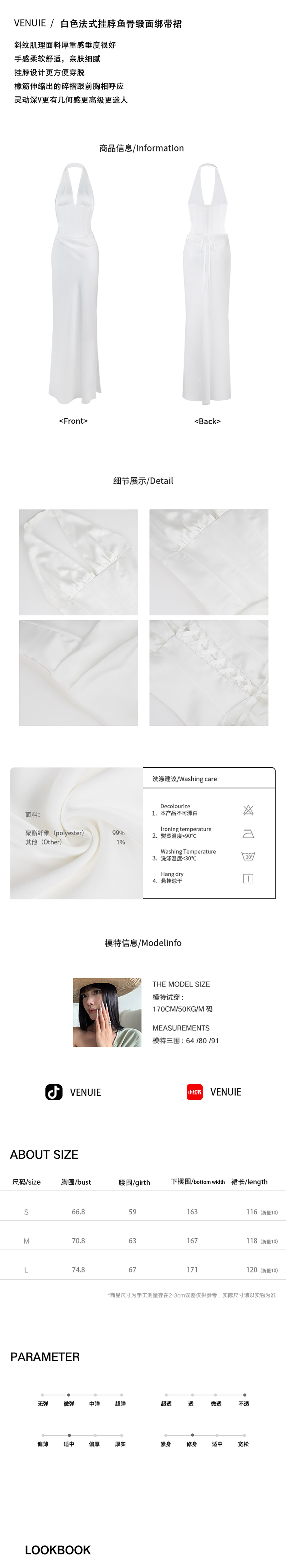 Venuie French-Style White Halter Neck Dress with V-Neck, Fishbone Satin, Unique Design, High-End Feel, Backless Long Dress