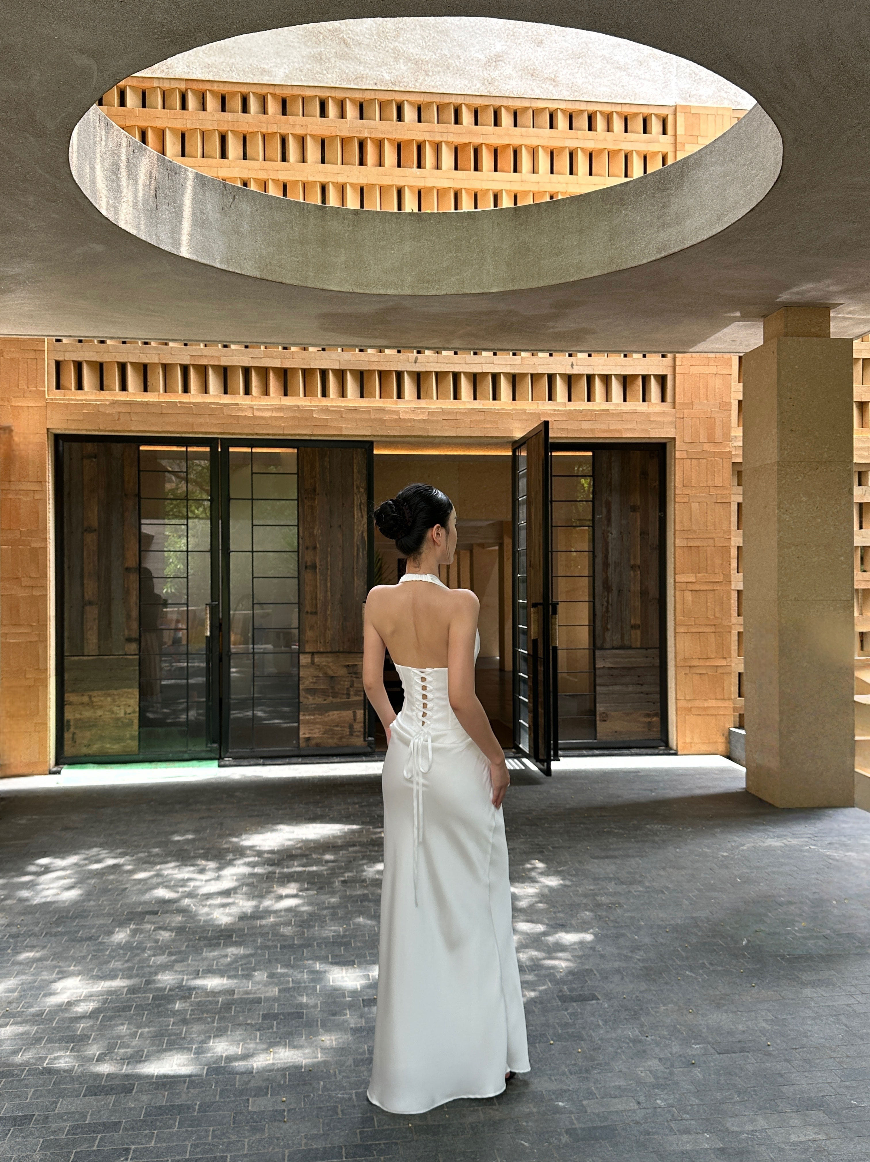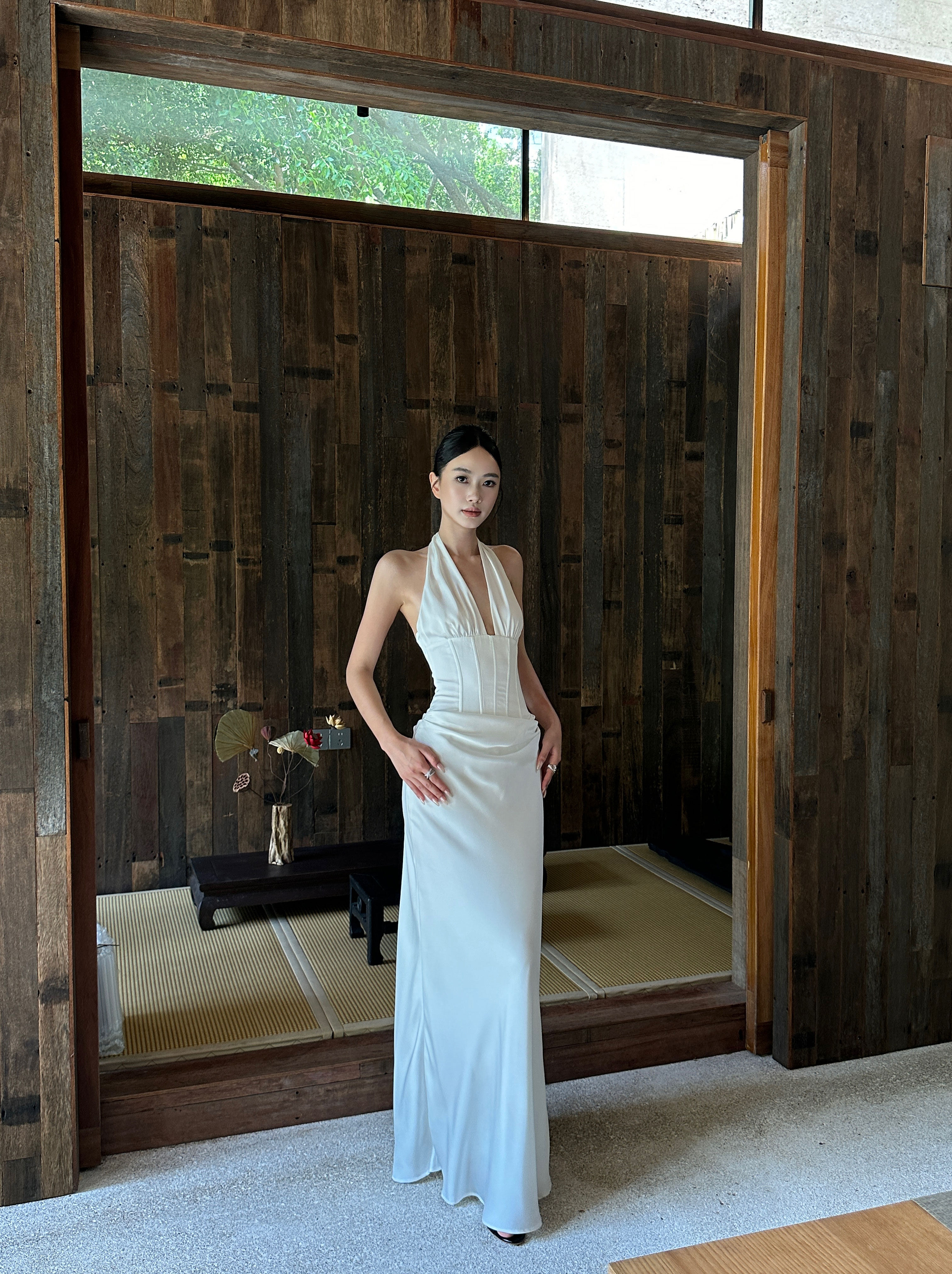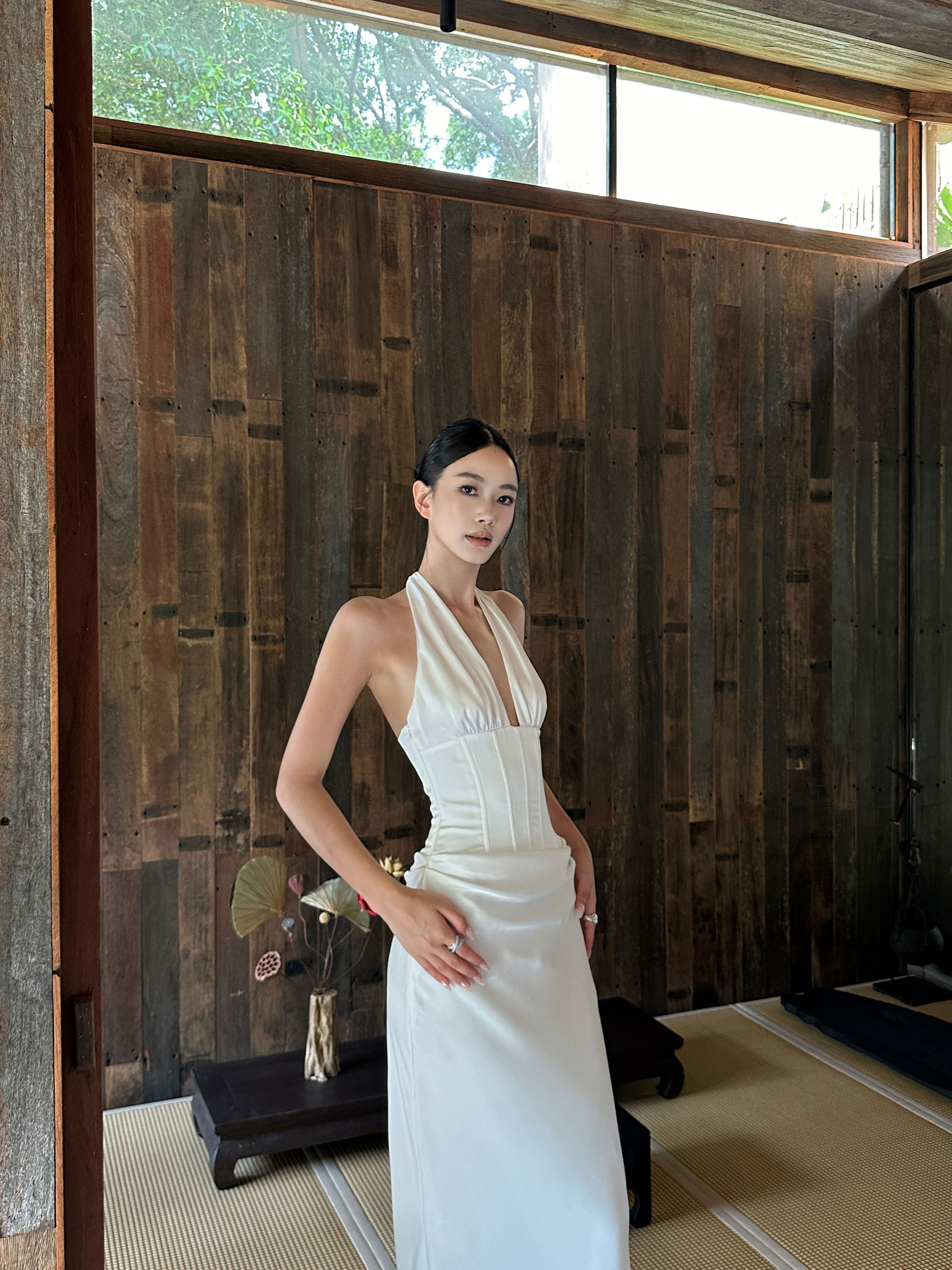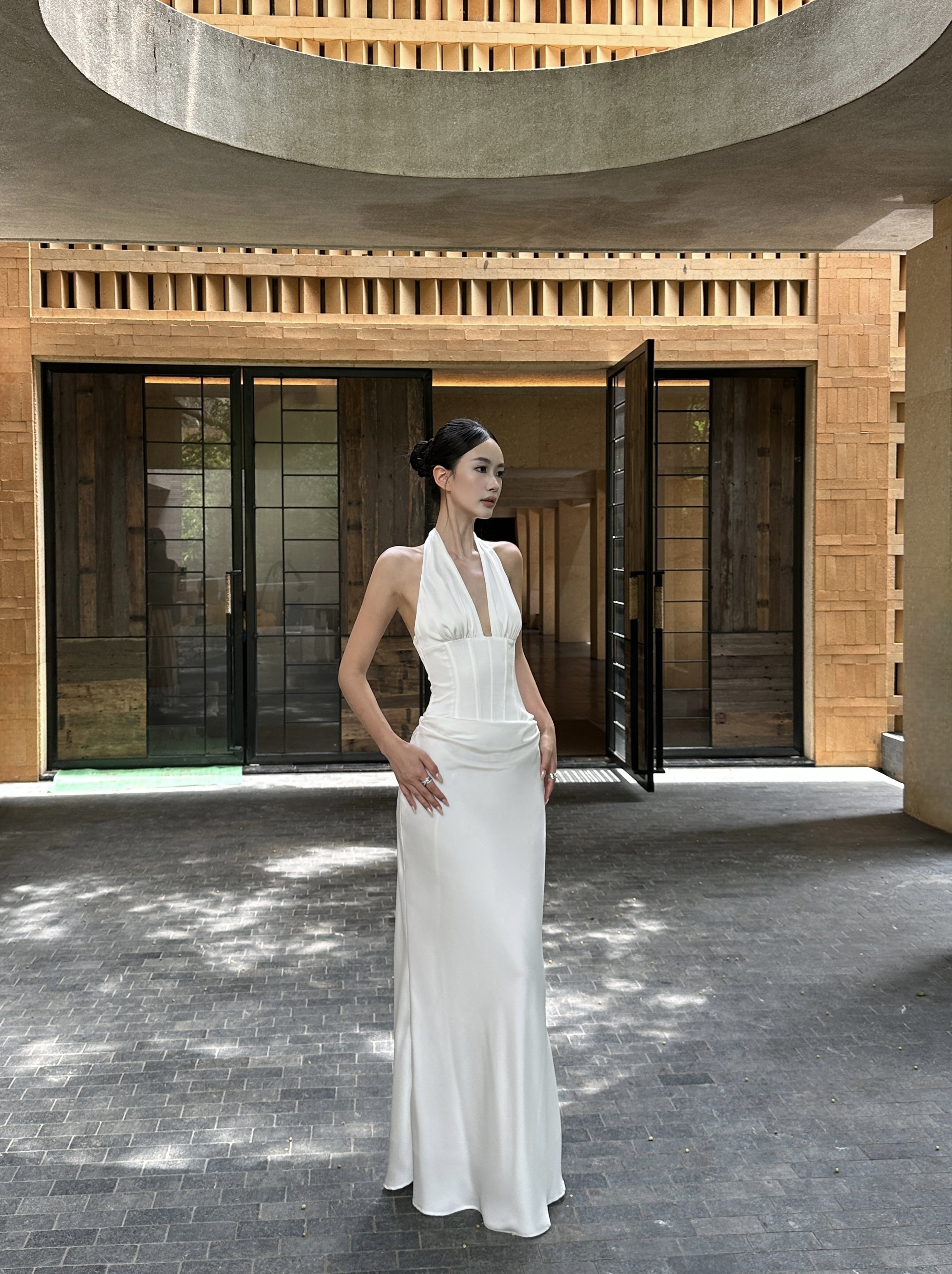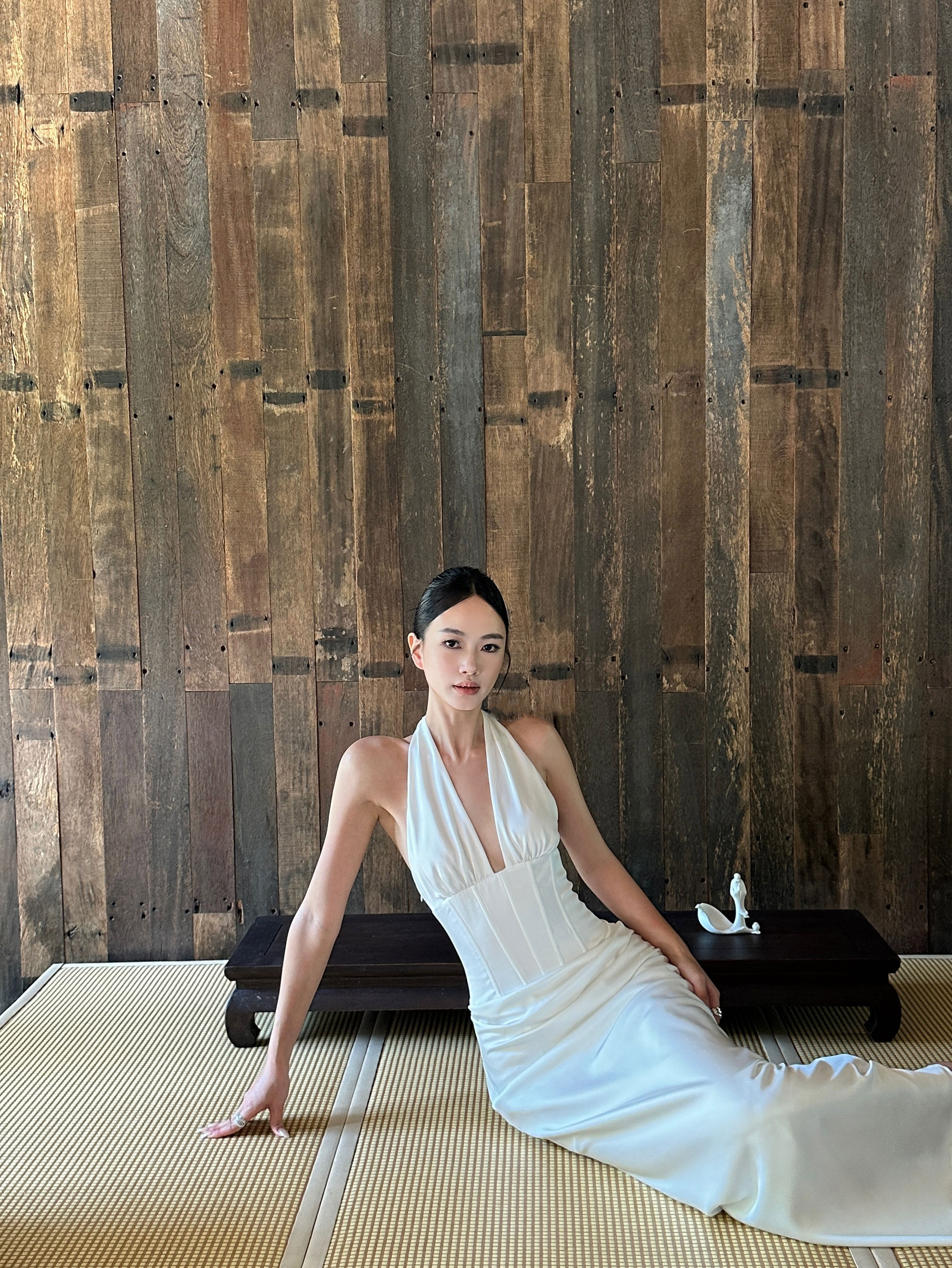 Venuie French-Style White Halter Neck Dress with V-Neck, Fishbone Satin, Unique Design, High-End Feel, Backless Long Dress