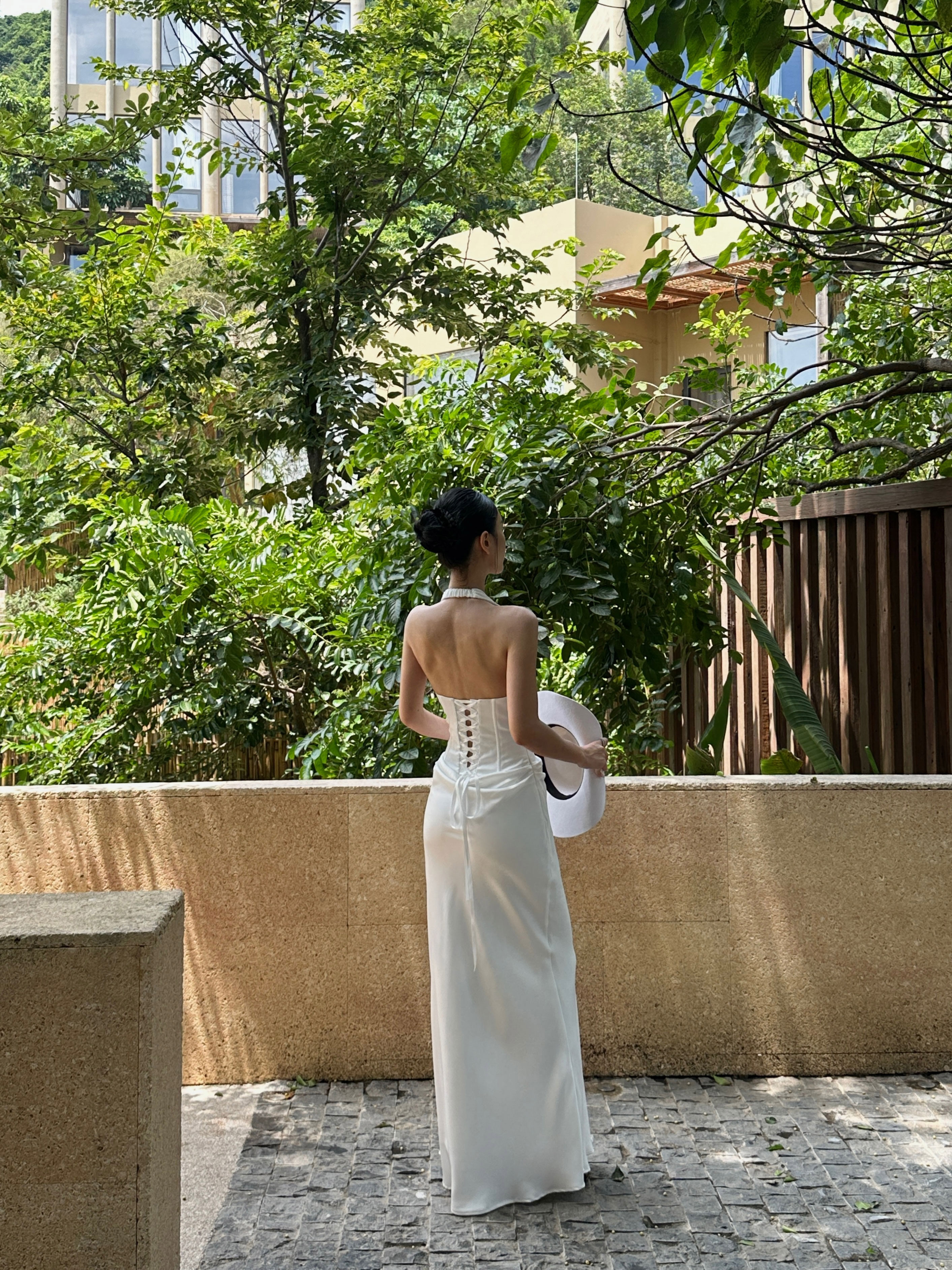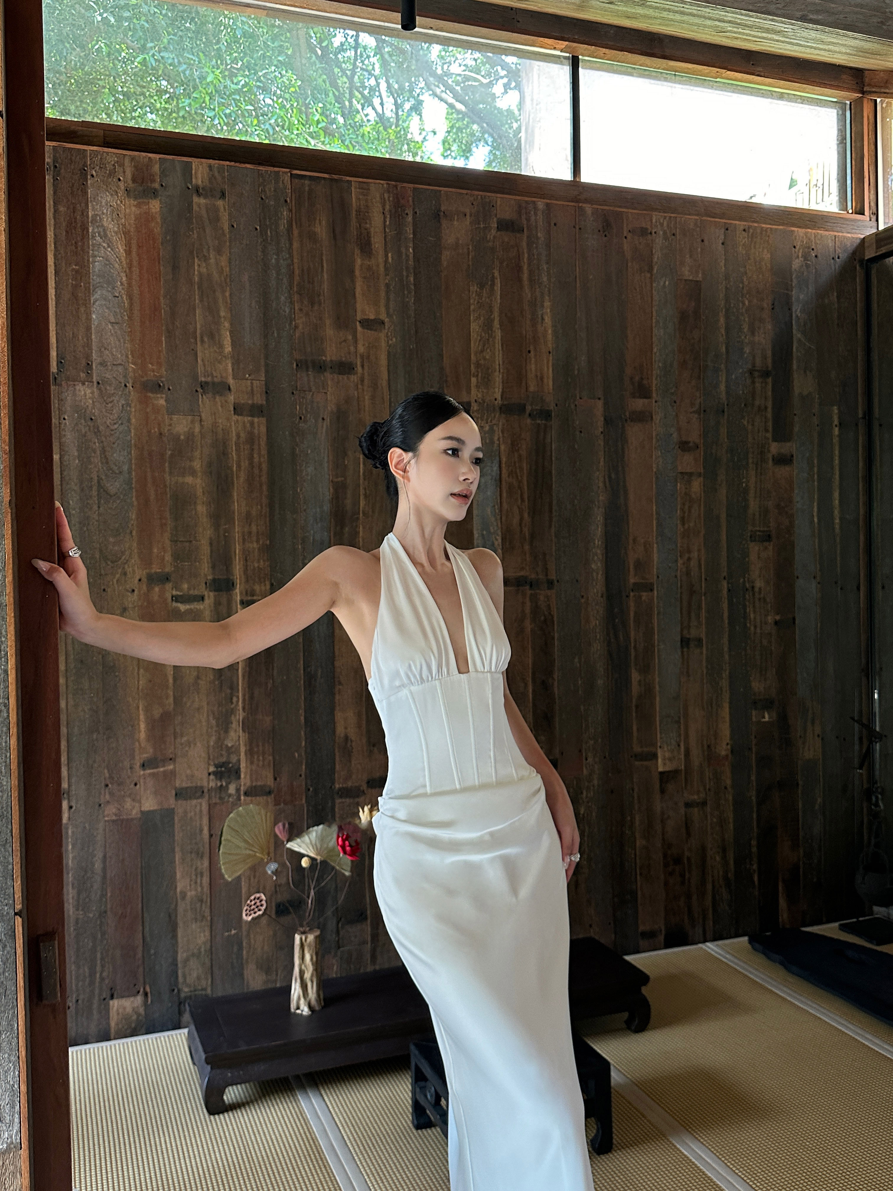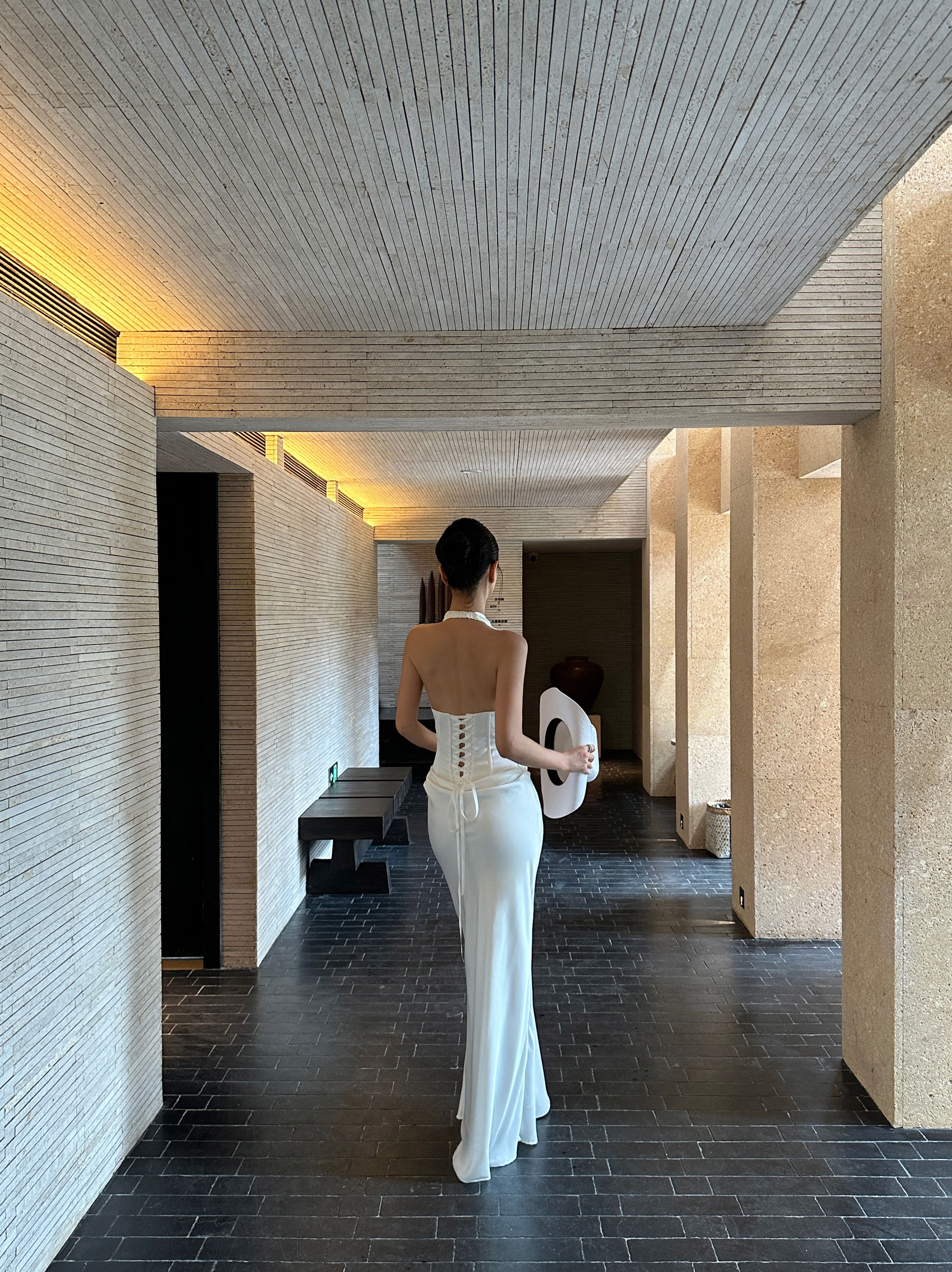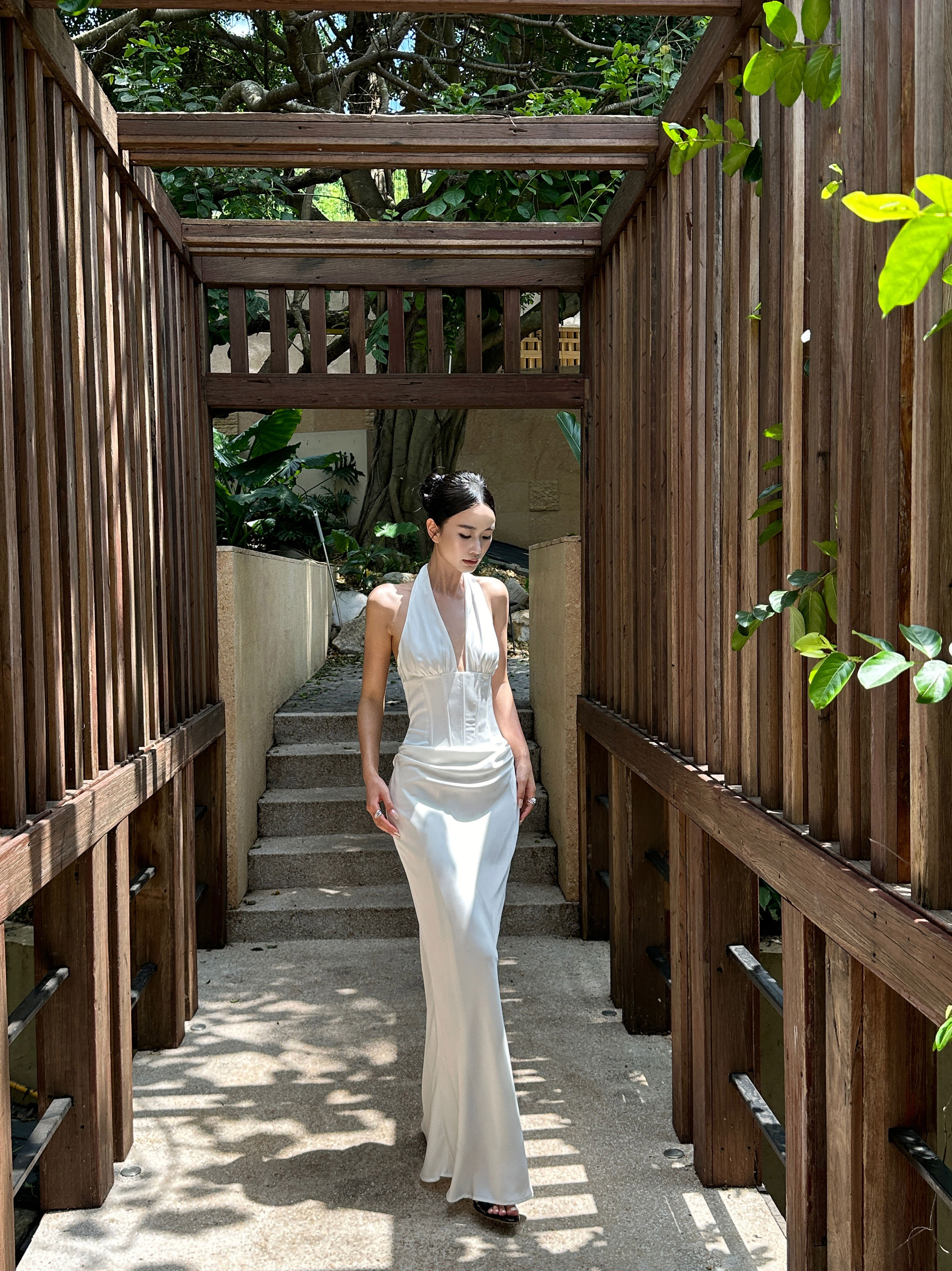 Venuie French-Style White Halter Neck Dress with V-Neck, Fishbone Satin, Unique Design, High-End Feel, Backless Long Dress