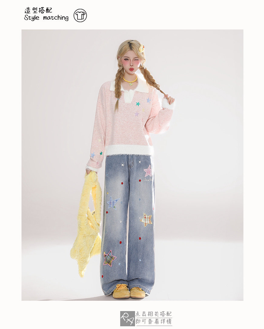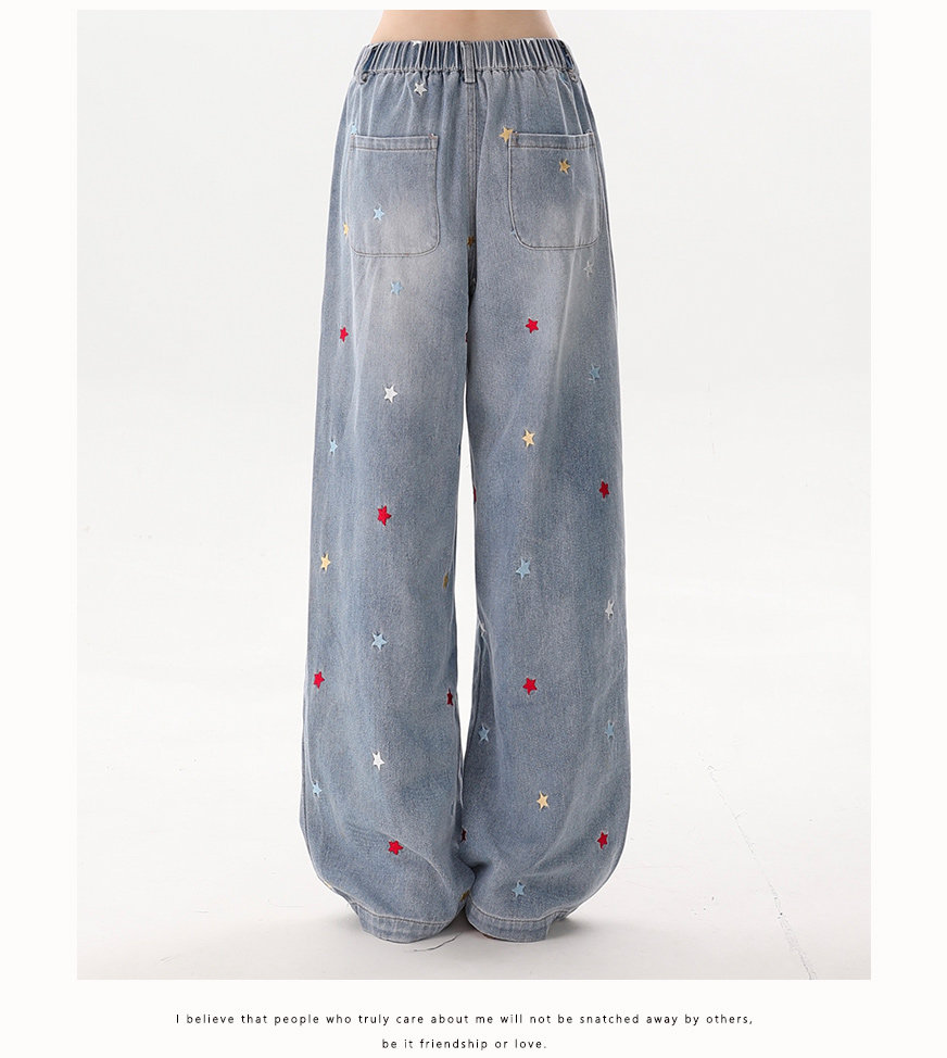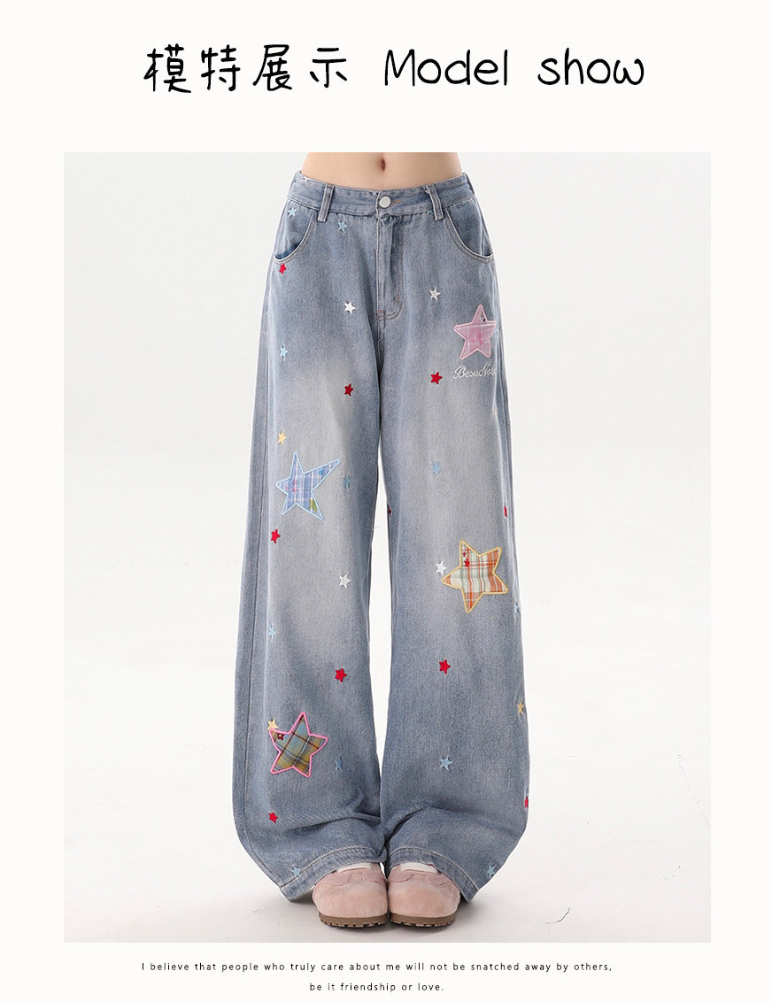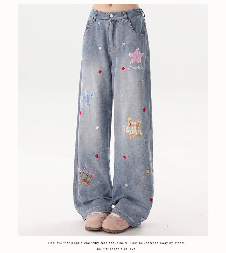 Rayohopp Star Patch Jeans for Women, New Autumn and Winter Pants, Fleece-Lined, Thickened, Loose, Versatile Wide-Leg Trousers