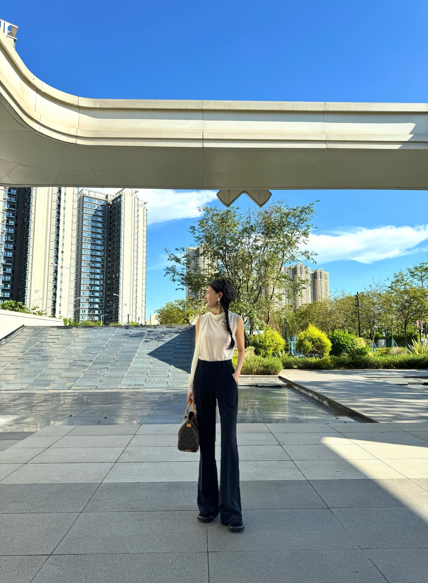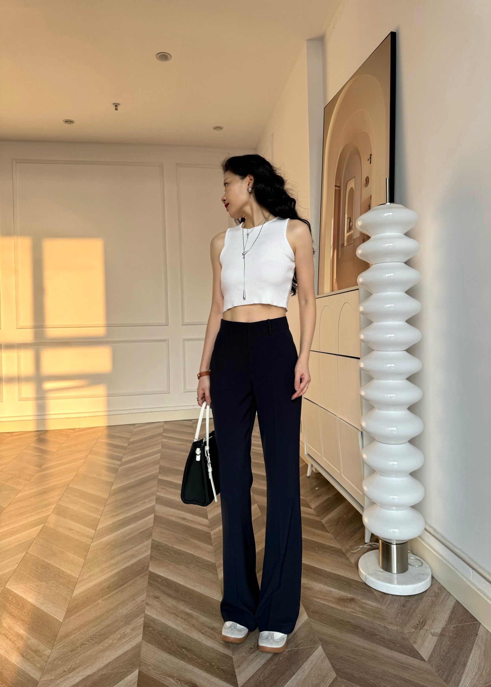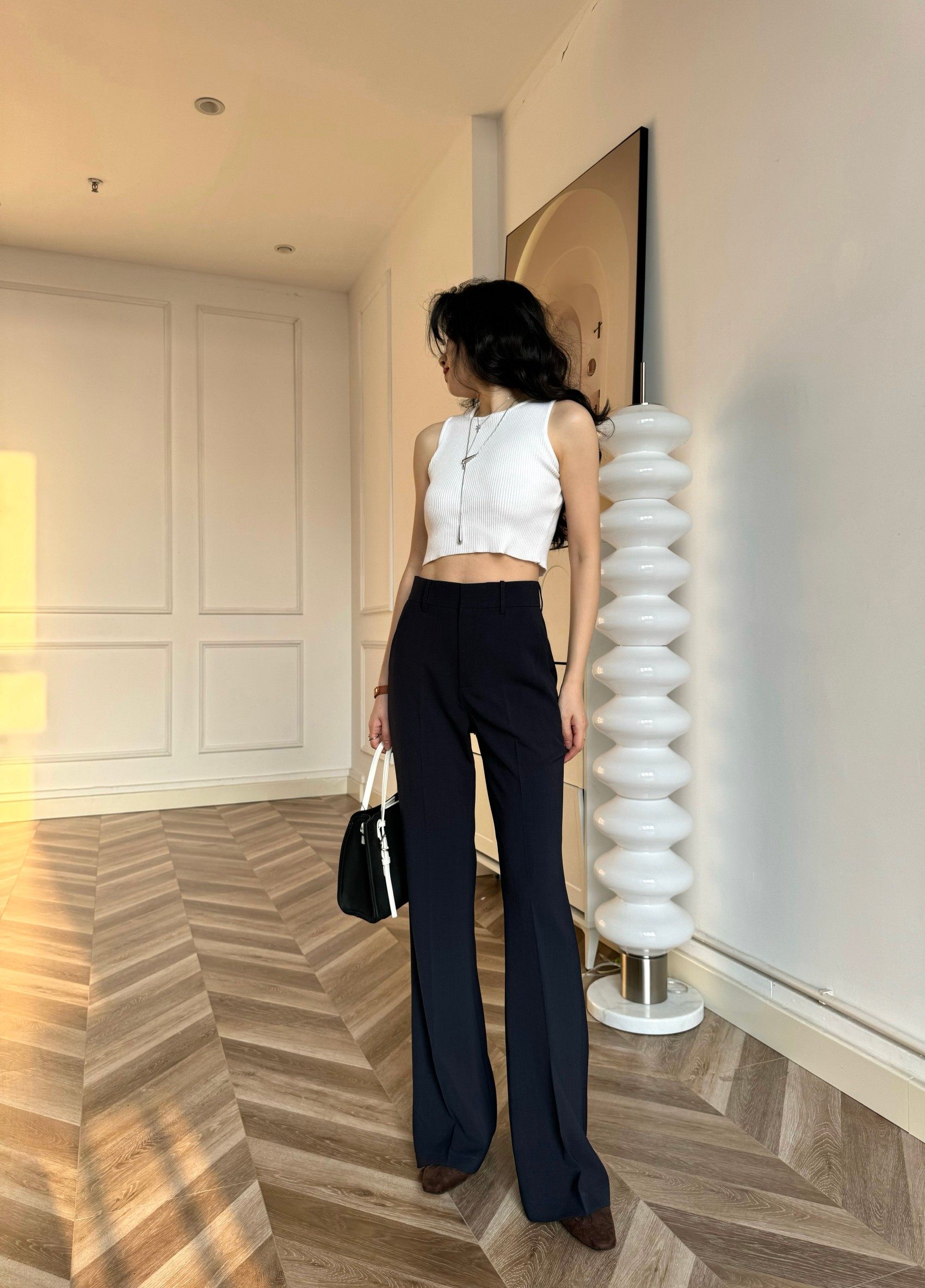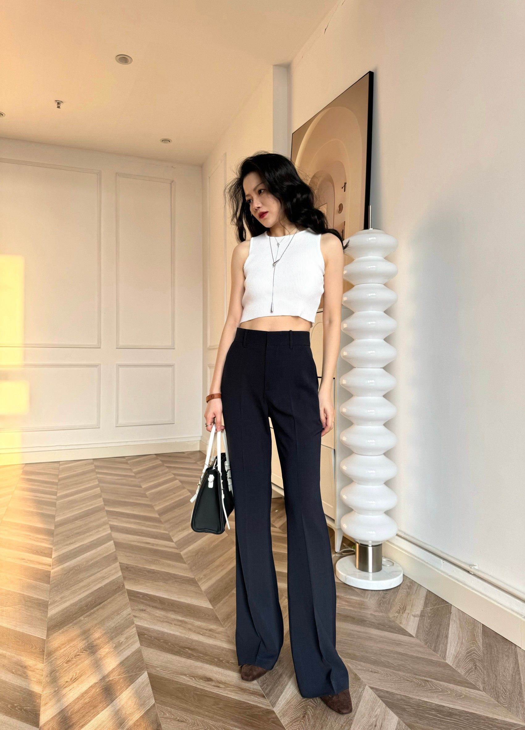 Cat Realm Exclusive High-Waisted Navy Blue Slim-Fit Thin Drape No-Iron Flared Extended Trousers