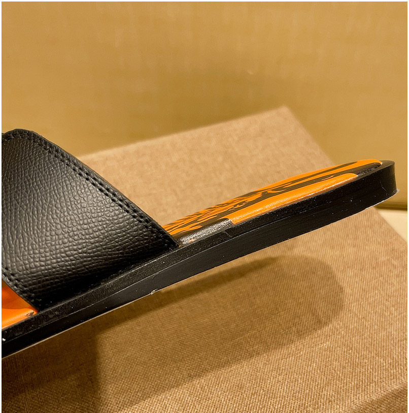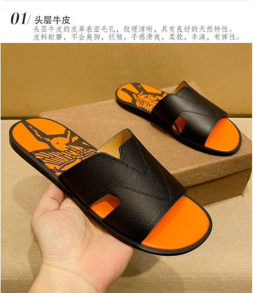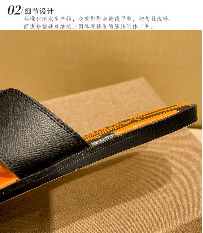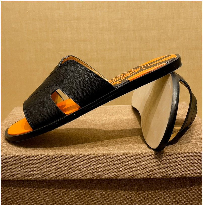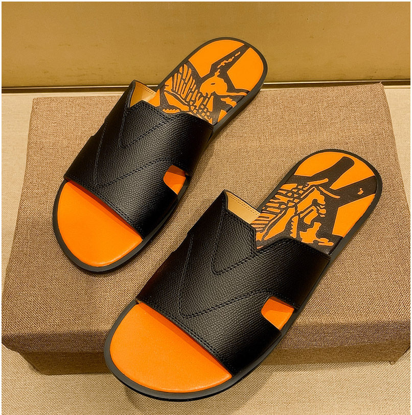 Light Luxury European High-End Genuine Leather H Slippers for Men with Horse Print, Summer Black High-End Feel Beach Vacation Flip-Flops