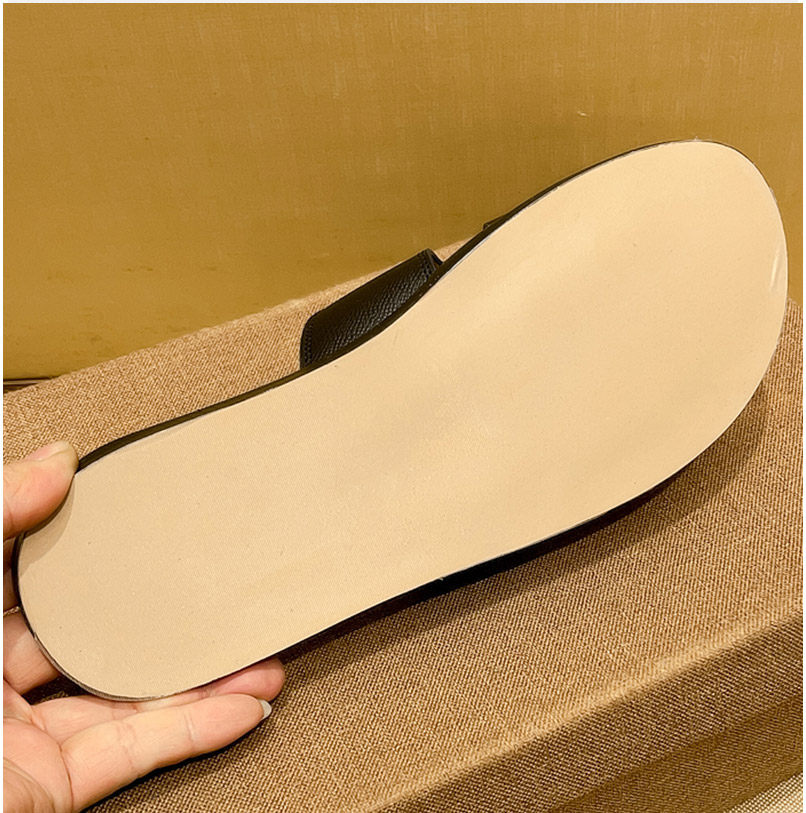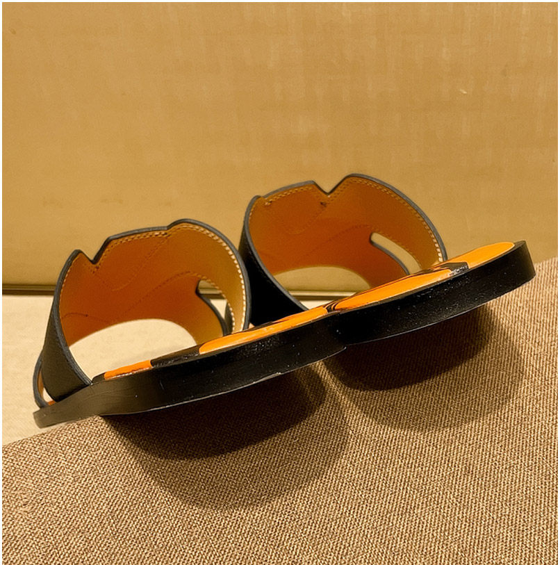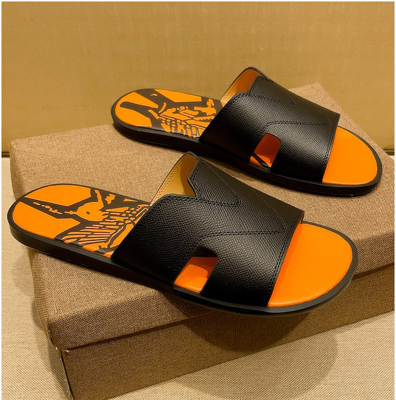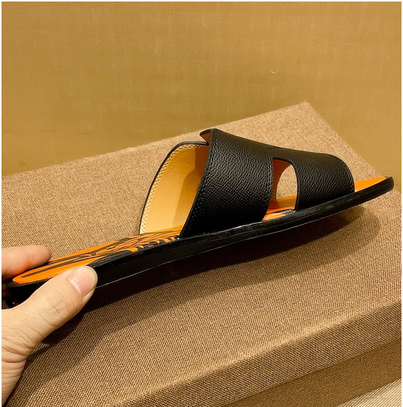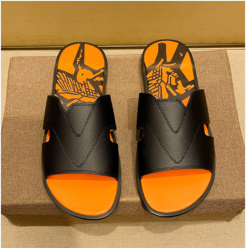 Light Luxury European High-End Genuine Leather H Slippers for Men with Horse Print, Summer Black High-End Feel Beach Vacation Flip-Flops