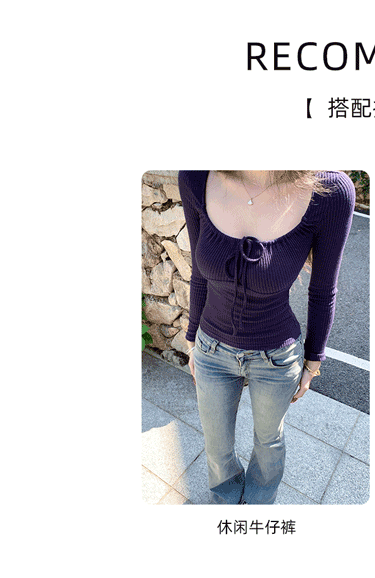 【Fart Shop】Pure and Desirable Three-Color Tie Long-Sleeve Women's Autumn Ribbed Square Neck White-Enhancing Base Shirt Top