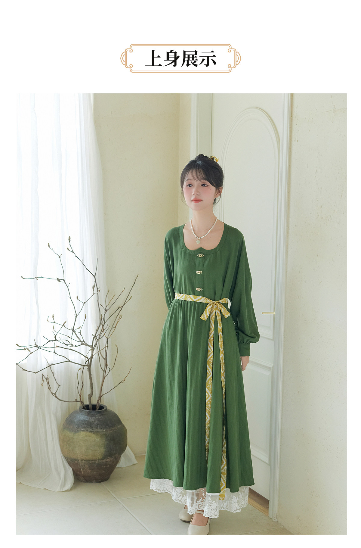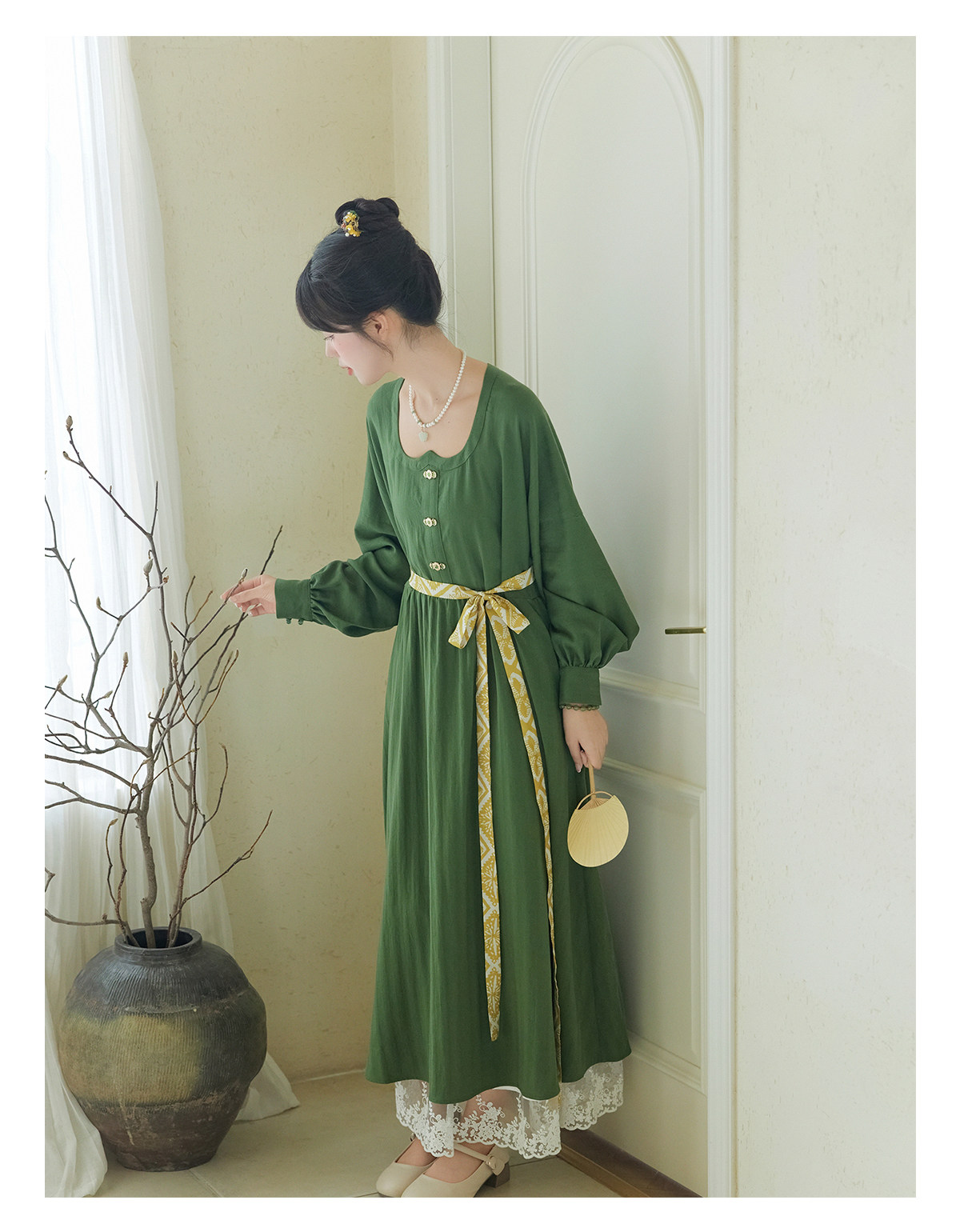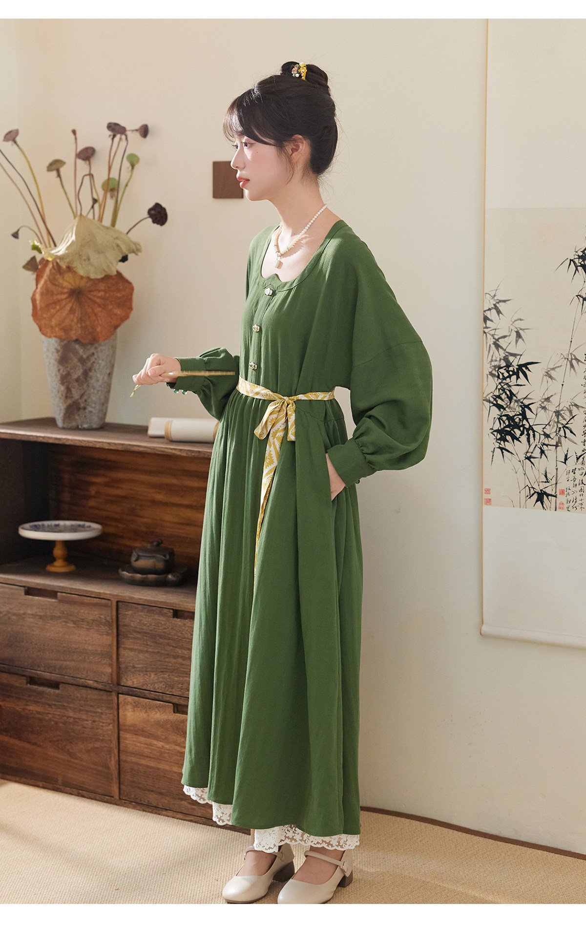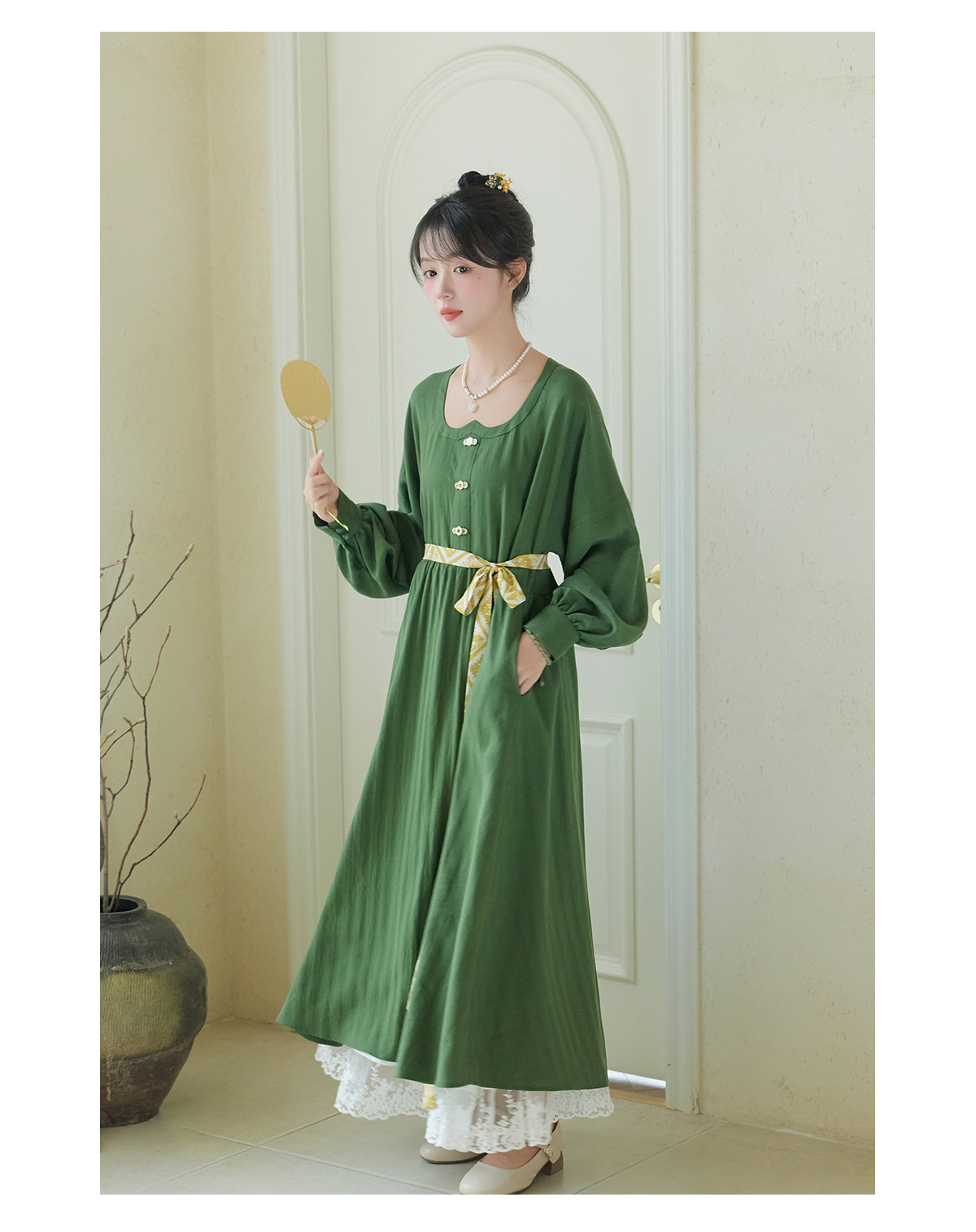 Qi Mumu Hanfu [Dailuo] Chicken-Crow Collar Lantern Sleeves Printed Tie Original Modified Slimming Dress