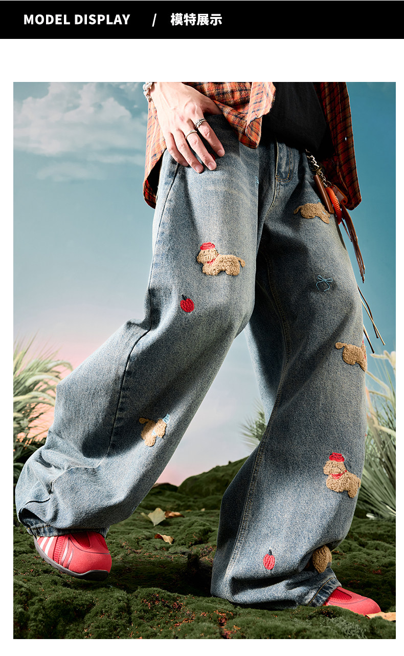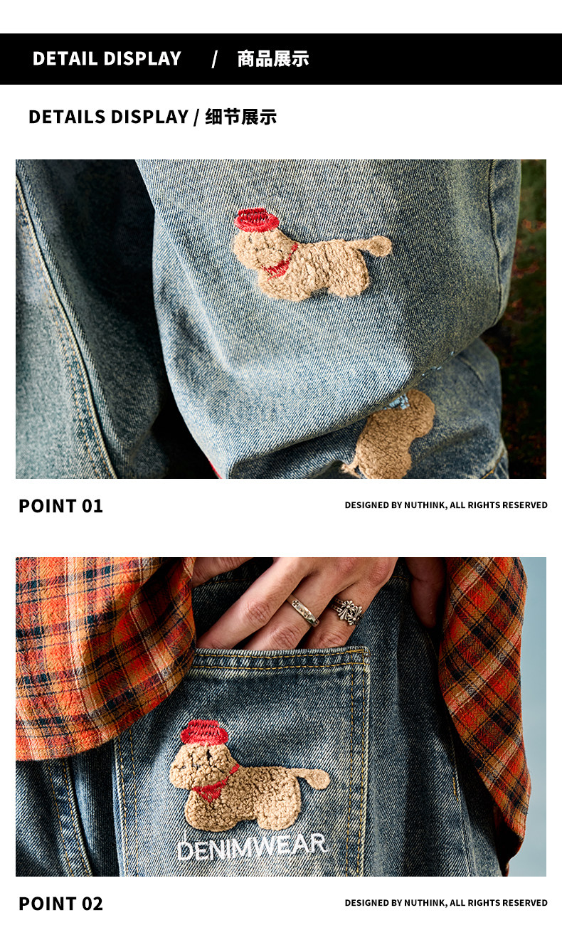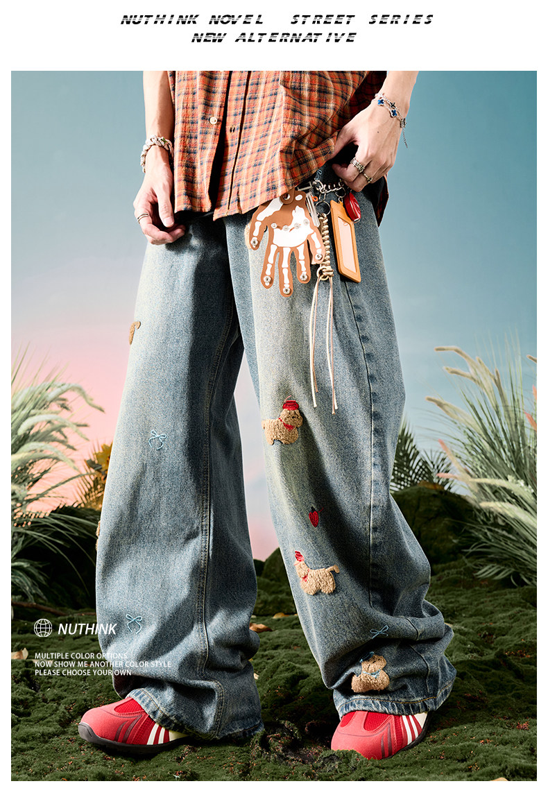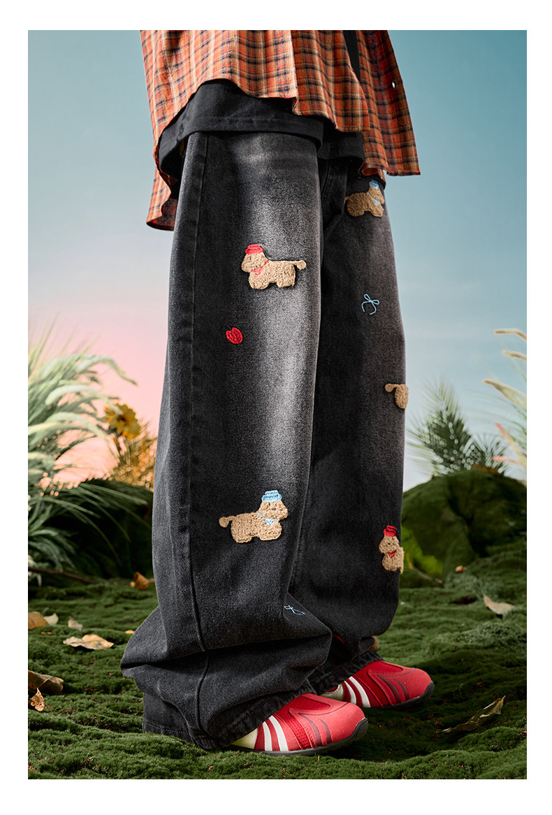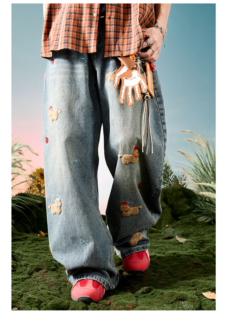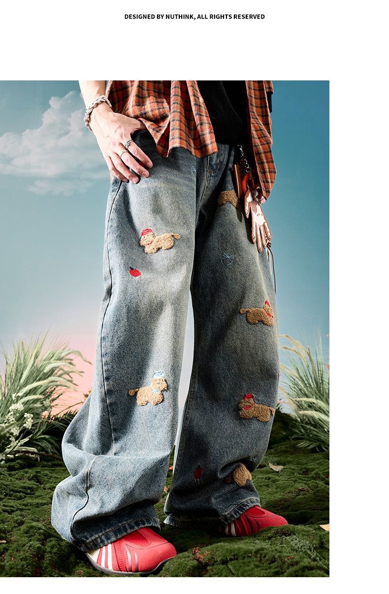 Nuthink American-Style Embroidered Puppy Jeans Washed Vintage Fleece-Lined Long Pants Men's Trousers 2026 Spring