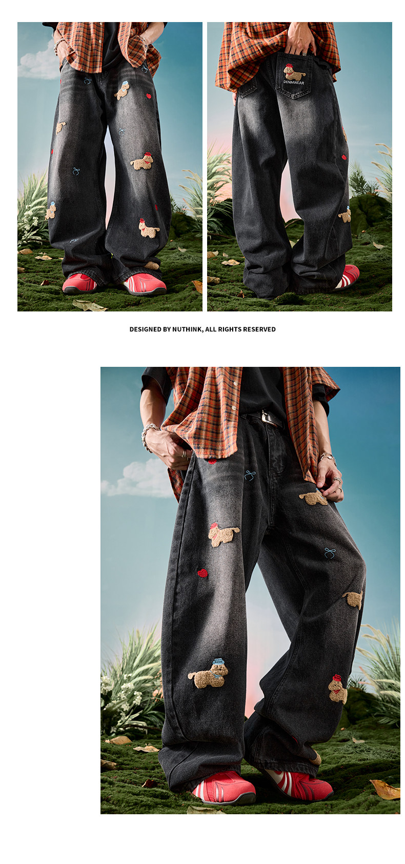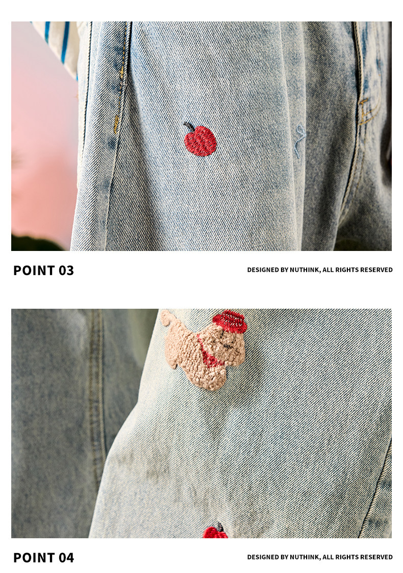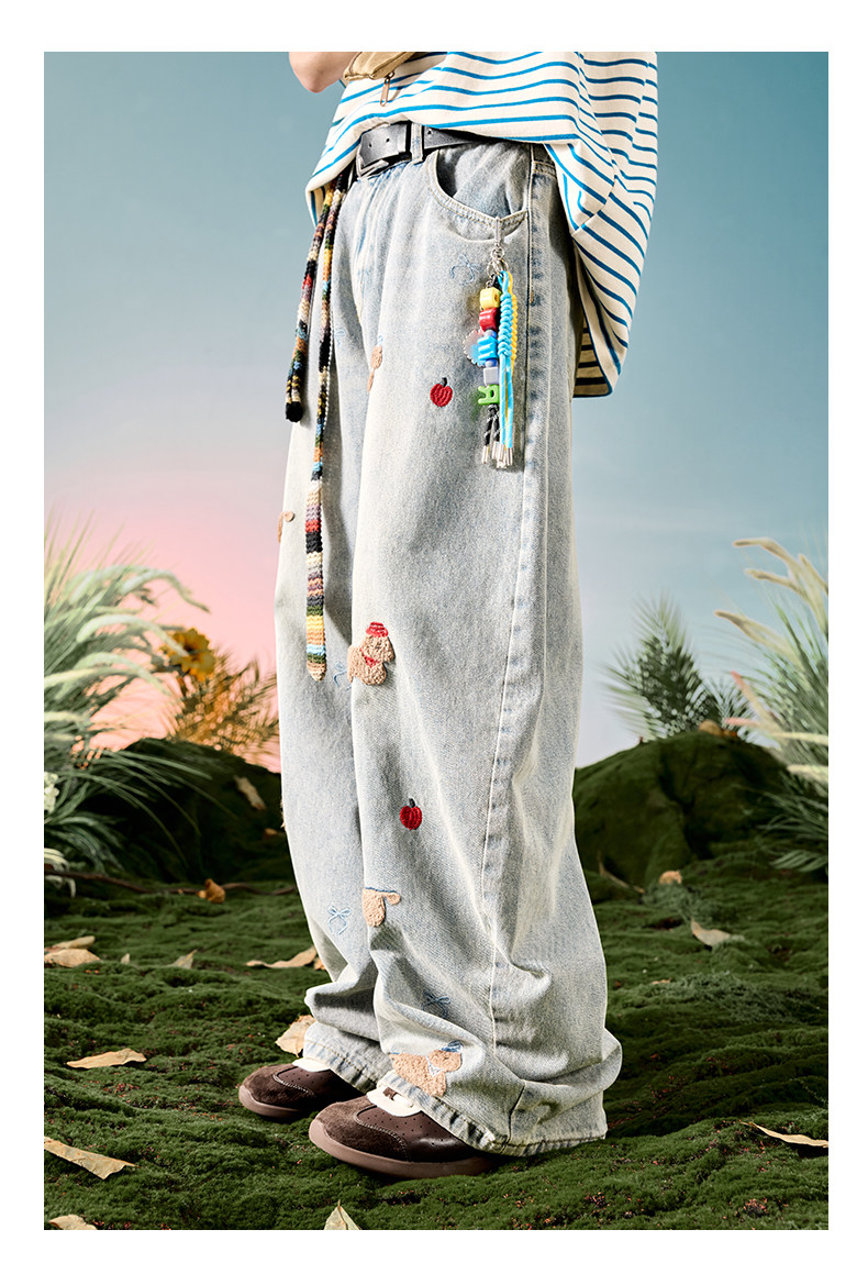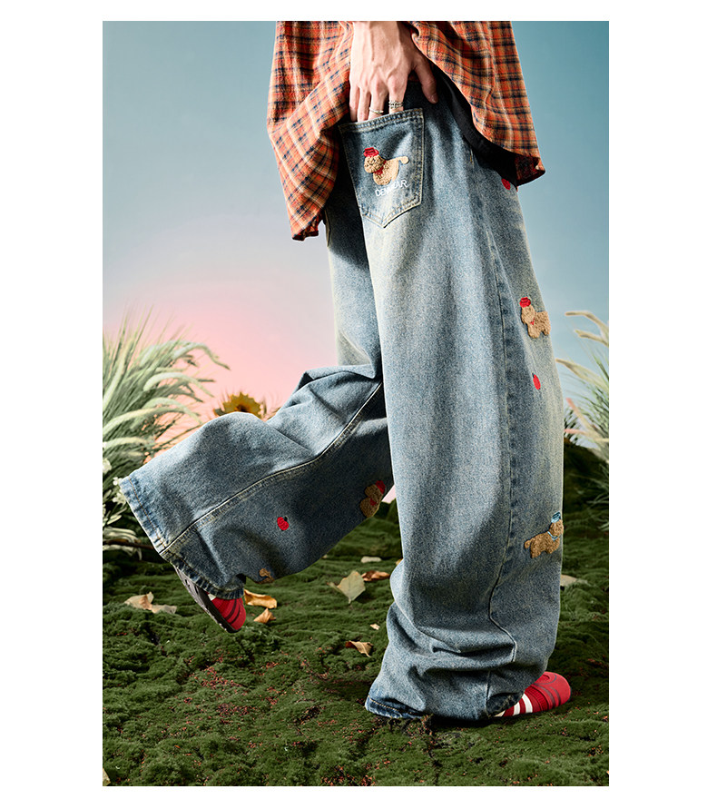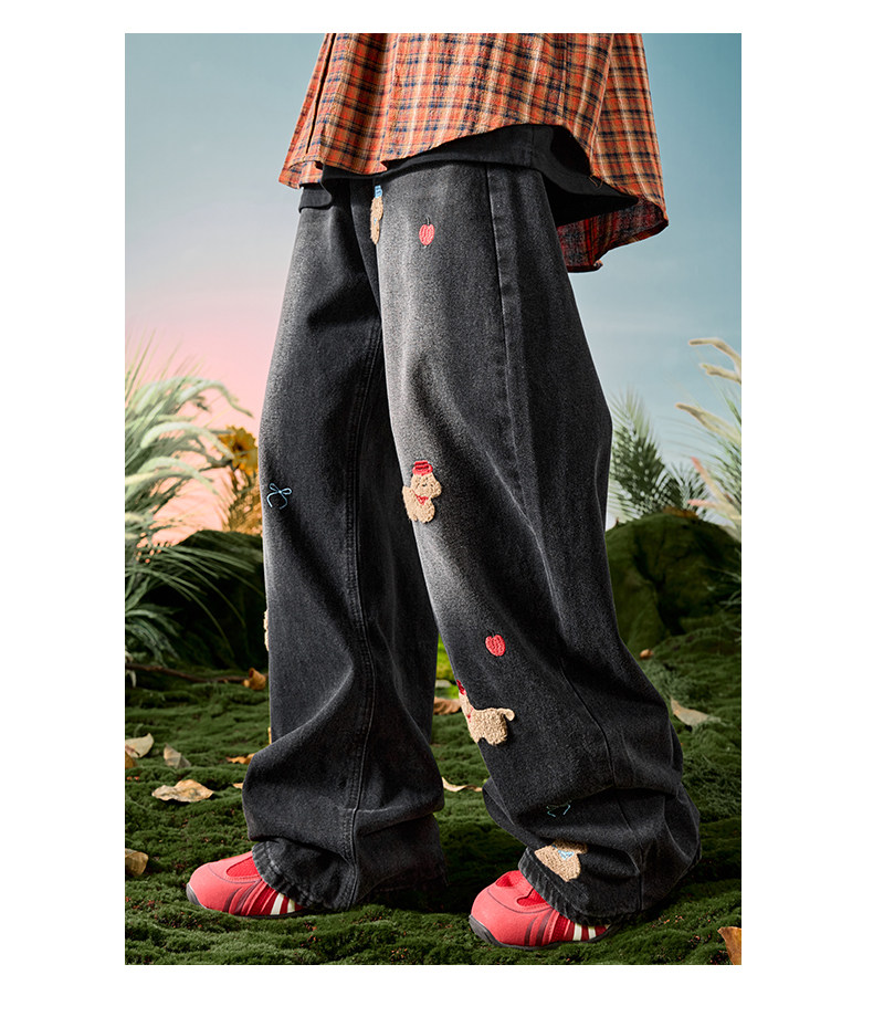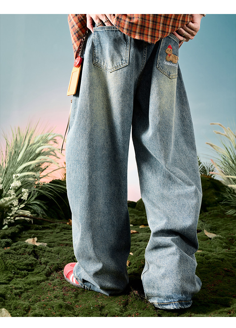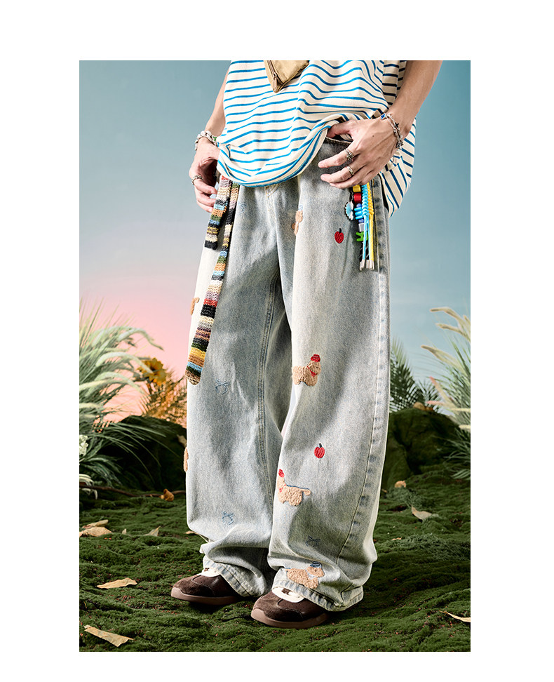 Nuthink American-Style Embroidered Puppy Jeans Washed Vintage Fleece-Lined Long Pants Men's Trousers 2026 Spring