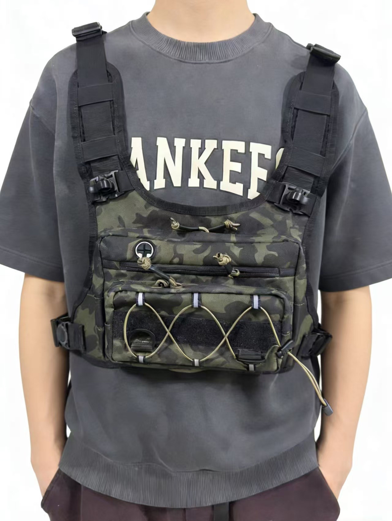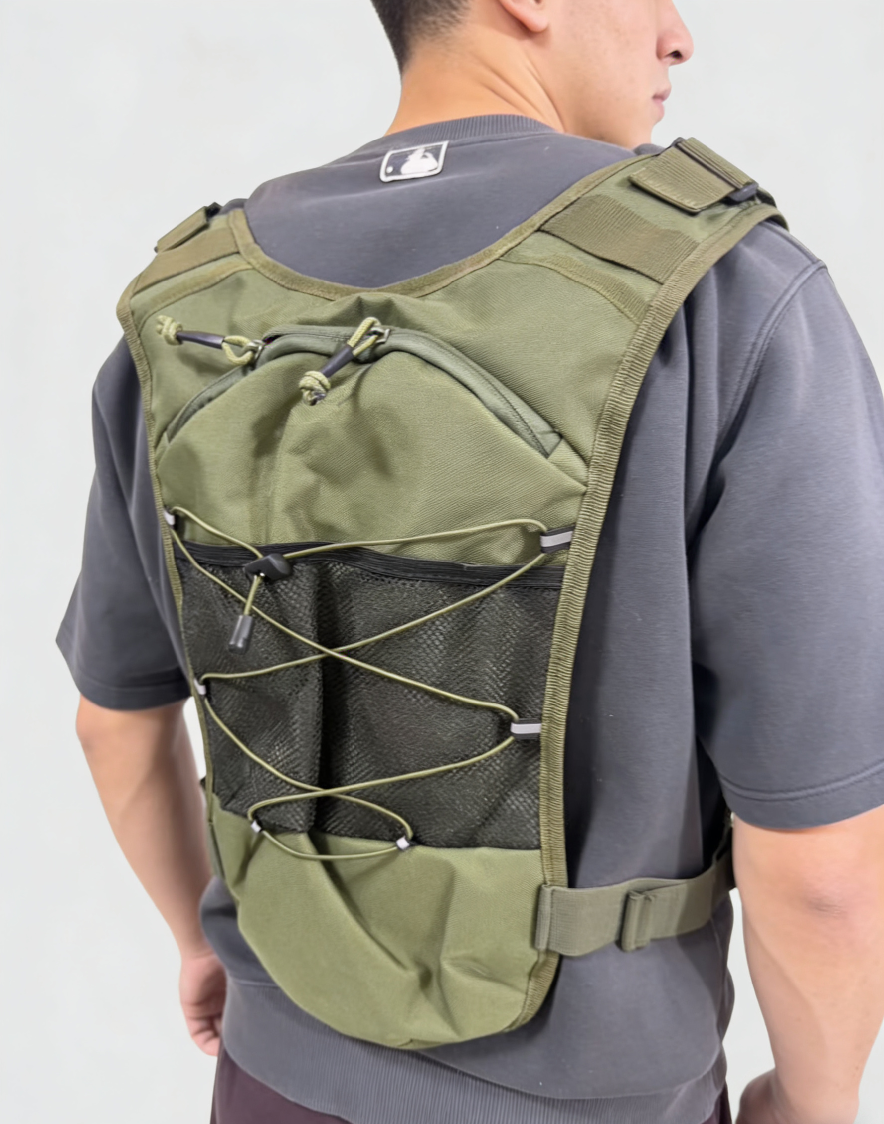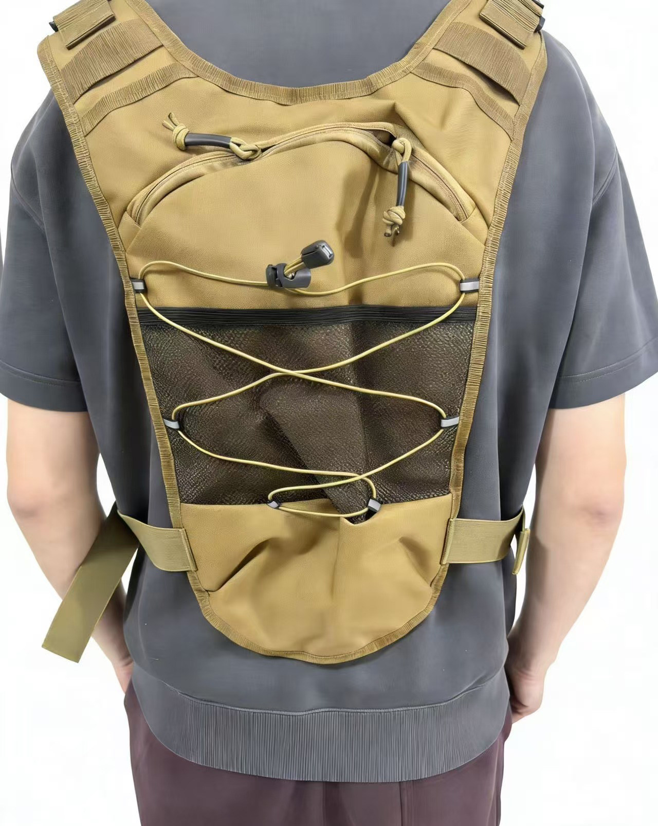 这是一款新款战术胸包 后面有水袋背包。水袋背包专为户外运动设计,内置可装水的水袋,配备吸管,方便运动者在行进中随时补水。它的背负系统贴合人体背部,能分散重量,减轻肩部负担。背包还有多个储物空间,可存放手机、钥匙、能量补给等小物件,且采用轻便、耐磨的材料制作,适合跑步、骑行、徒步,登山,旅行等多种户外场景,为户外运动爱好者提供便利的饮水和储物解决方案。