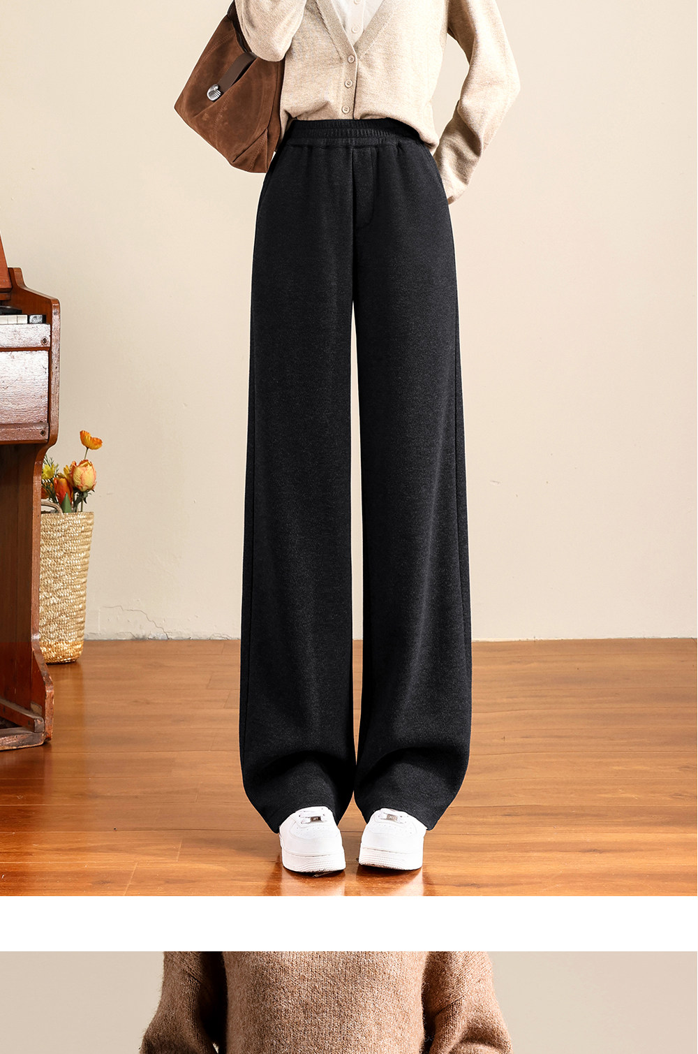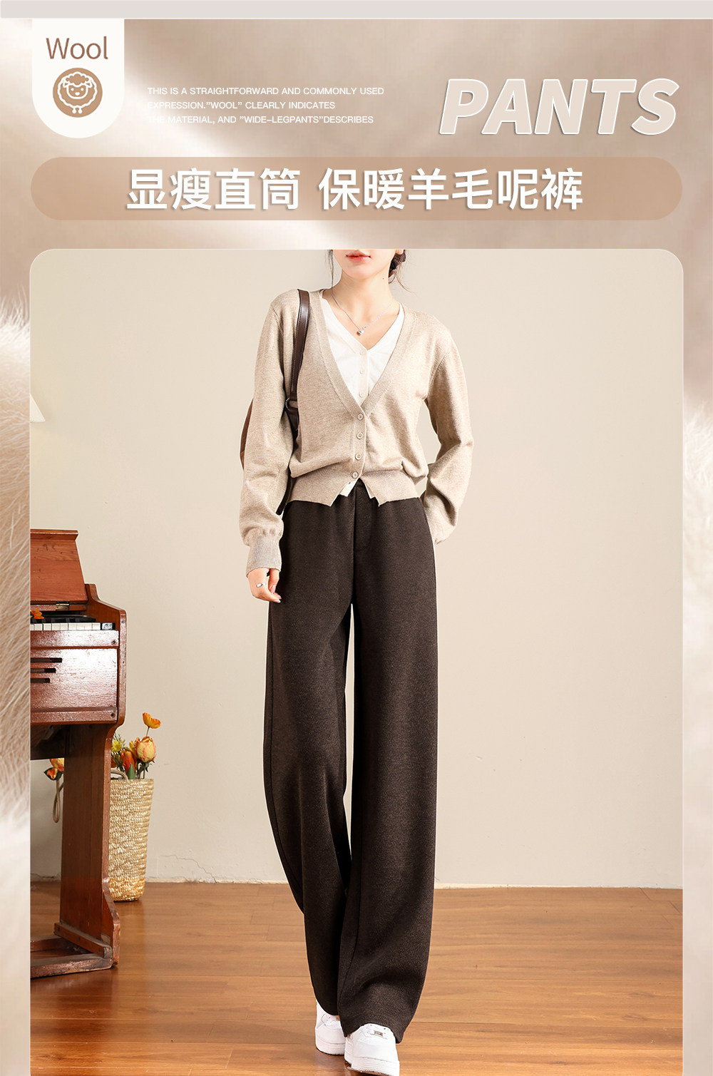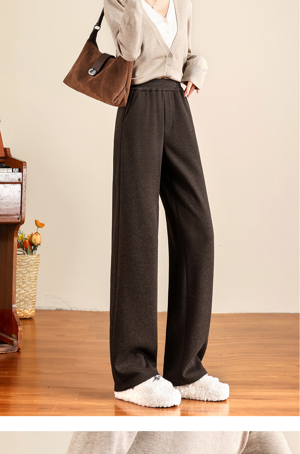 Brown Acetate Wool Wide-Leg Pants for Women, Autumn and Winter, Fleece-Lined, Petite, Melard Drape, Narrow Straight-Leg Woolen Pants