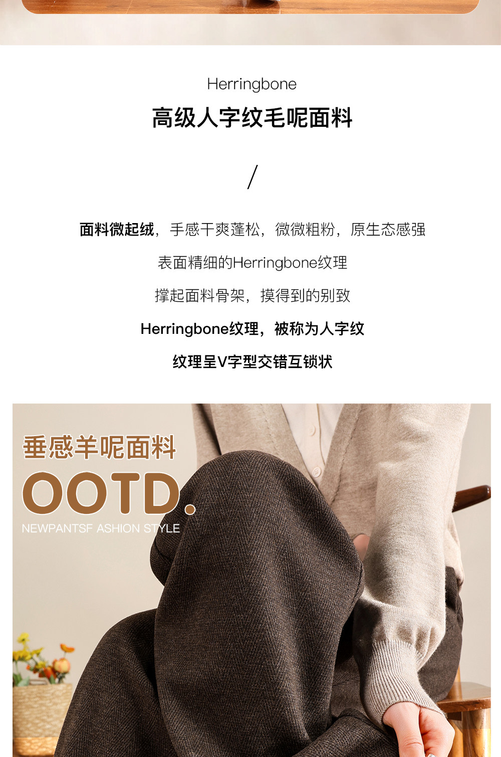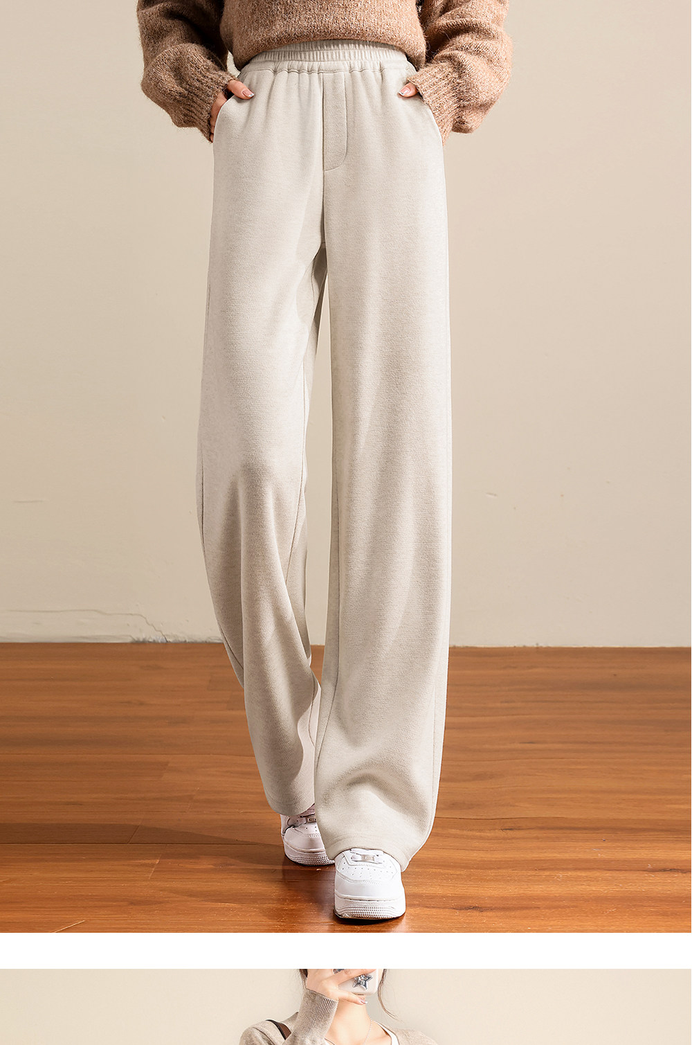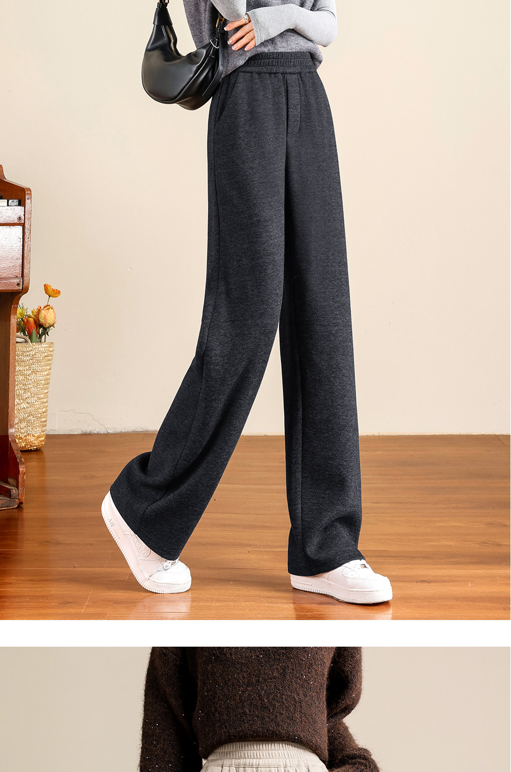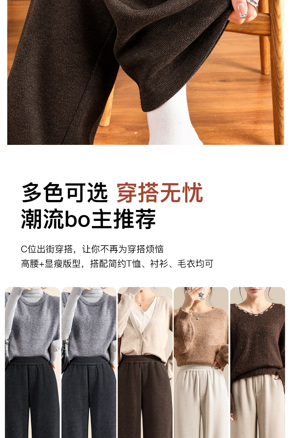 Brown Acetate Wool Wide-Leg Pants for Women, Autumn and Winter, Fleece-Lined, Petite, Melard Drape, Narrow Straight-Leg Woolen Pants