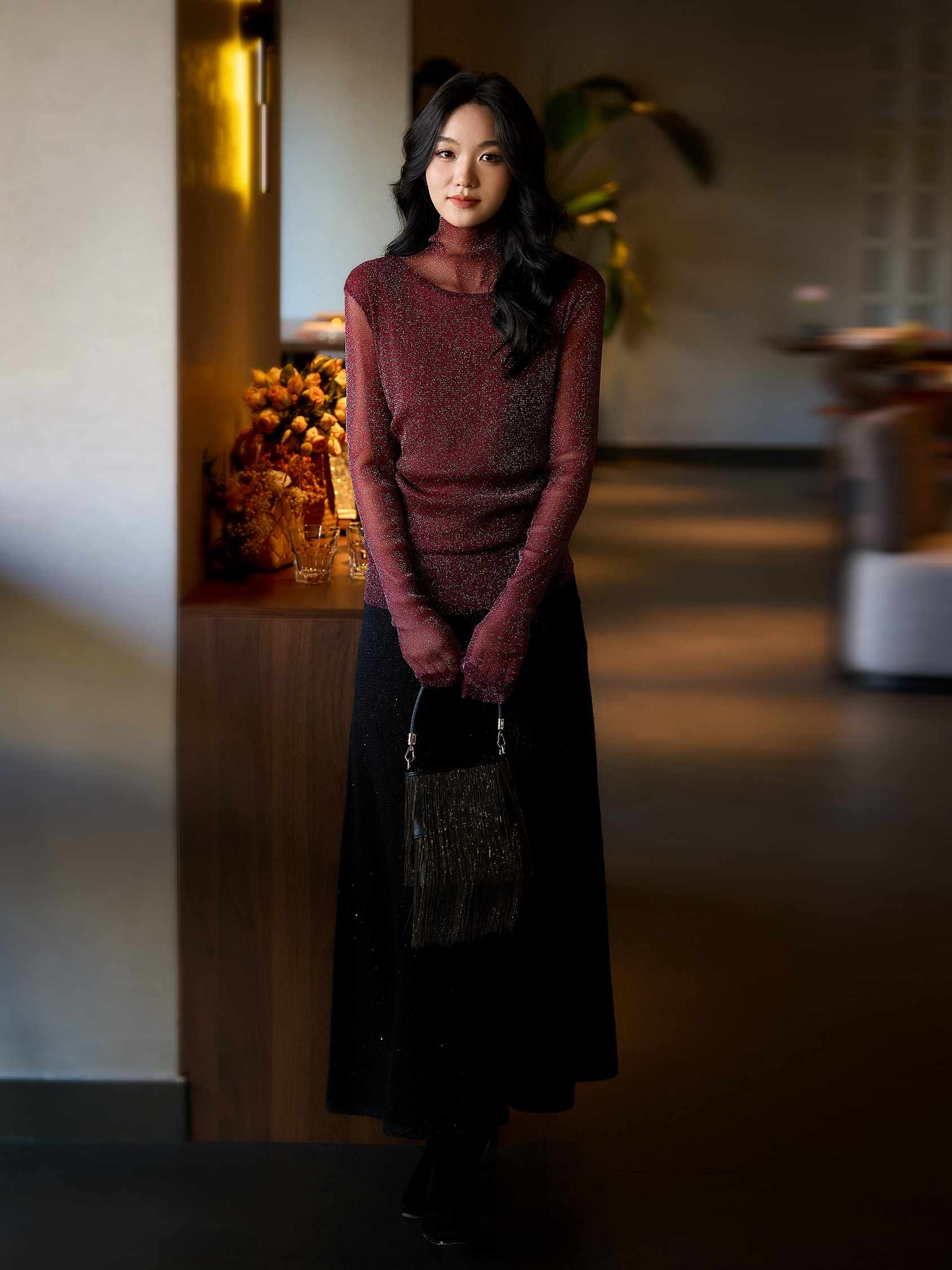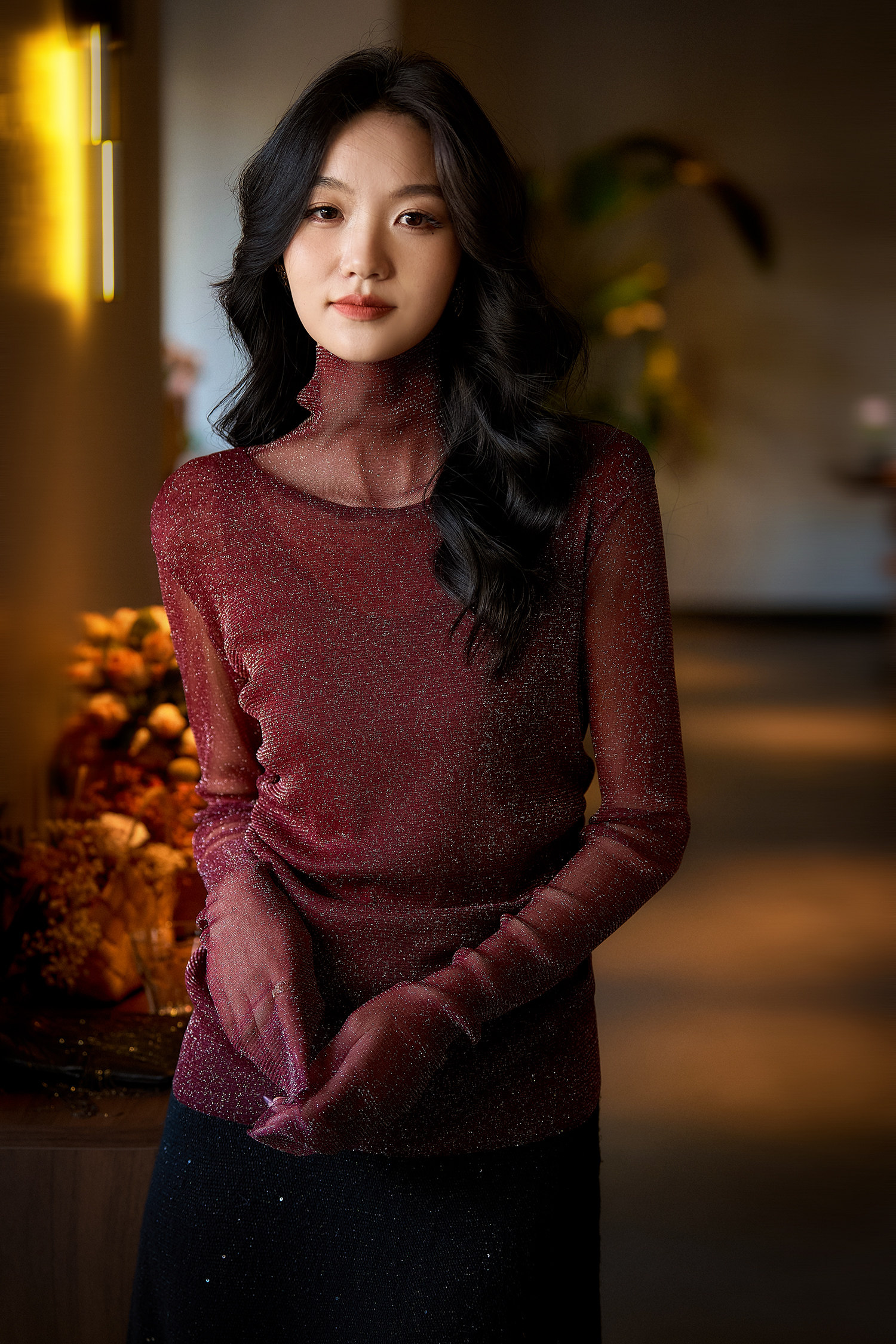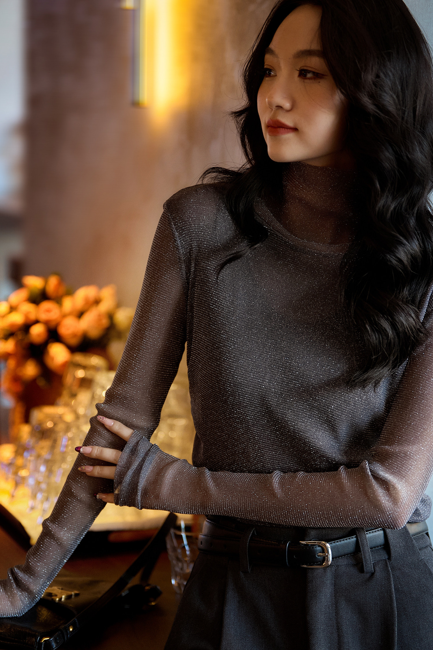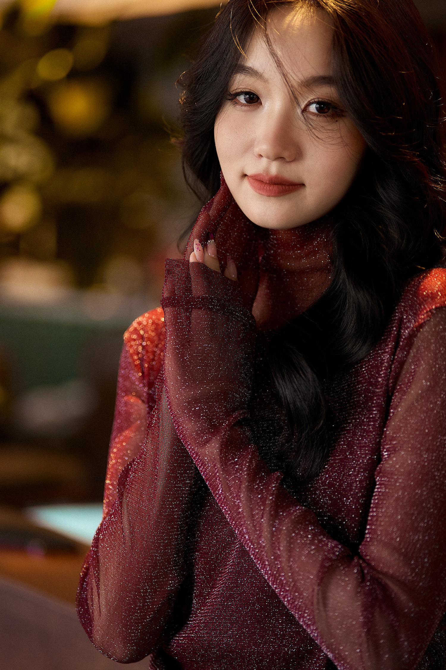 选用轻盈薄透的星光细闪微透视面料