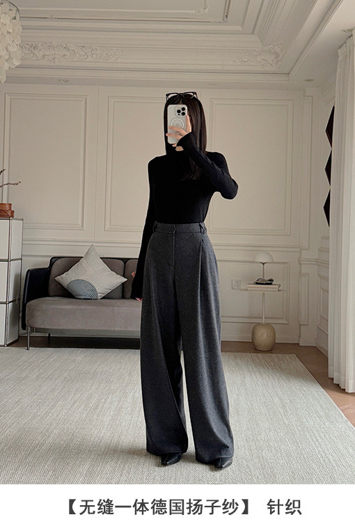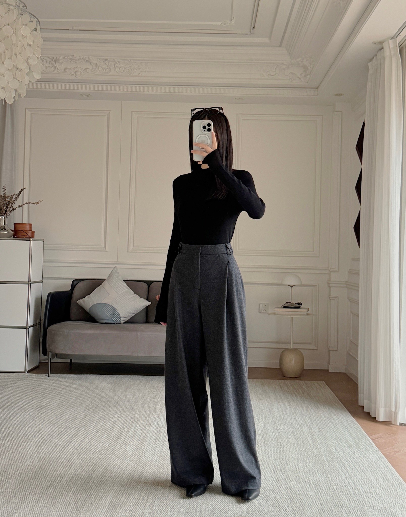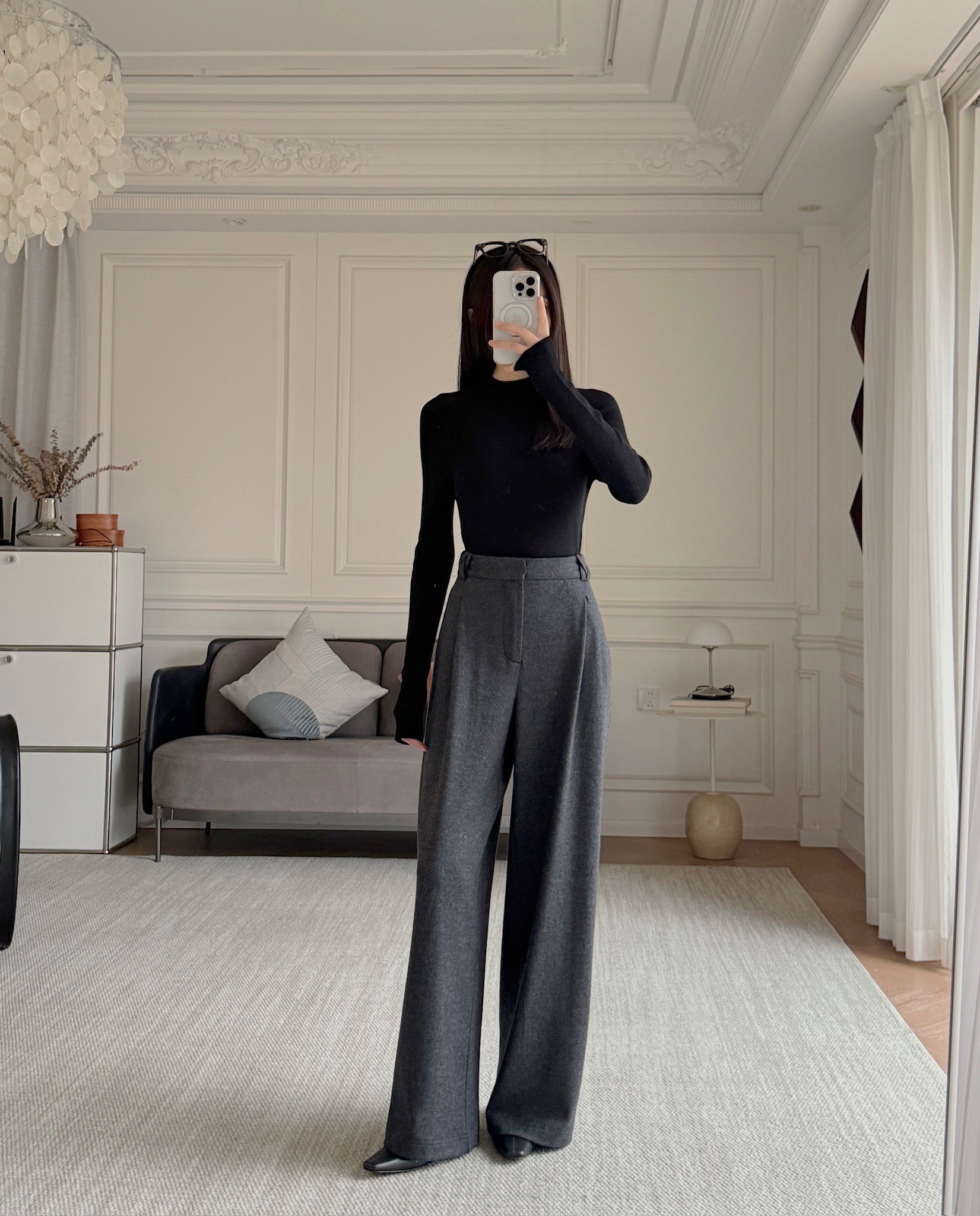 及地裤长自然垂坠,纵向拉伸线条,松弛有度!