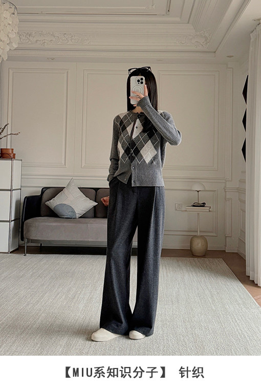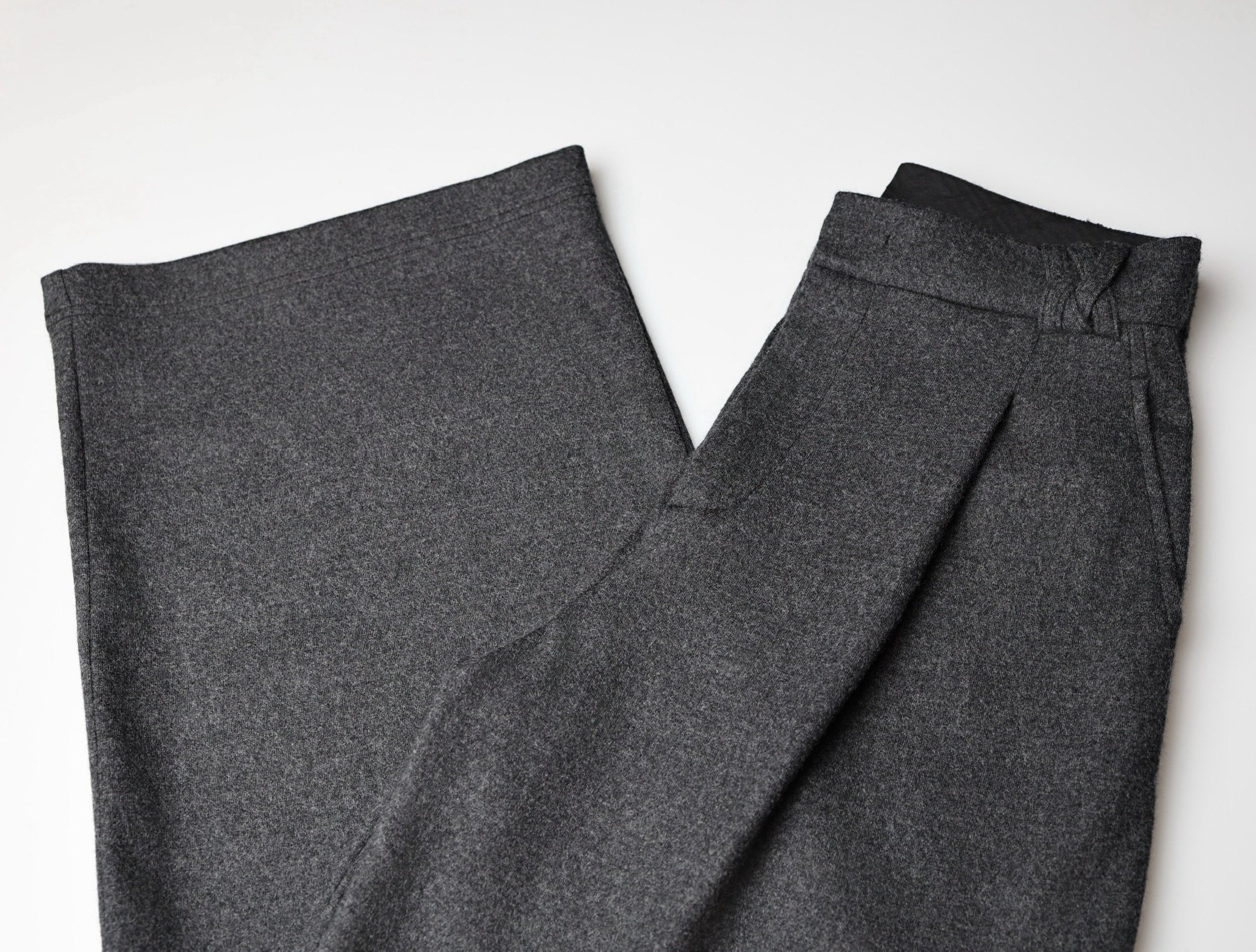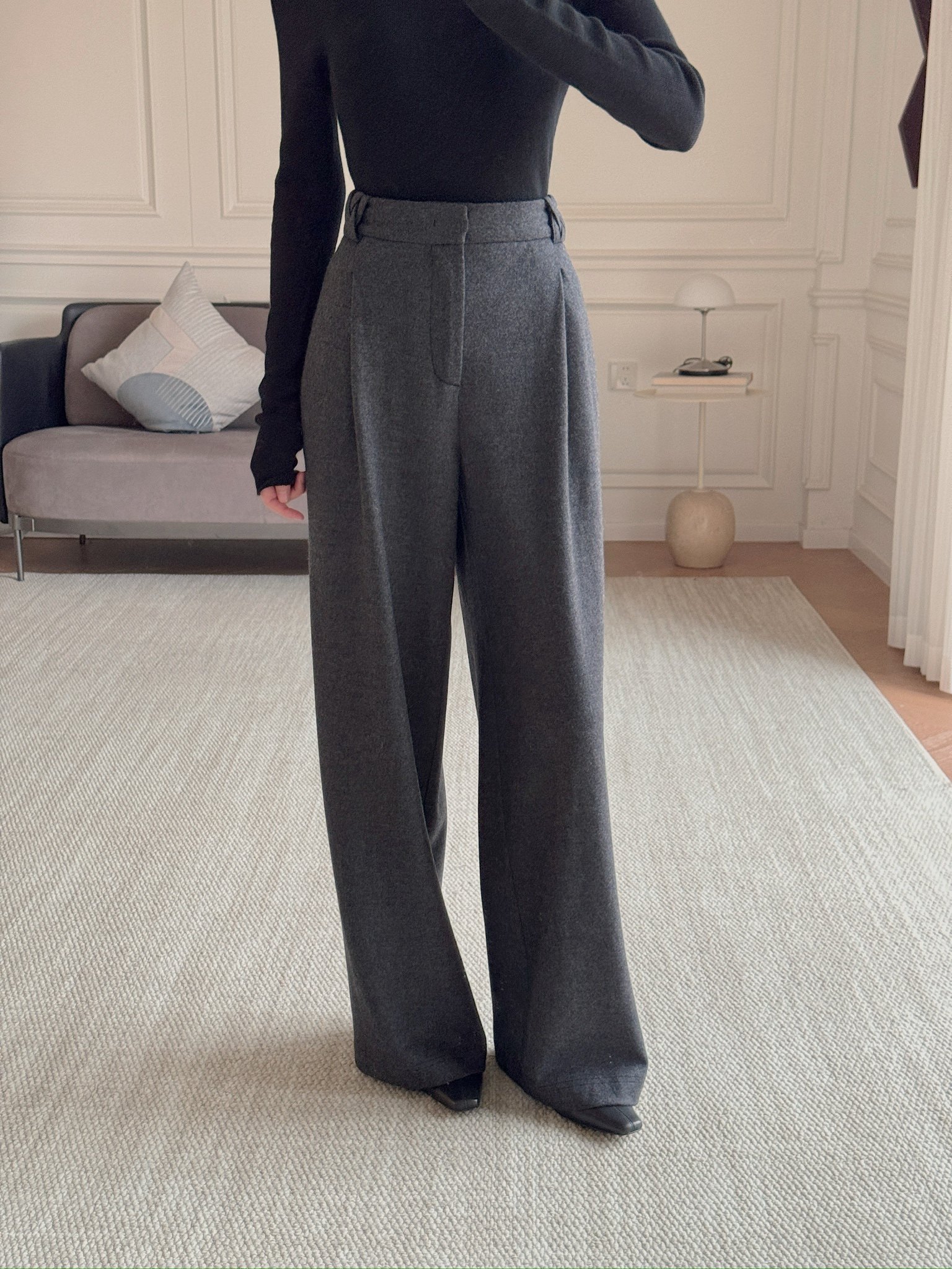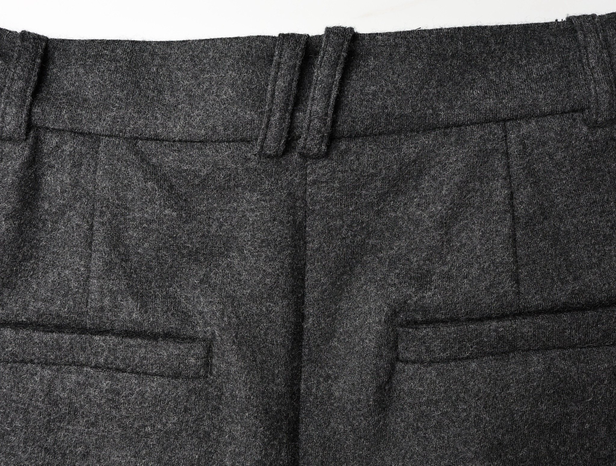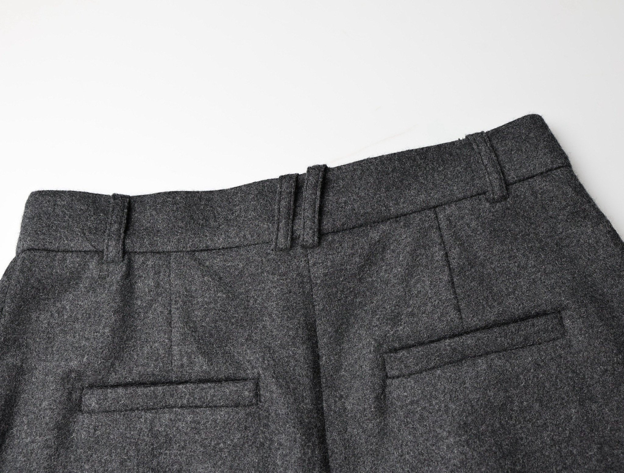 秋冬款的西裤面料采用 chao 细美丽诺羊毛和羊绒混纺纱线