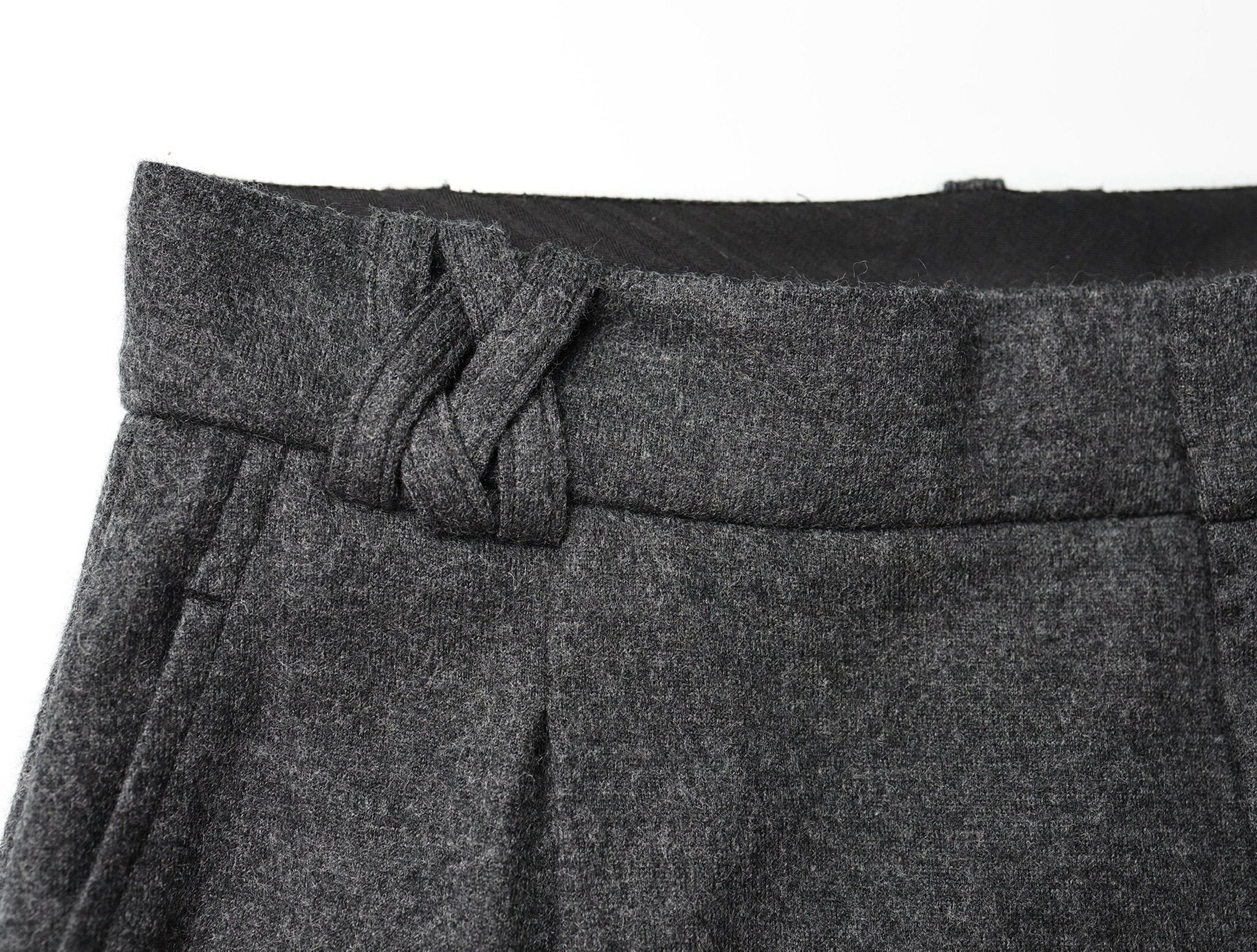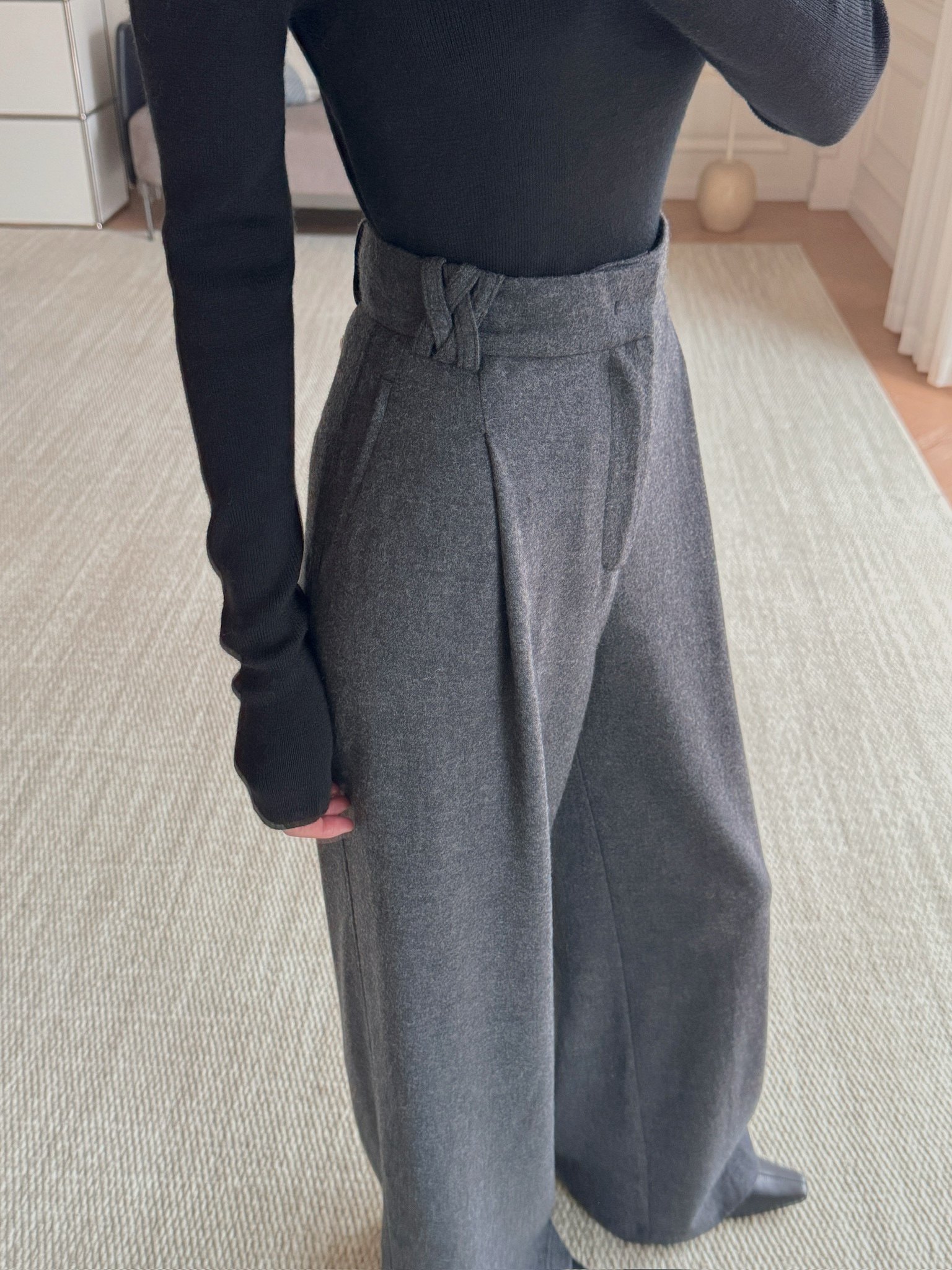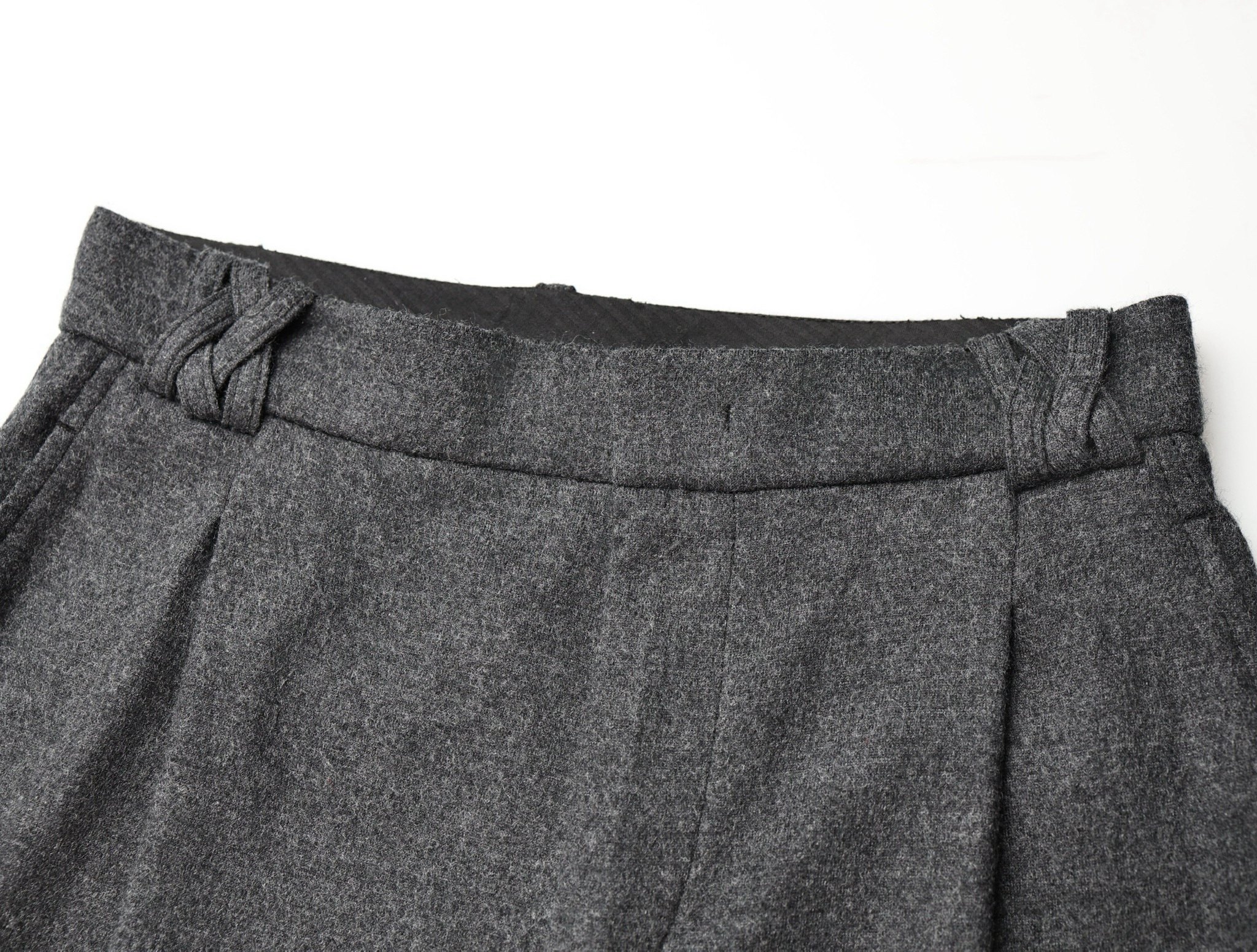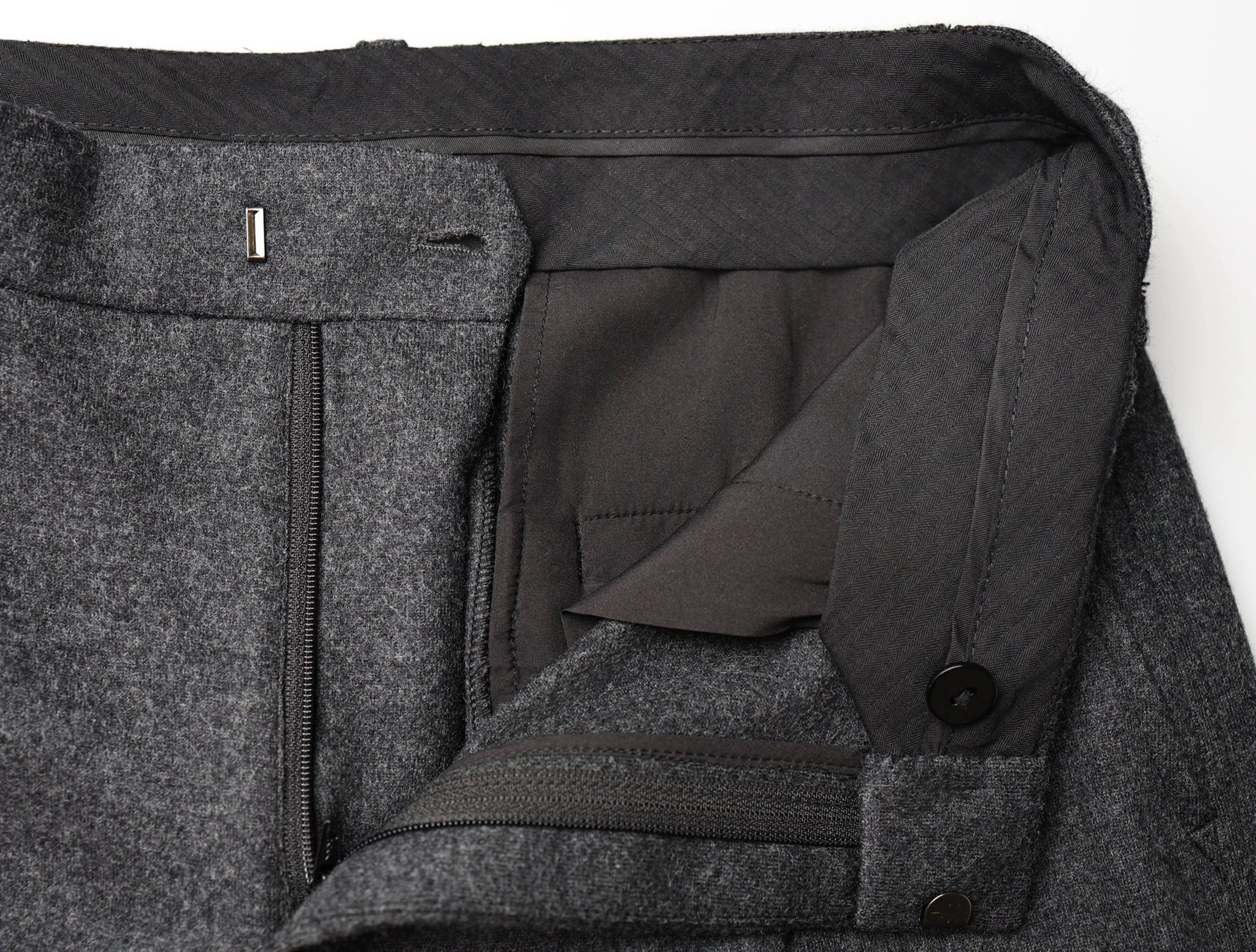 秋冬款的西裤面料采用 chao 细美丽诺羊毛和羊绒混纺纱线