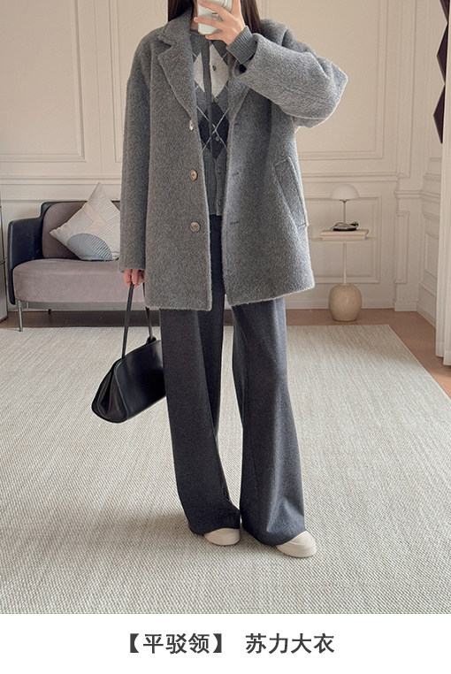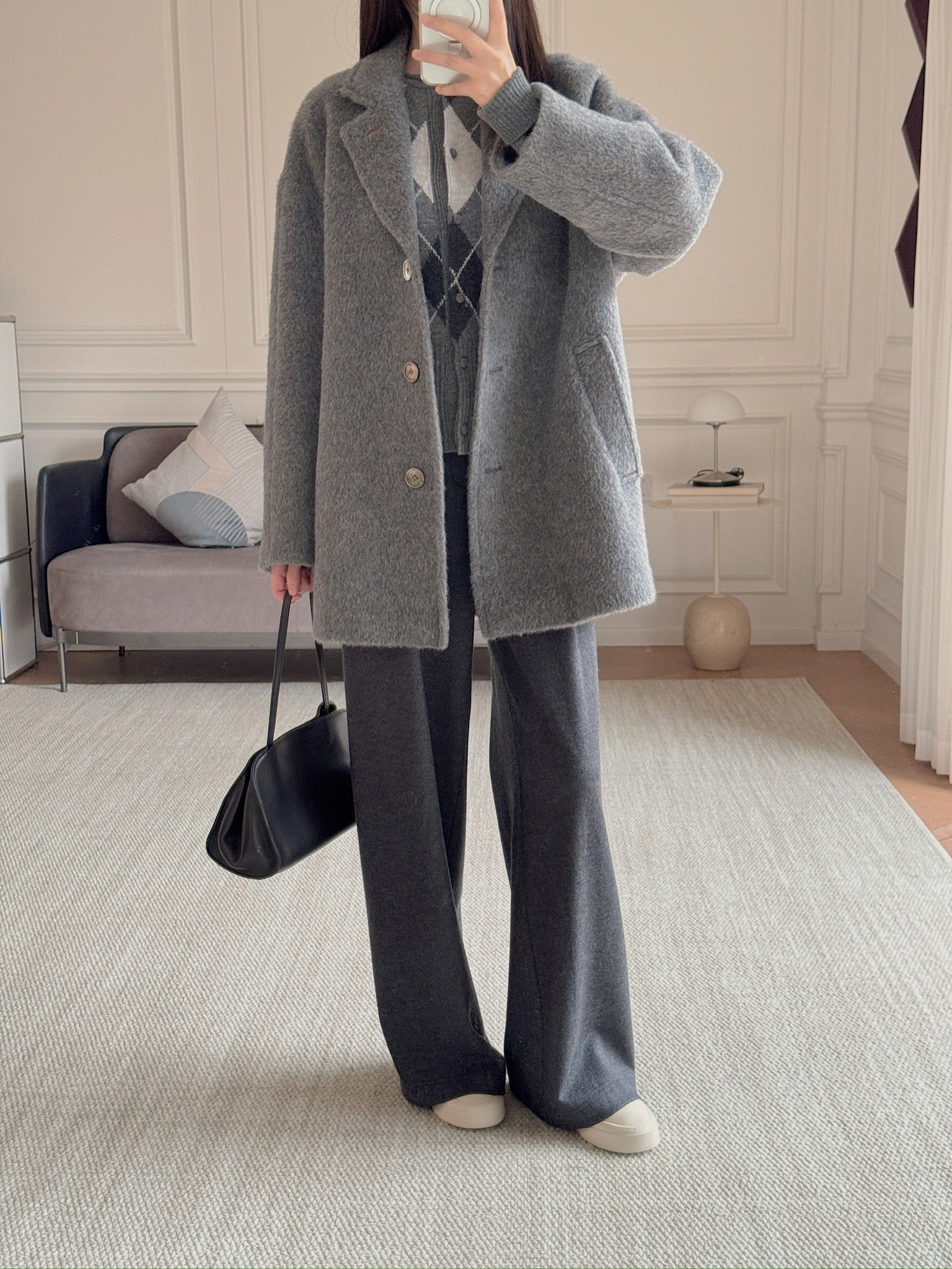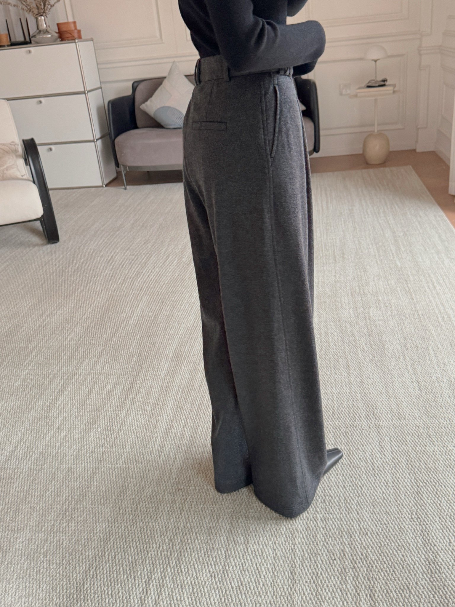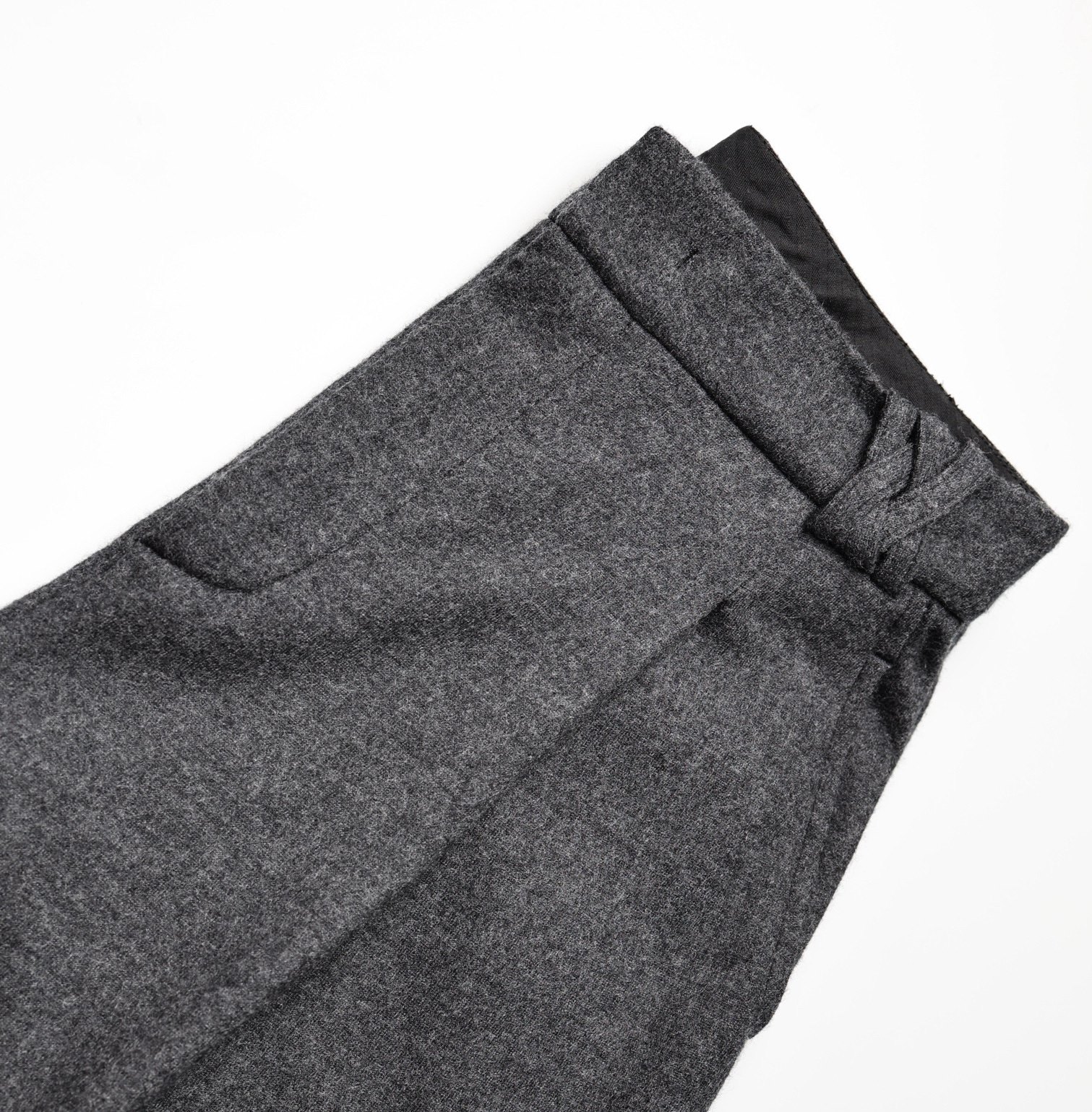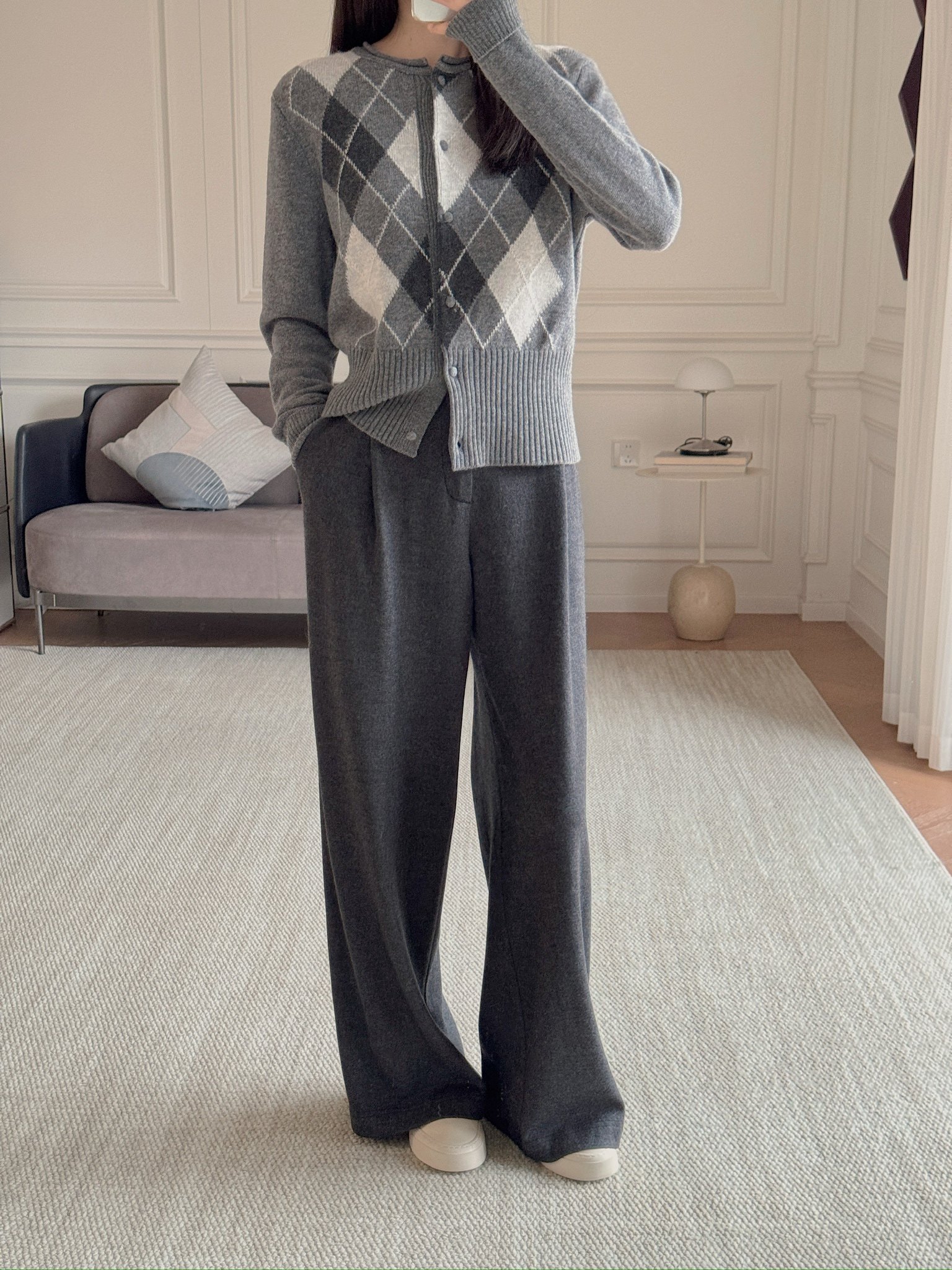 秋冬款的西裤面料采用 chao 细美丽诺羊毛和羊绒混纺纱线