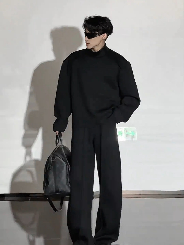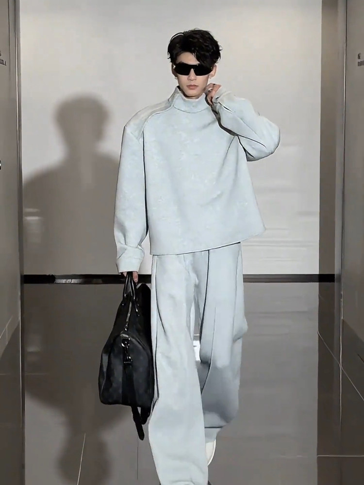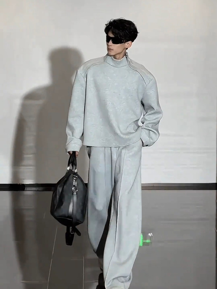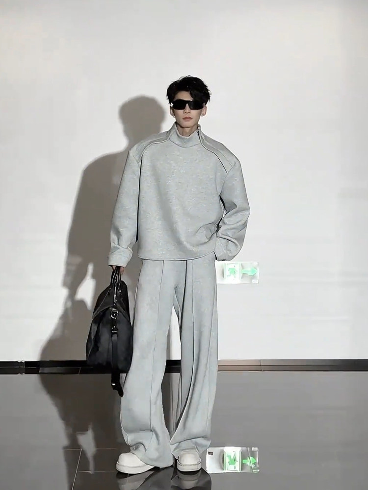Gray Half-High Collar Padded Shoulder Sweatshirt Sports Suit for Men, Trendy Brand, Lazy and Relaxed Style, Casual Sweatpants Two-Piece Set