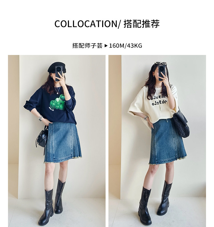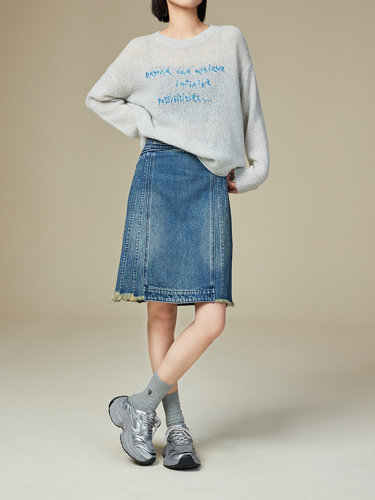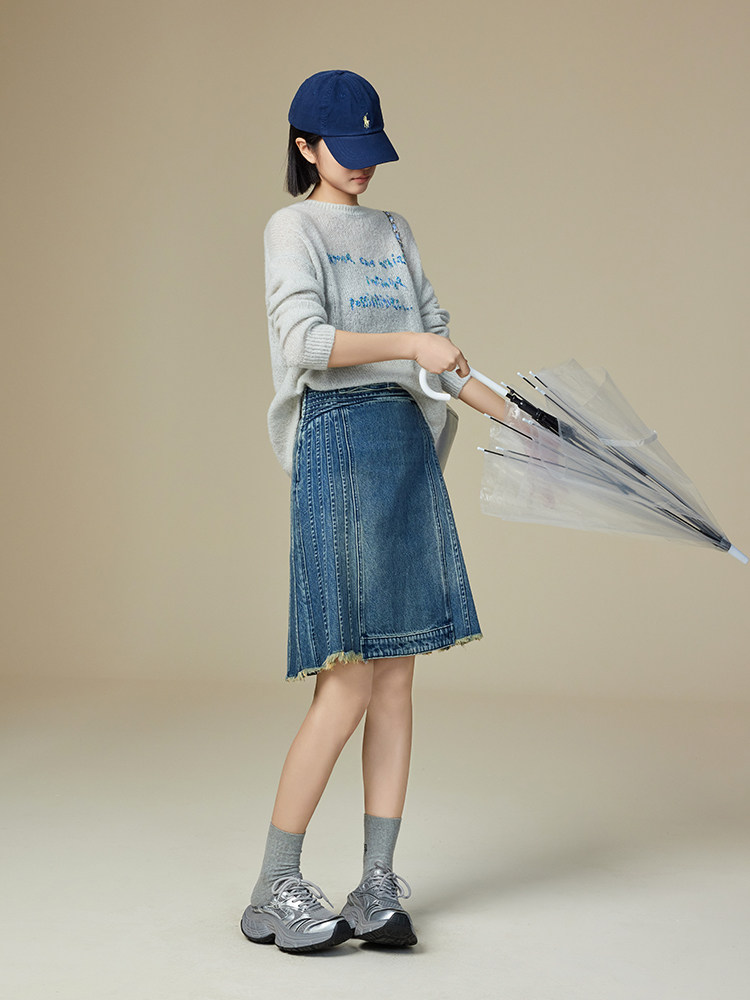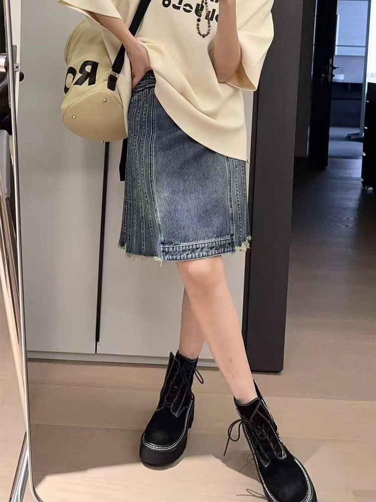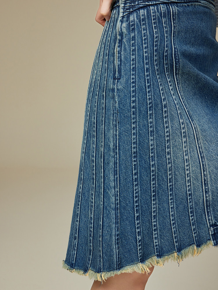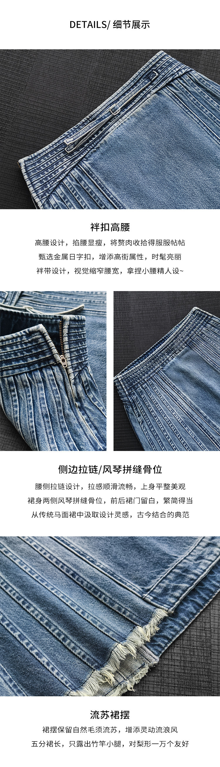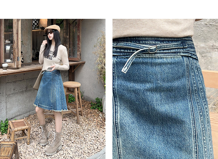 Meiyang【In Stock】Accordion Skirt Distressed Washed High Waist Patchwork Belt Frayed Denim Skirt