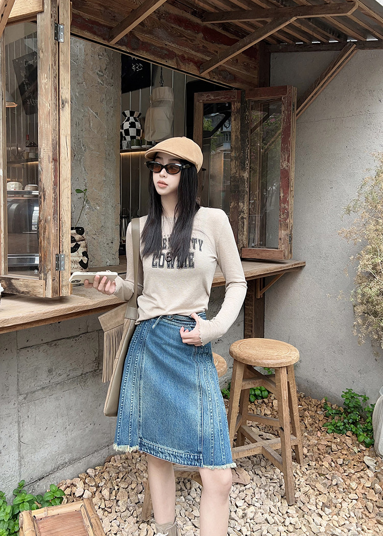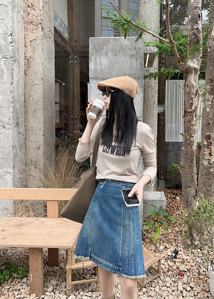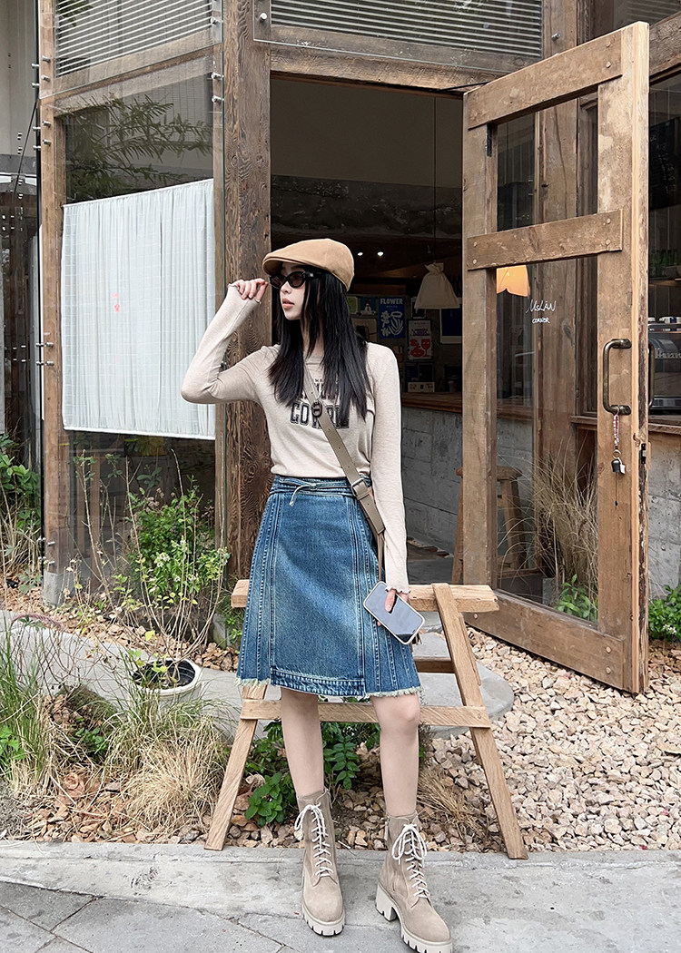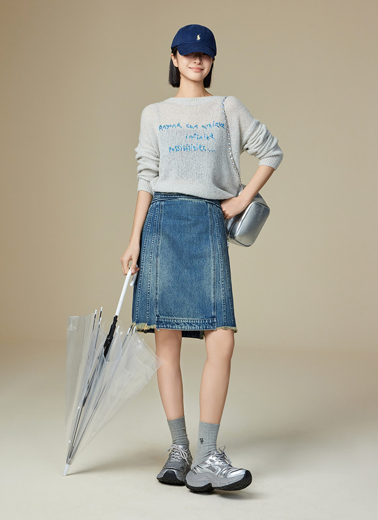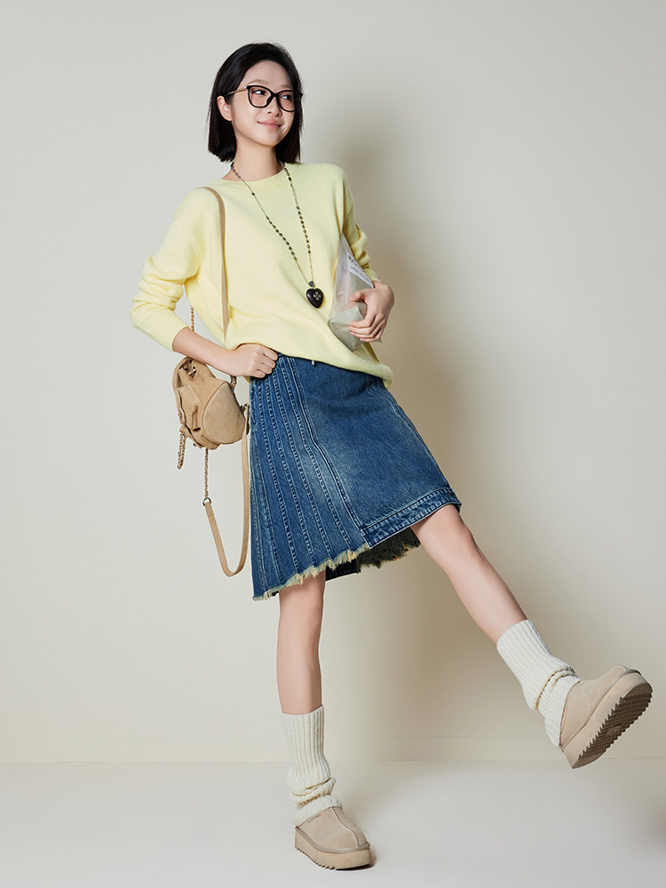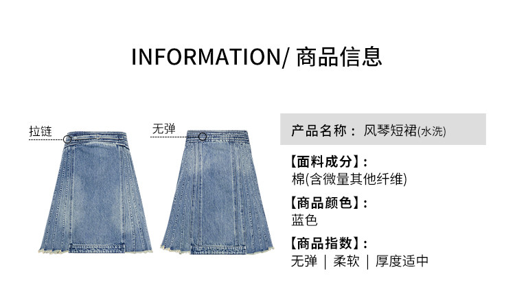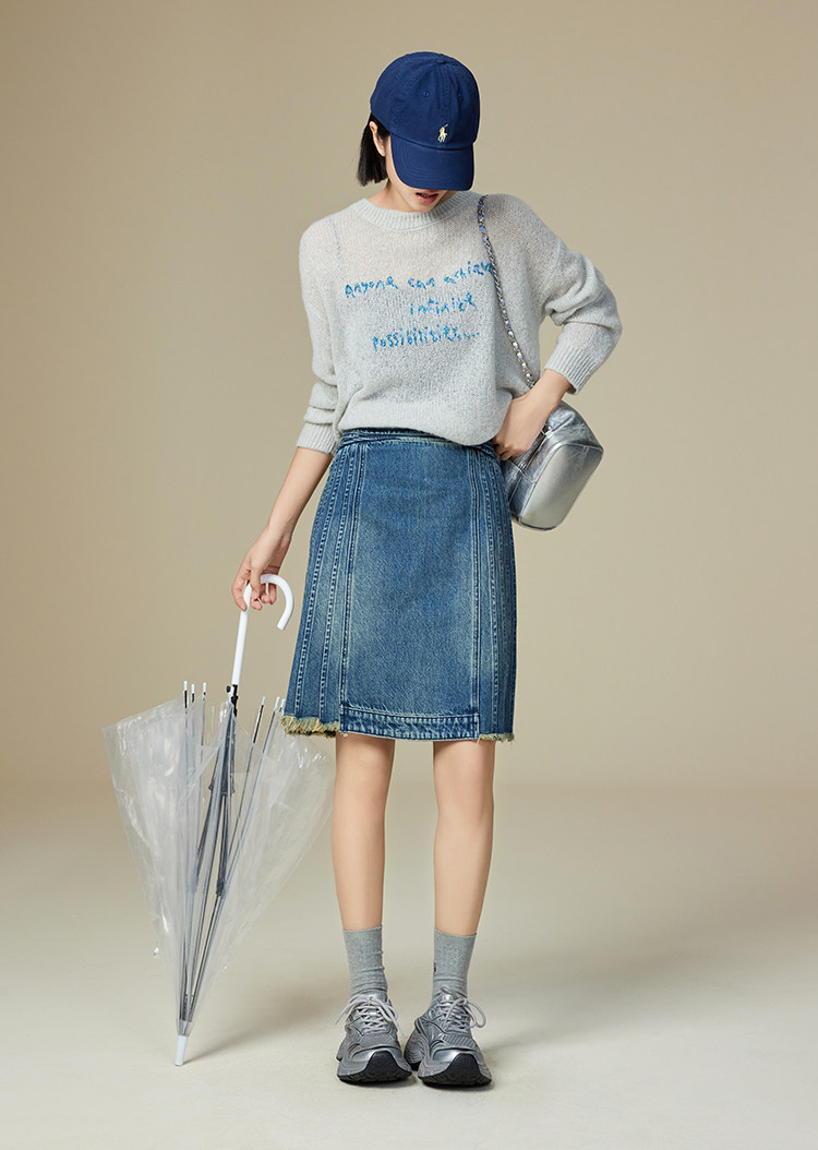 Meiyang【In Stock】Accordion Skirt Distressed Washed High Waist Patchwork Belt Frayed Denim Skirt