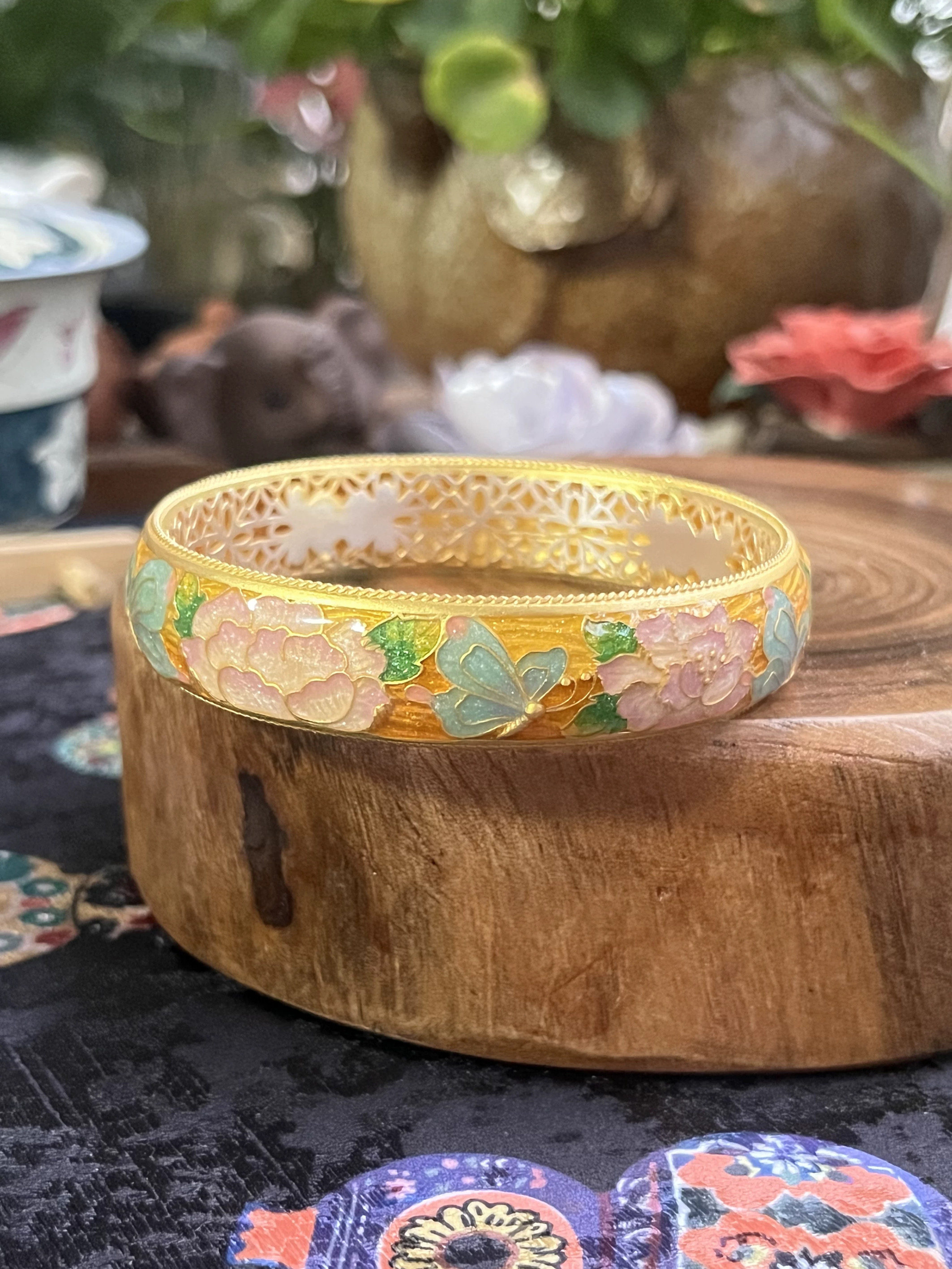 Butterfly Love Flower Fine Enamel Bracelet, 999 Pure Silver Bracelet for Women, Solid Hand-Carved Ancient Style, Pure Ethnic Style