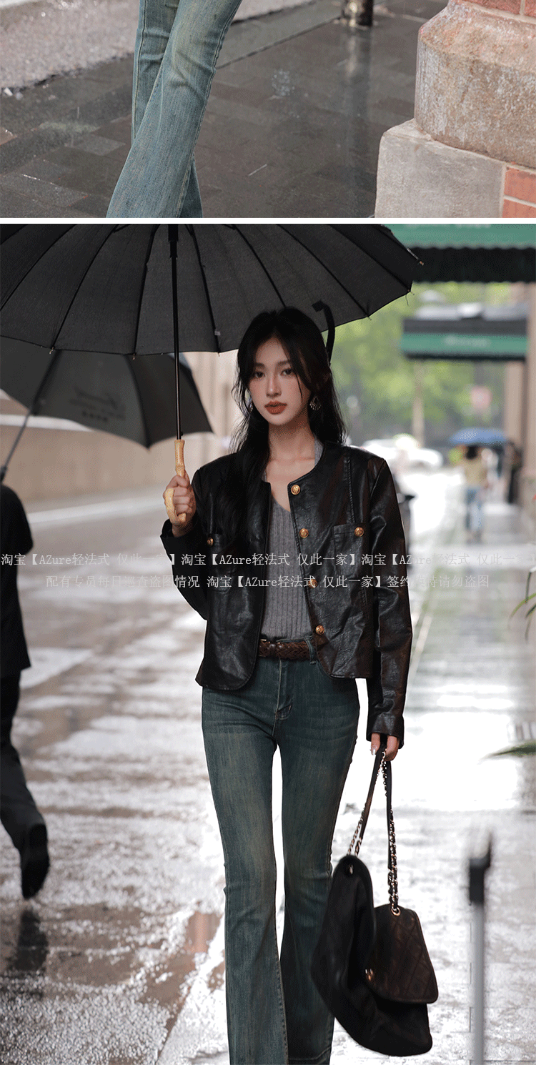 Azure French Retro Slim-Fit Leather Jacket, Chanel-Style Black and Gold Commuter Pu Leather Coat, Short Thin Biker Jacket