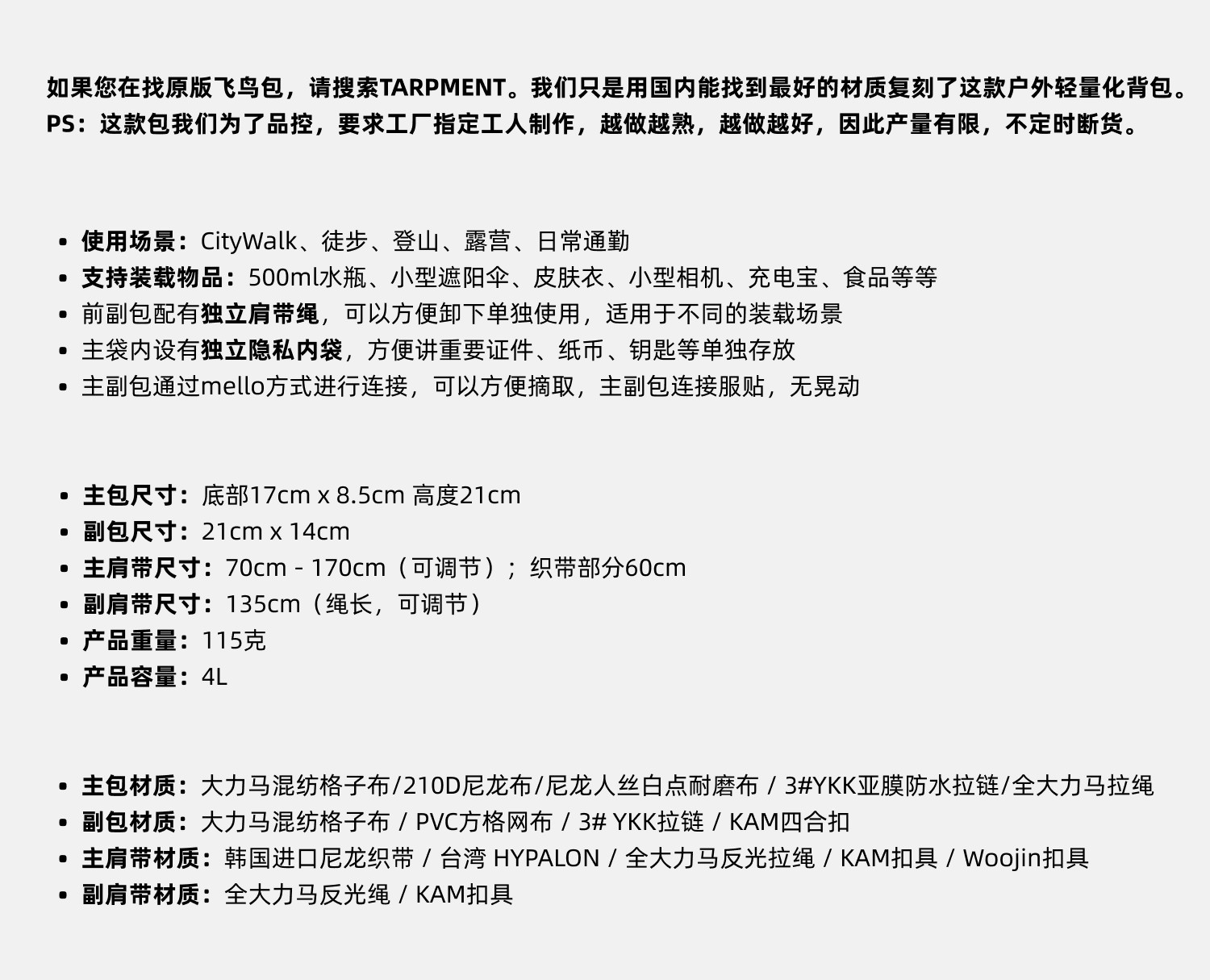 Outdoor Lightweight Camping and Hiking Crossbody Bag, Dyneema Blend Plaid Fabric Tarpment Bird Bag