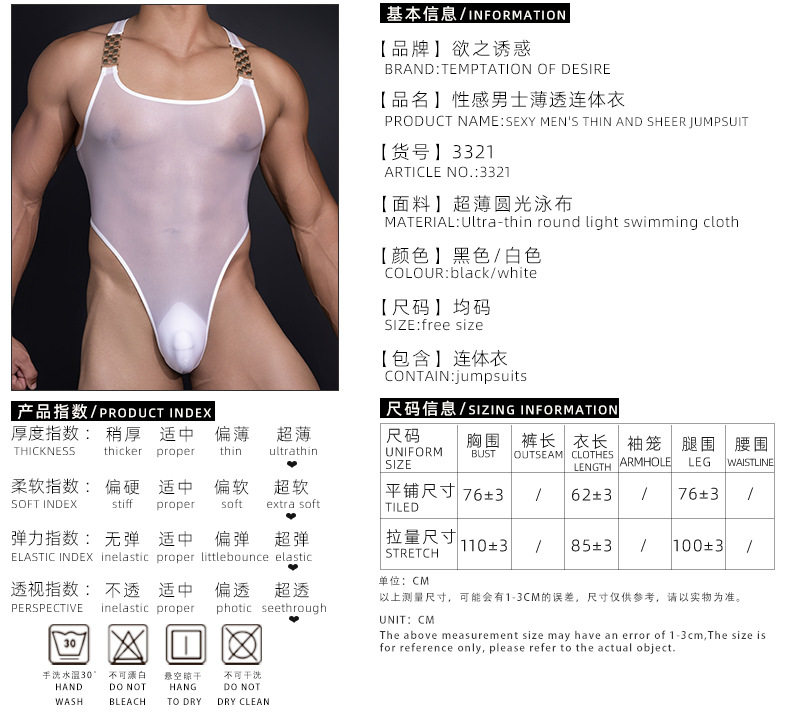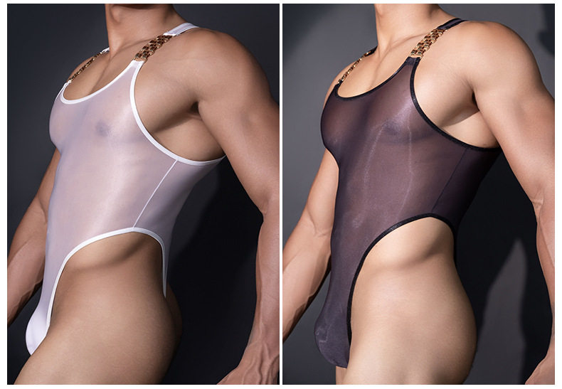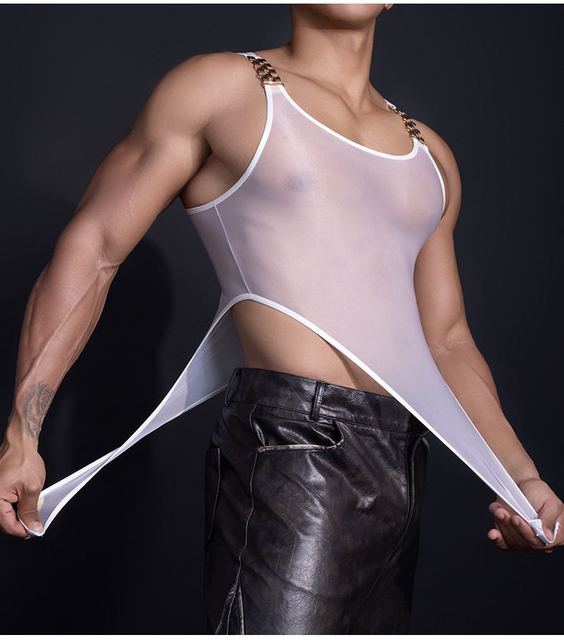 Men's Sexy Transparent Vest Jumpsuit with Snap Button Crotch Opening, Silky Transparent Underwear for Men