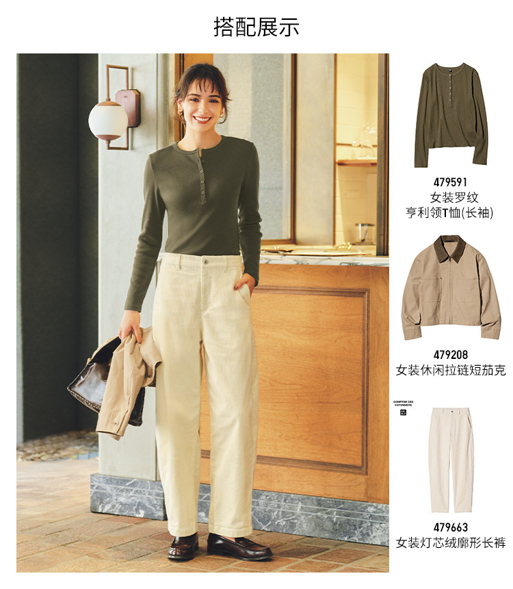 Uniqlo Women's Ribbed Henley T-Shirt/Long Sleeve Slim Fit Short Base Layer 479591 487908