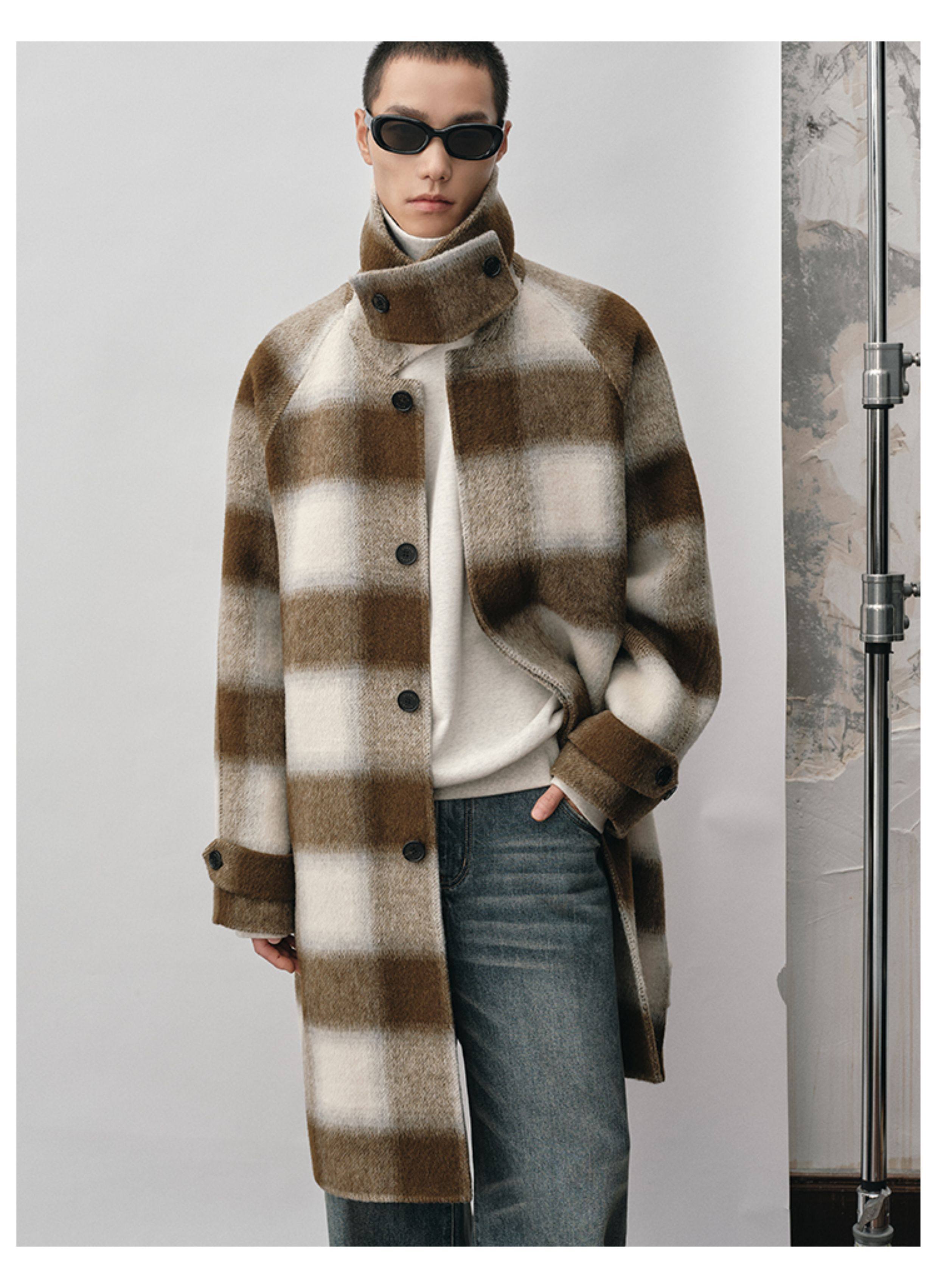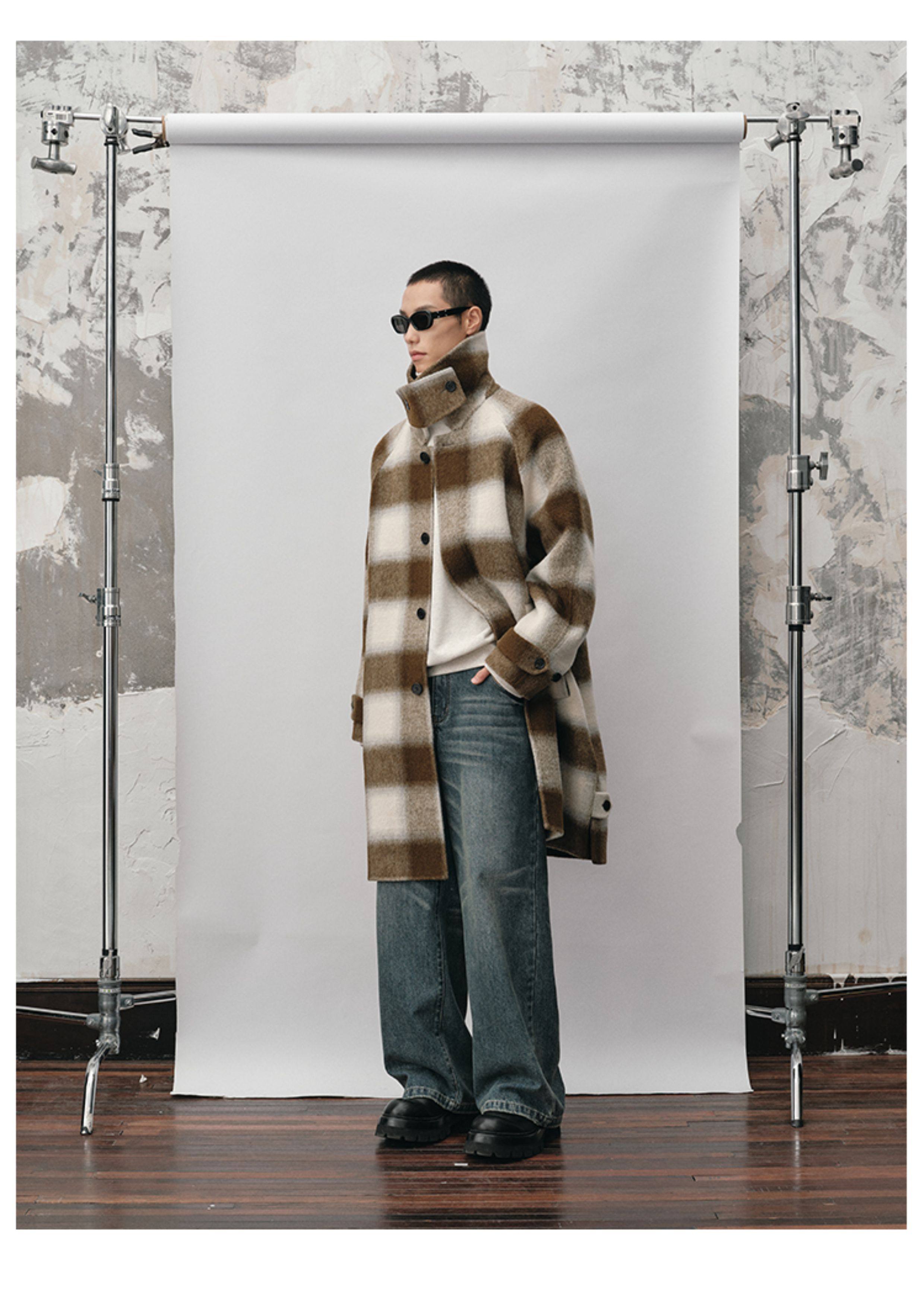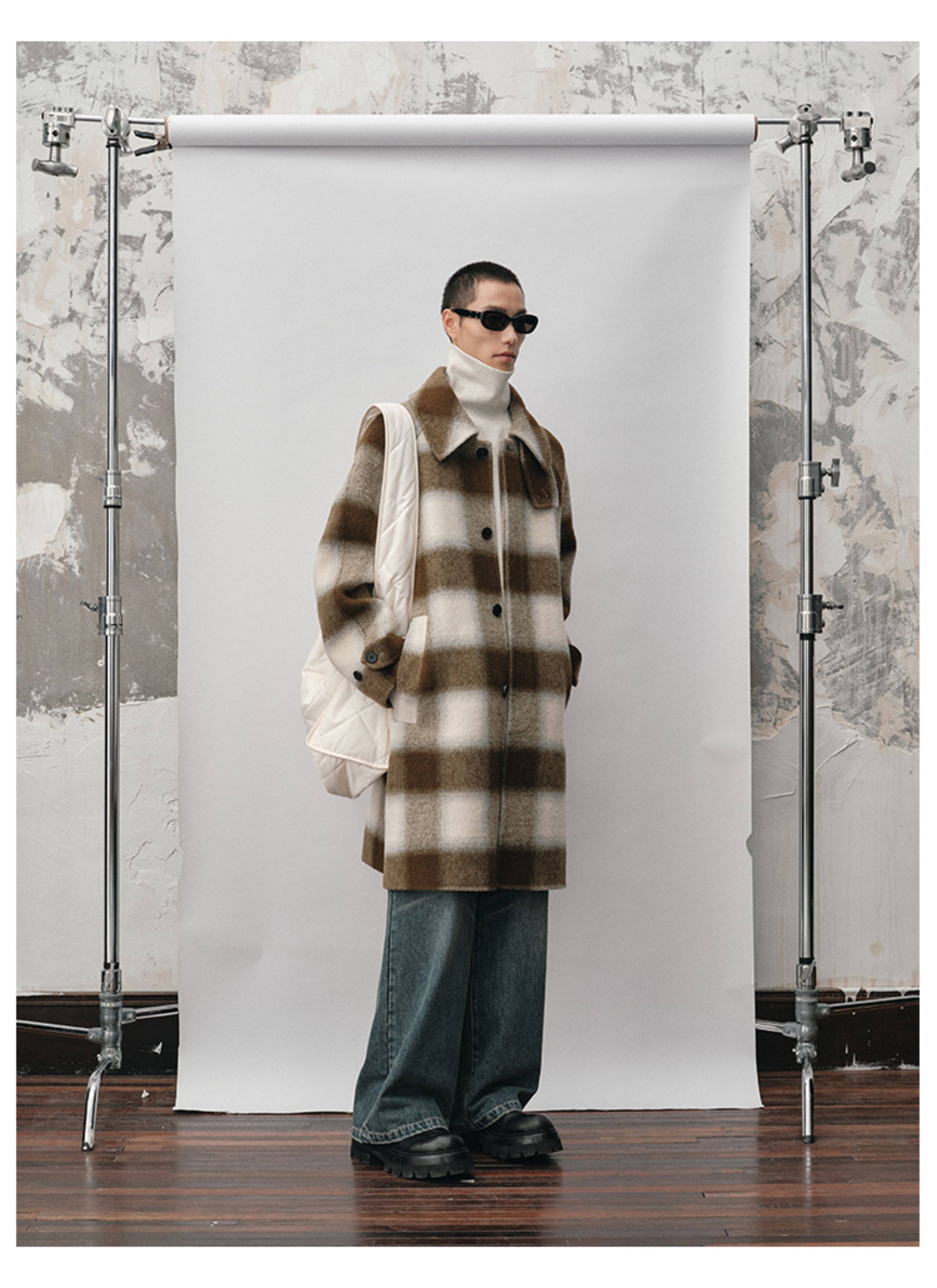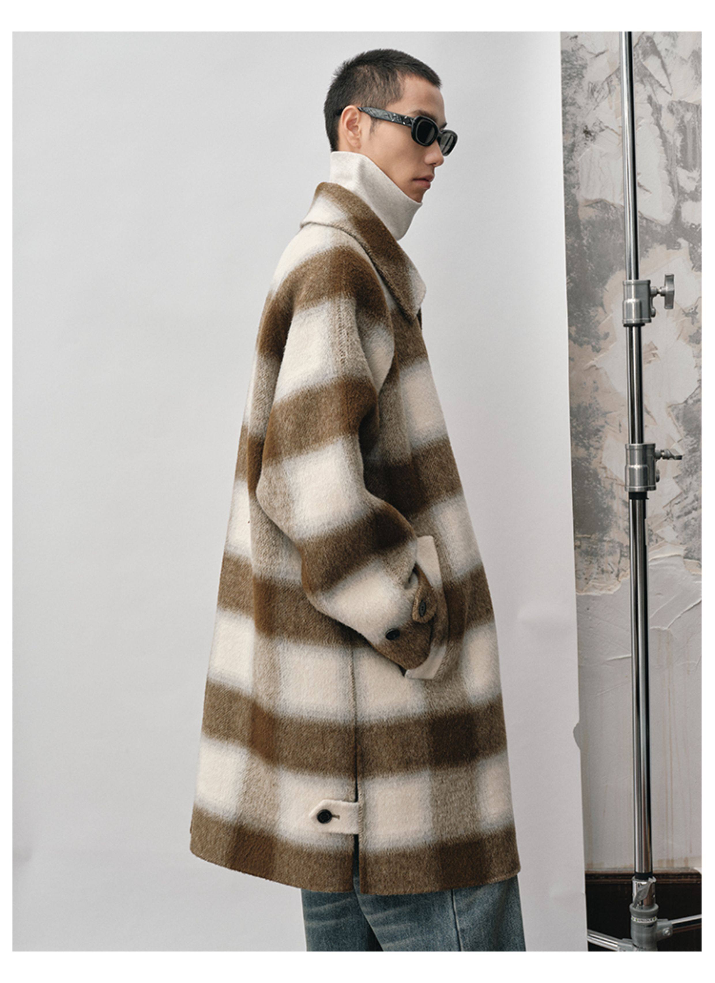 【Nans】Alpaca Wool Blend Mixed Color Plaid Texture Wide Square Collar with Tie Design Handmade Double-Sided Wool Coat