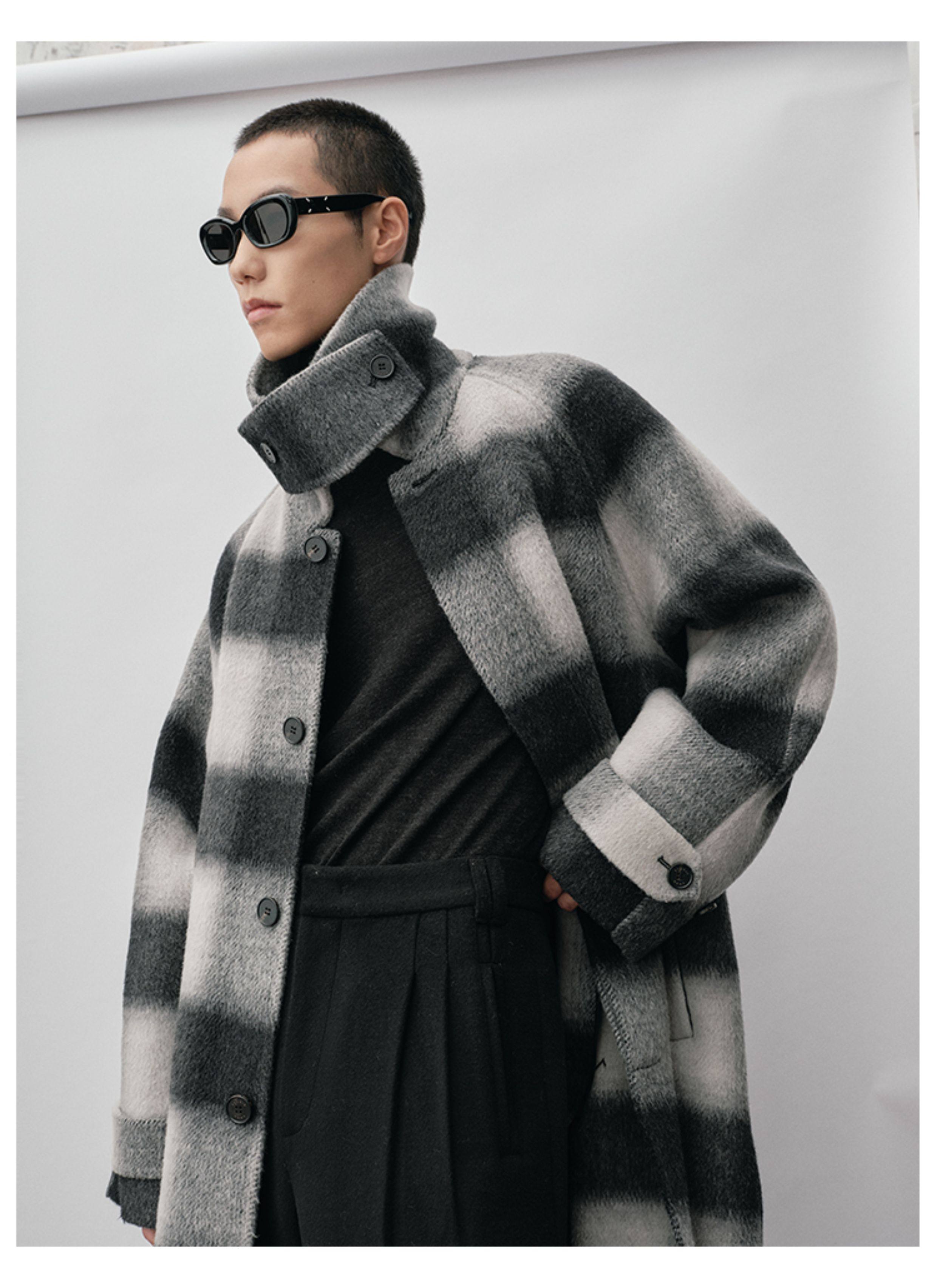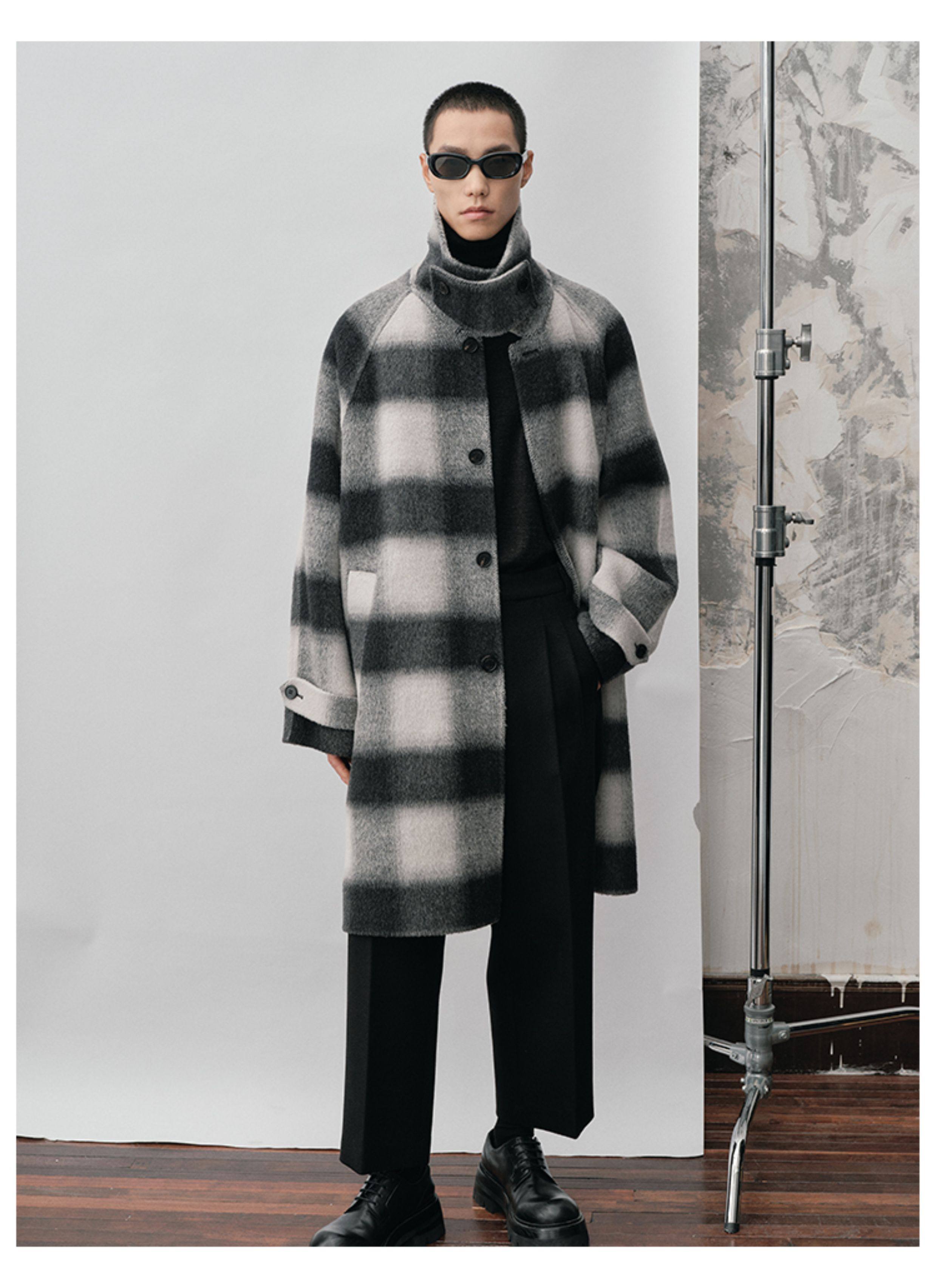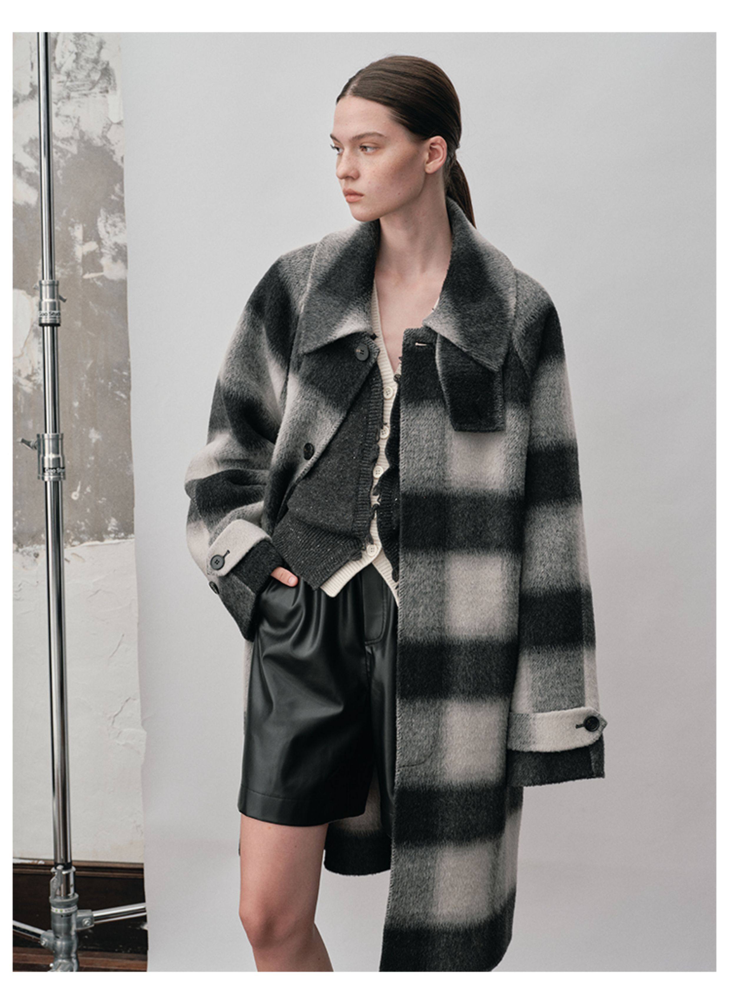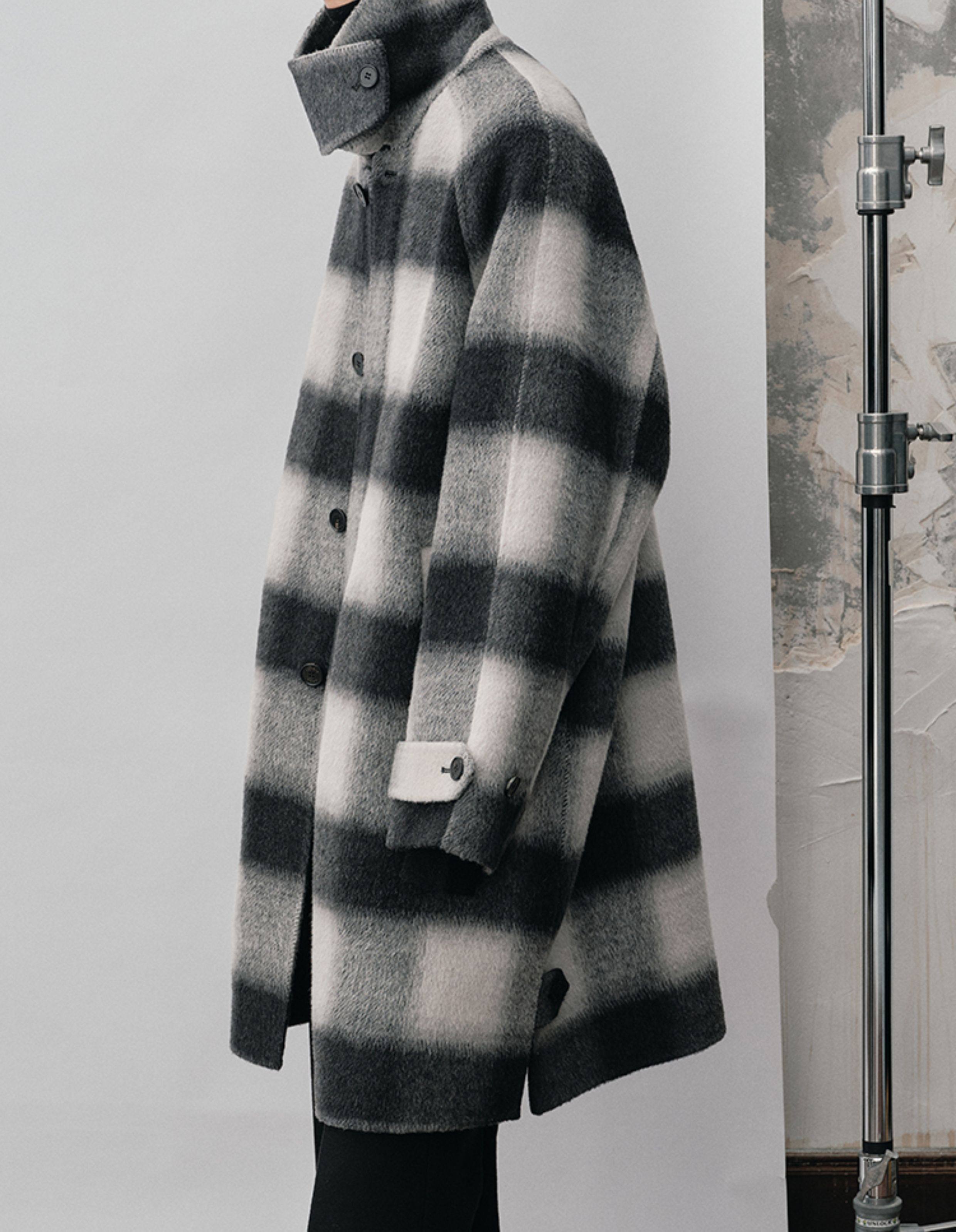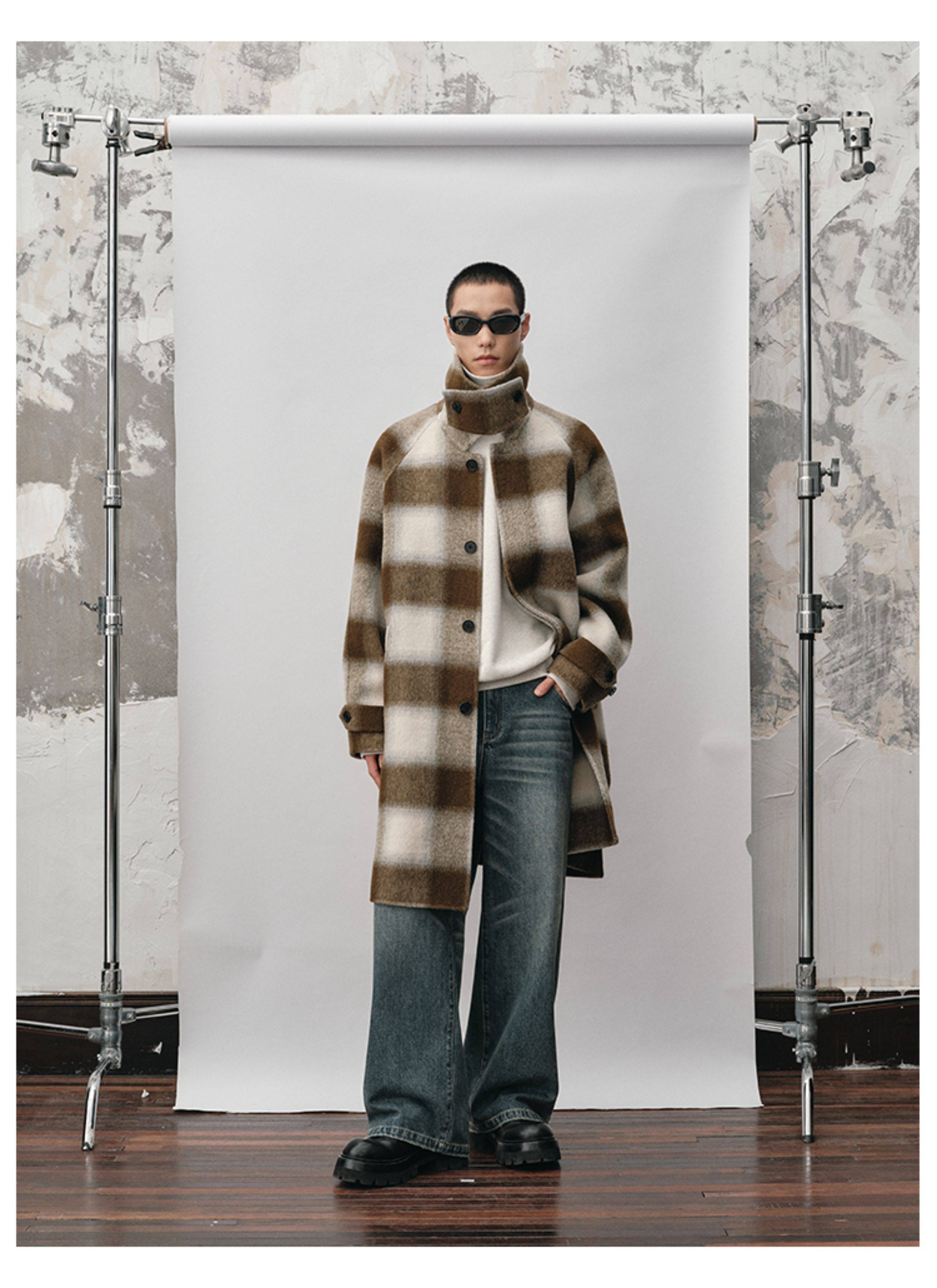 【Nans】Alpaca Wool Blend Mixed Color Plaid Texture Wide Square Collar with Tie Design Handmade Double-Sided Wool Coat