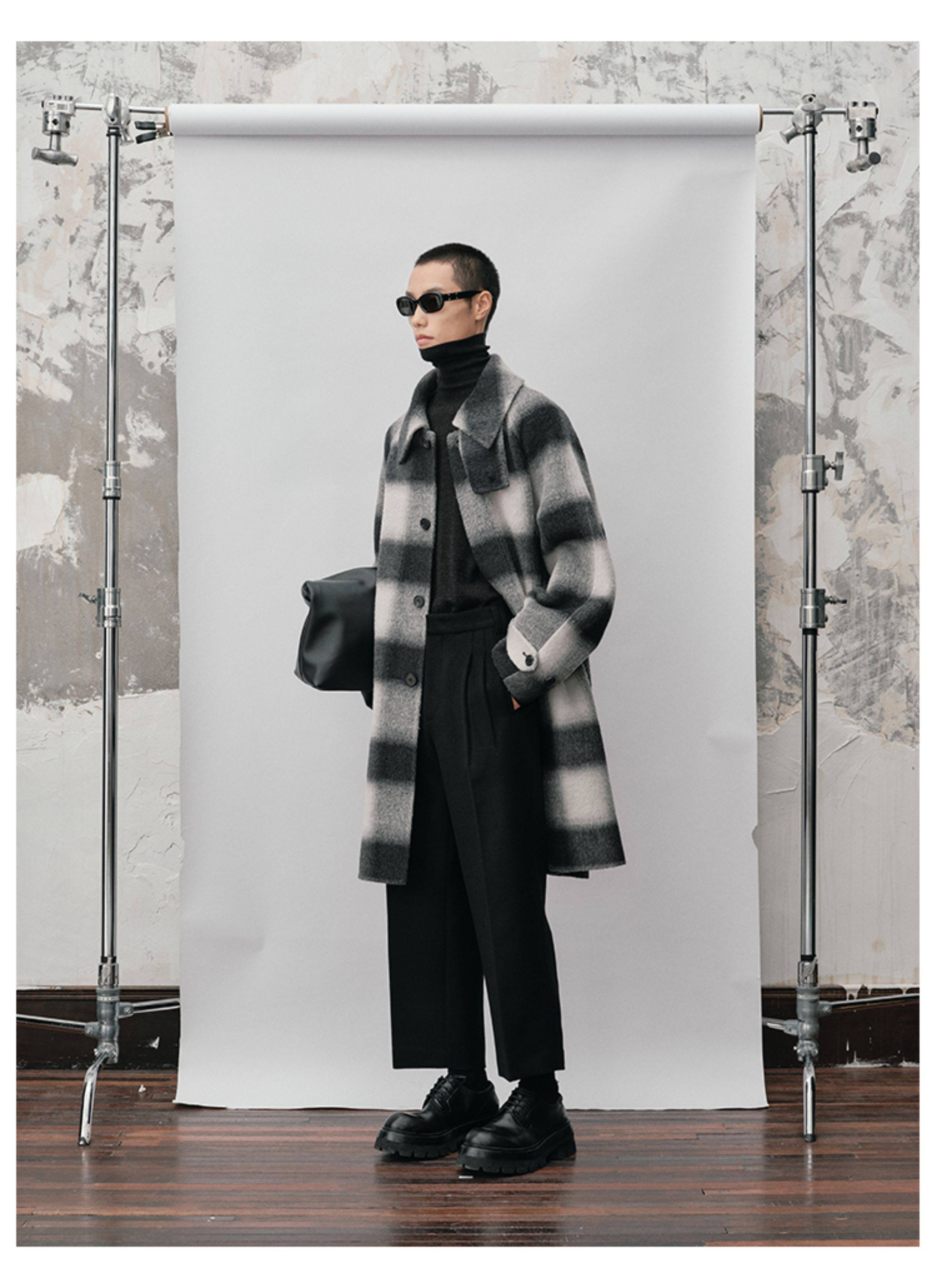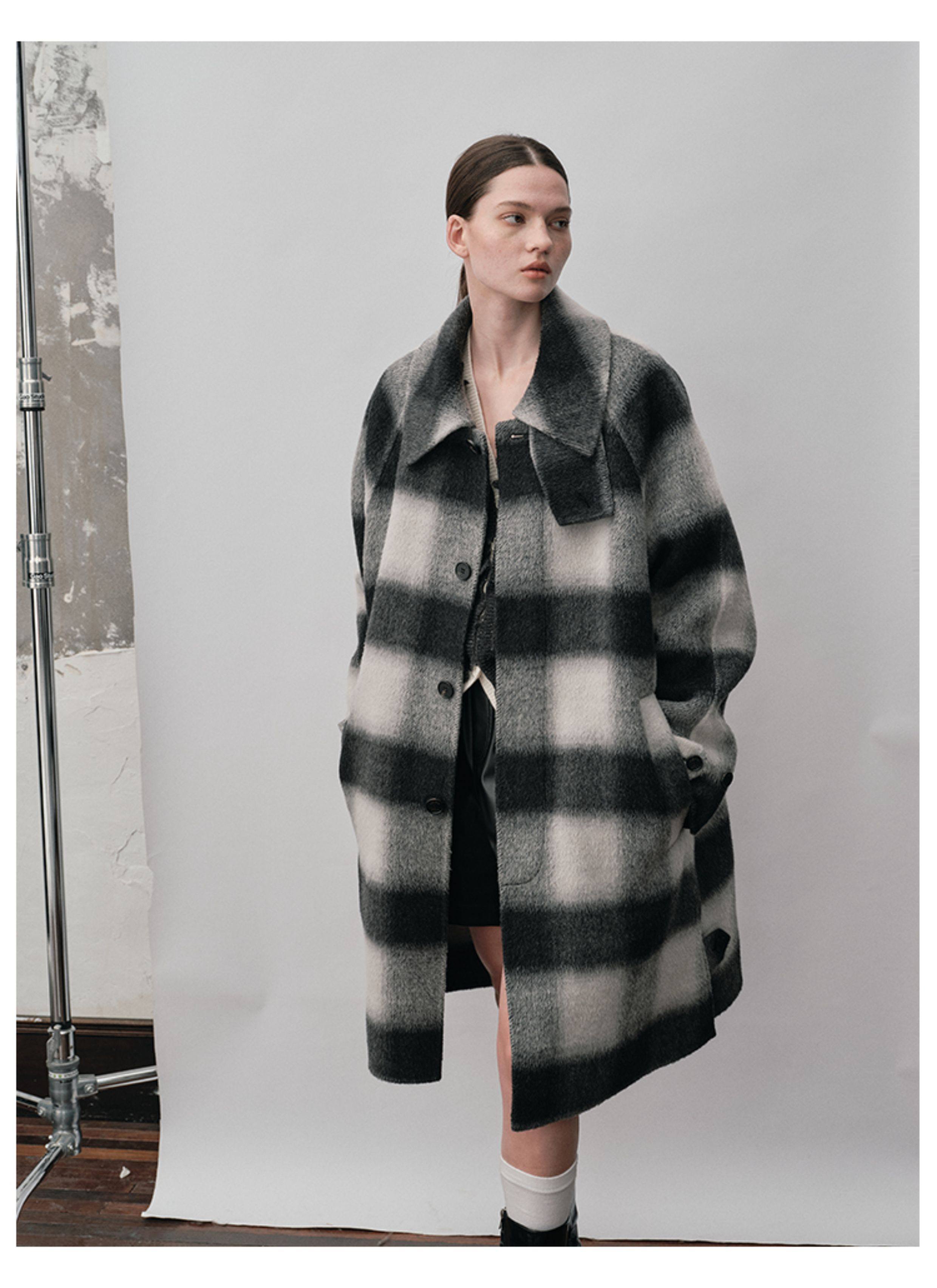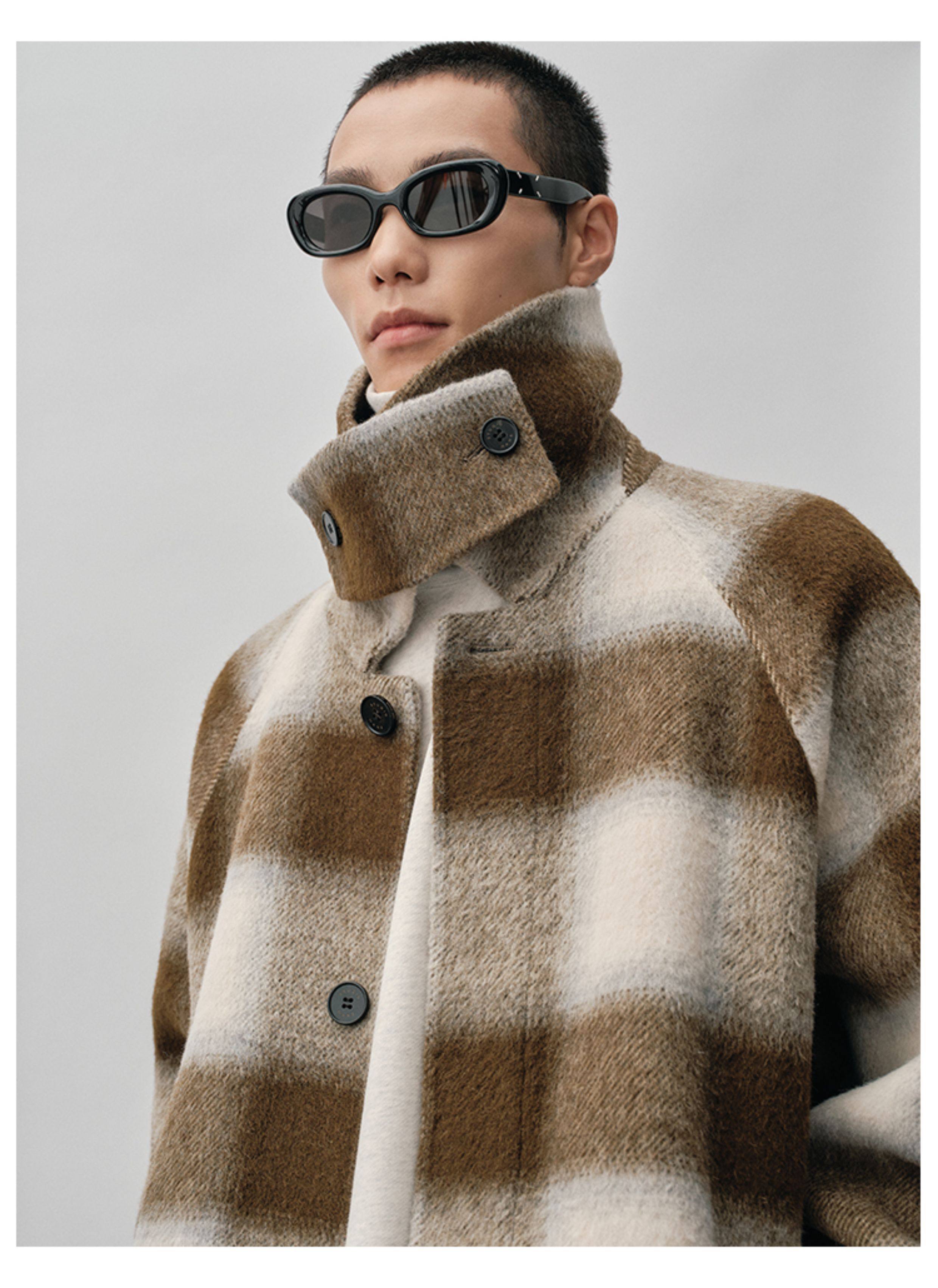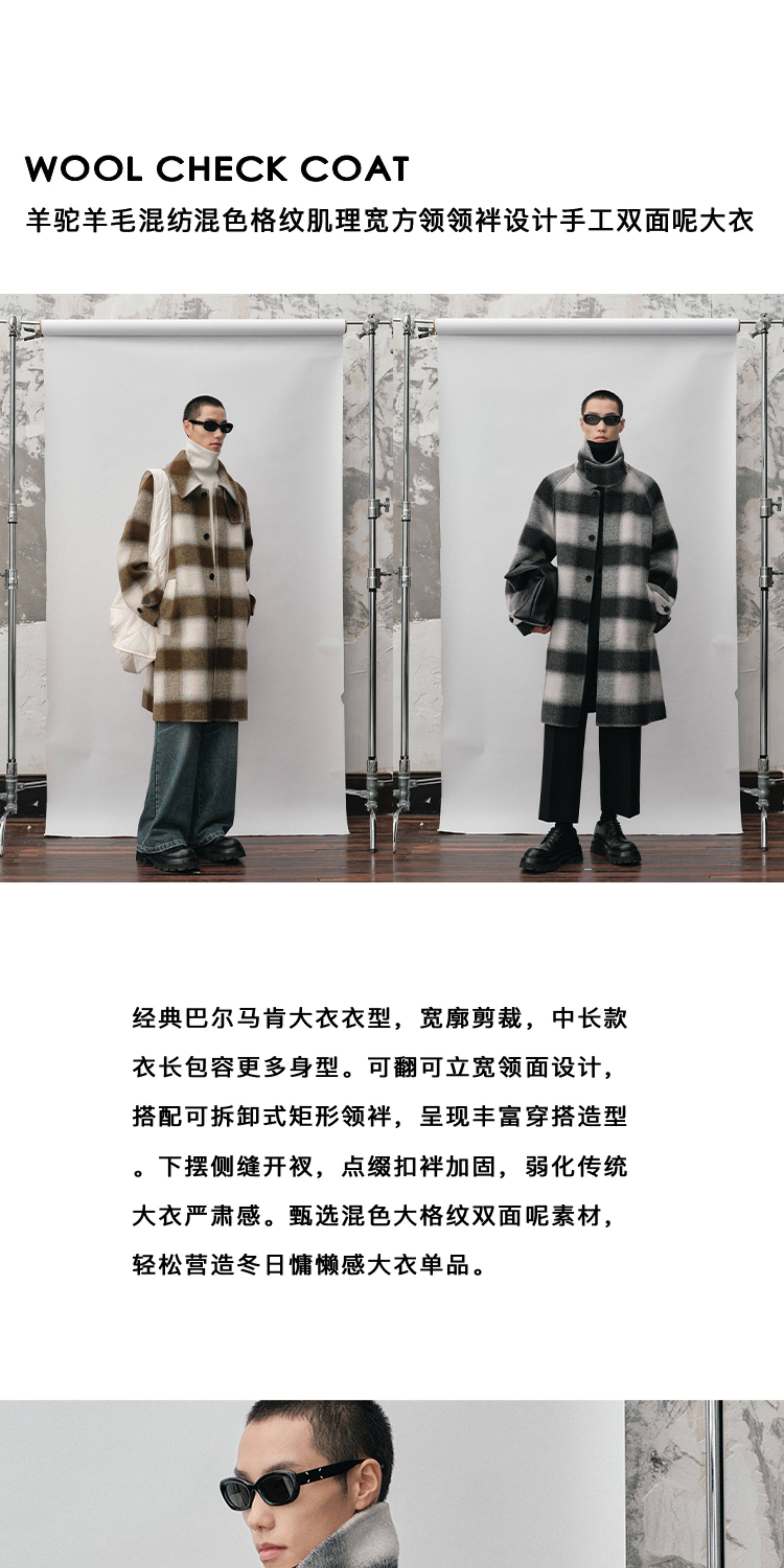 【Nans】Alpaca Wool Blend Mixed Color Plaid Texture Wide Square Collar with Tie Design Handmade Double-Sided Wool Coat