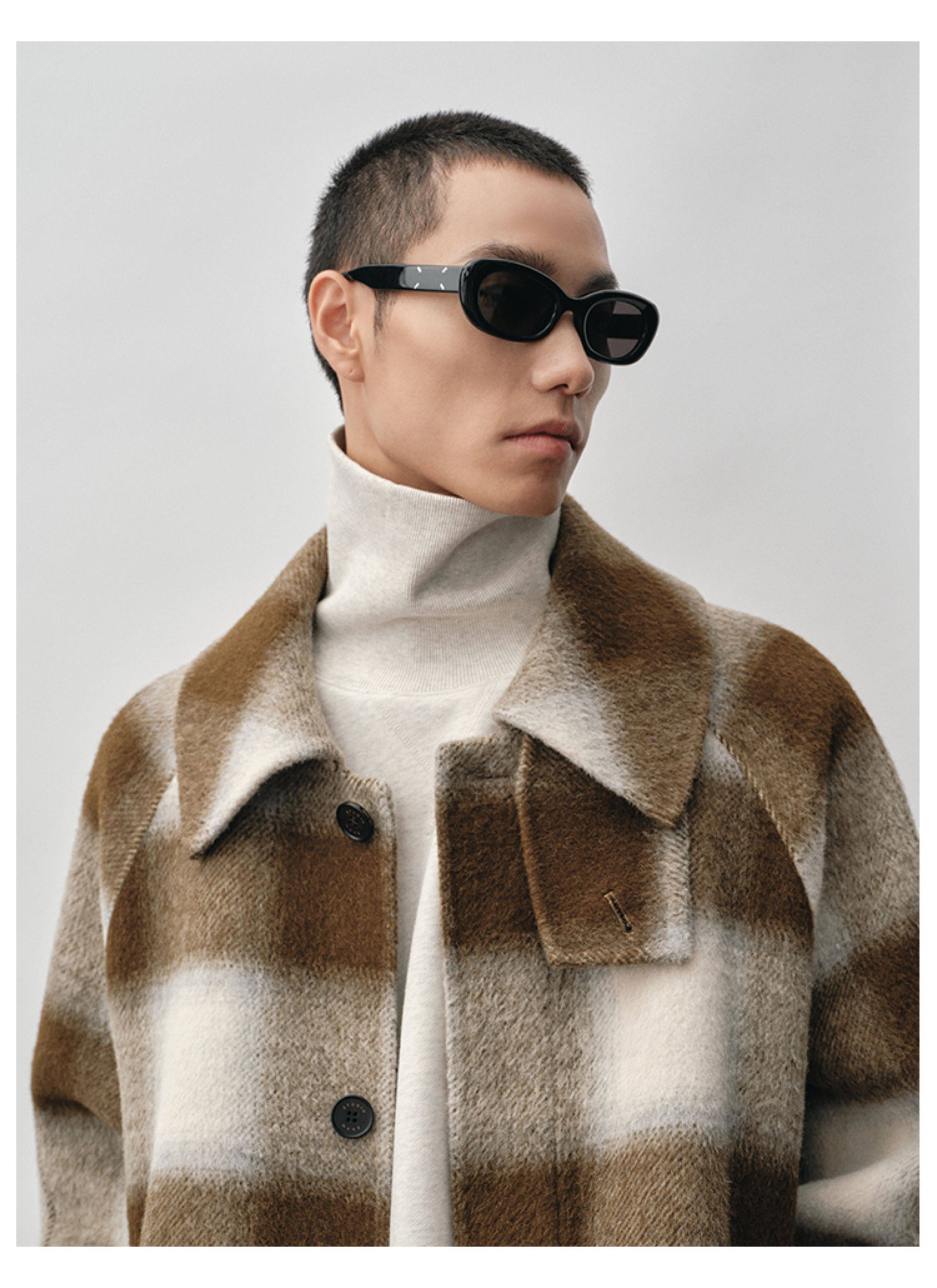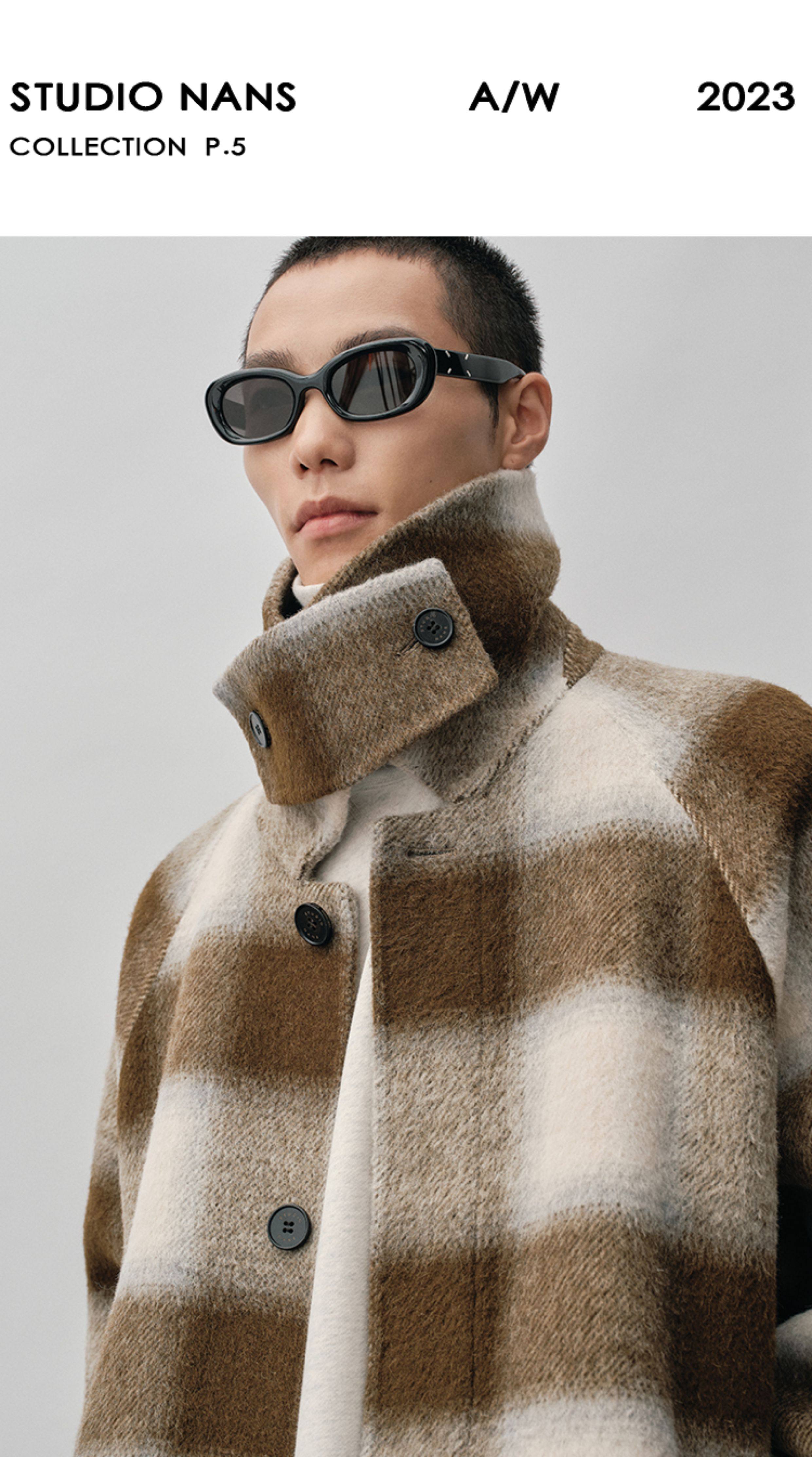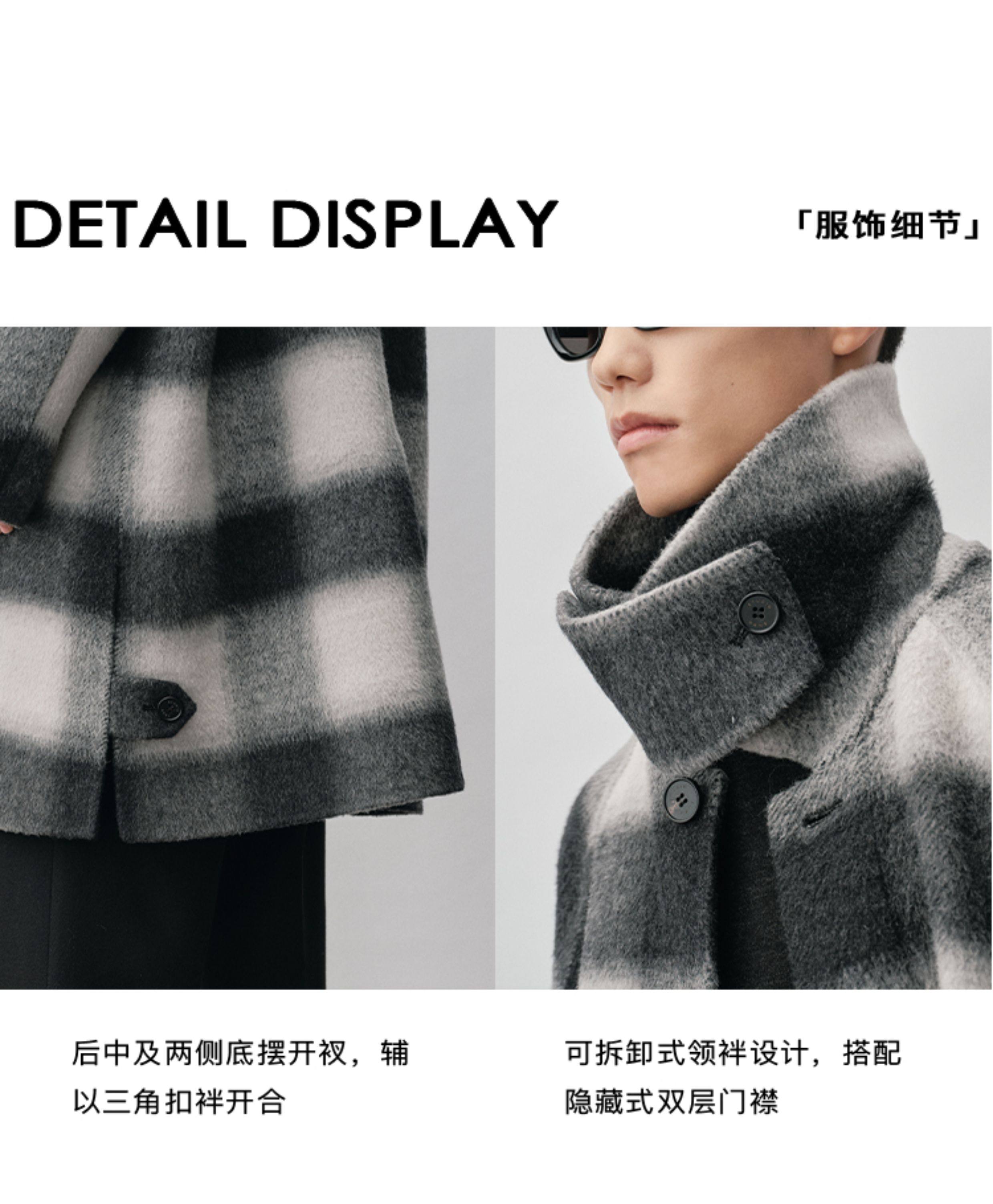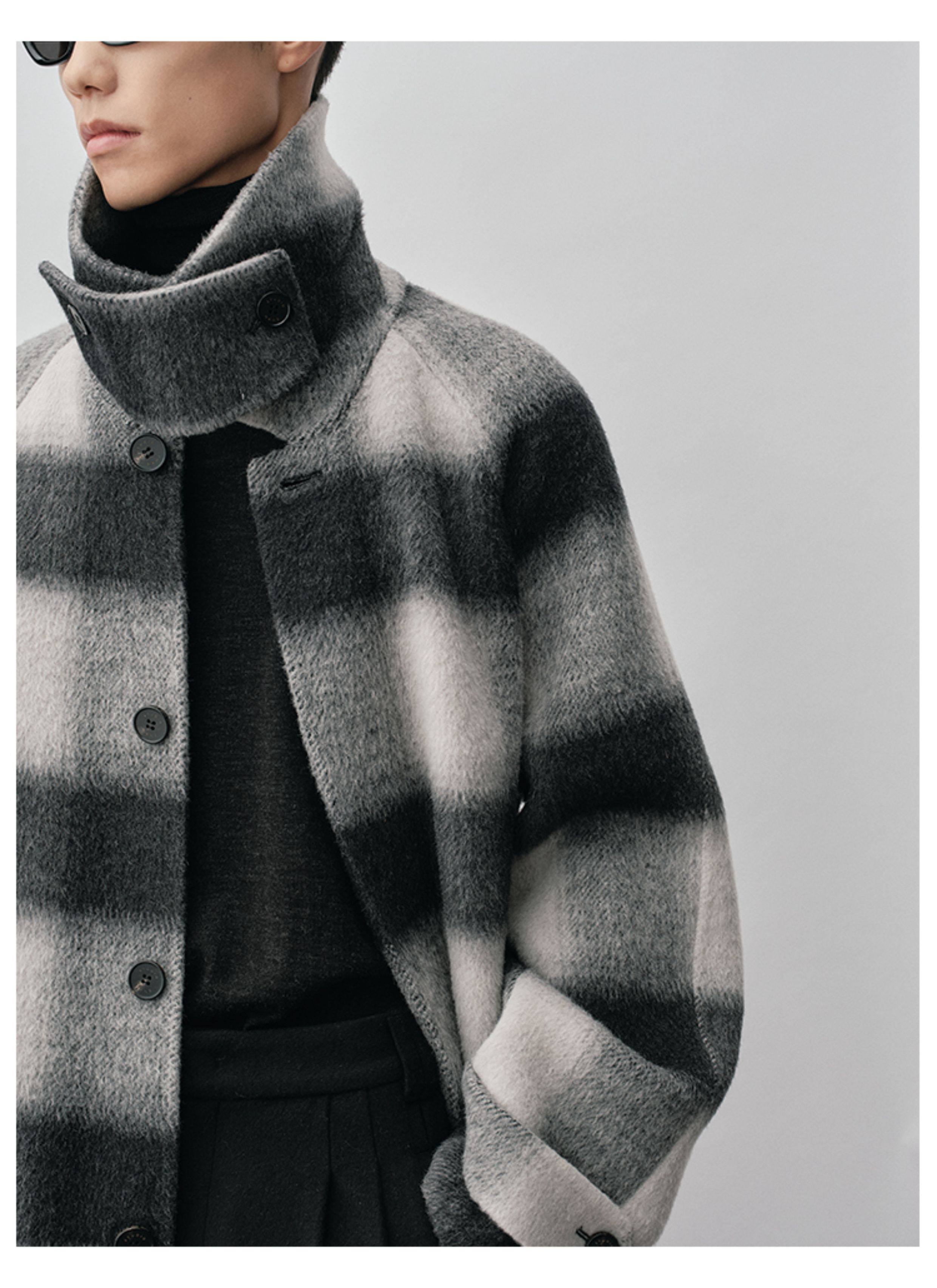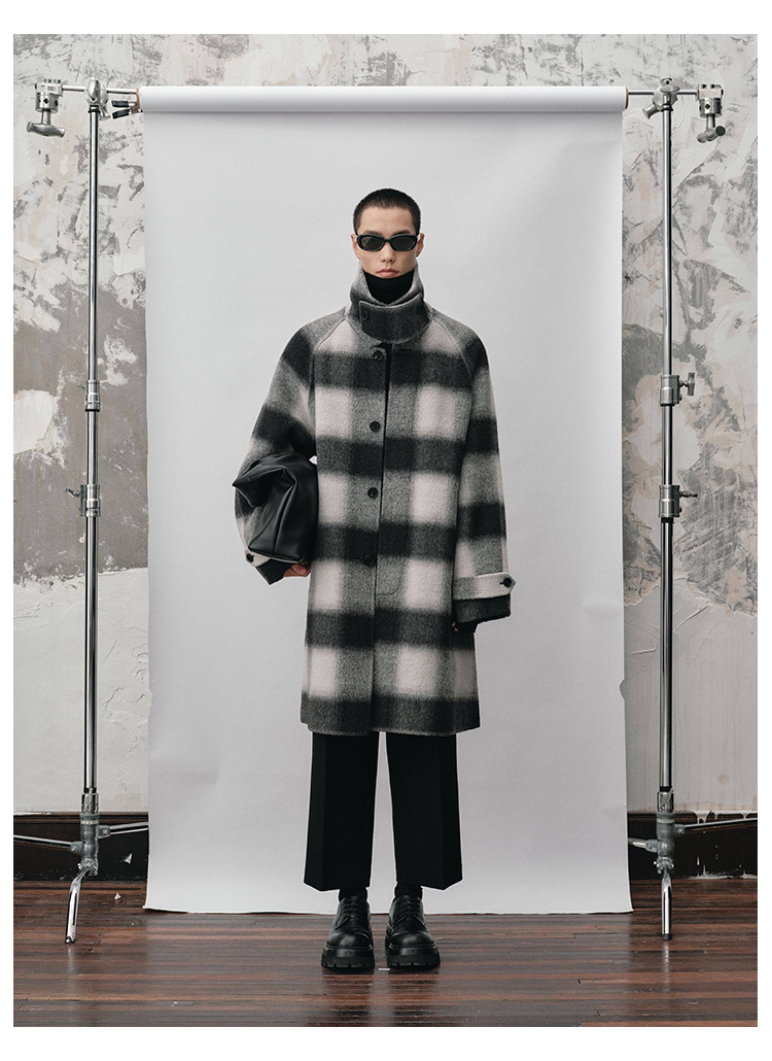 【Nans】Alpaca Wool Blend Mixed Color Plaid Texture Wide Square Collar with Tie Design Handmade Double-Sided Wool Coat