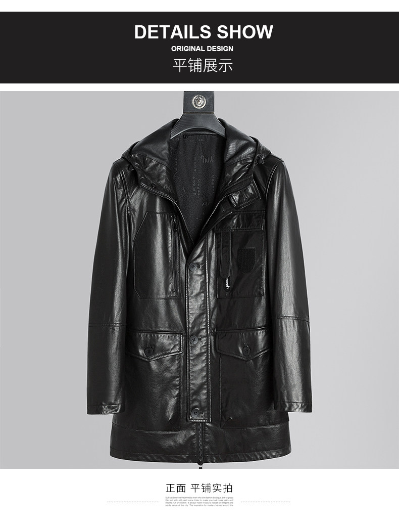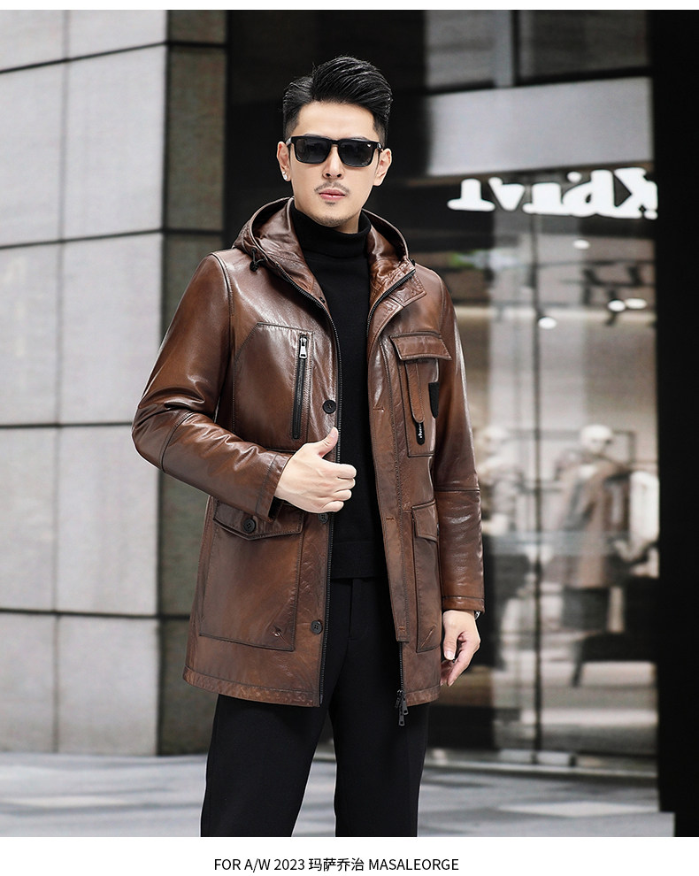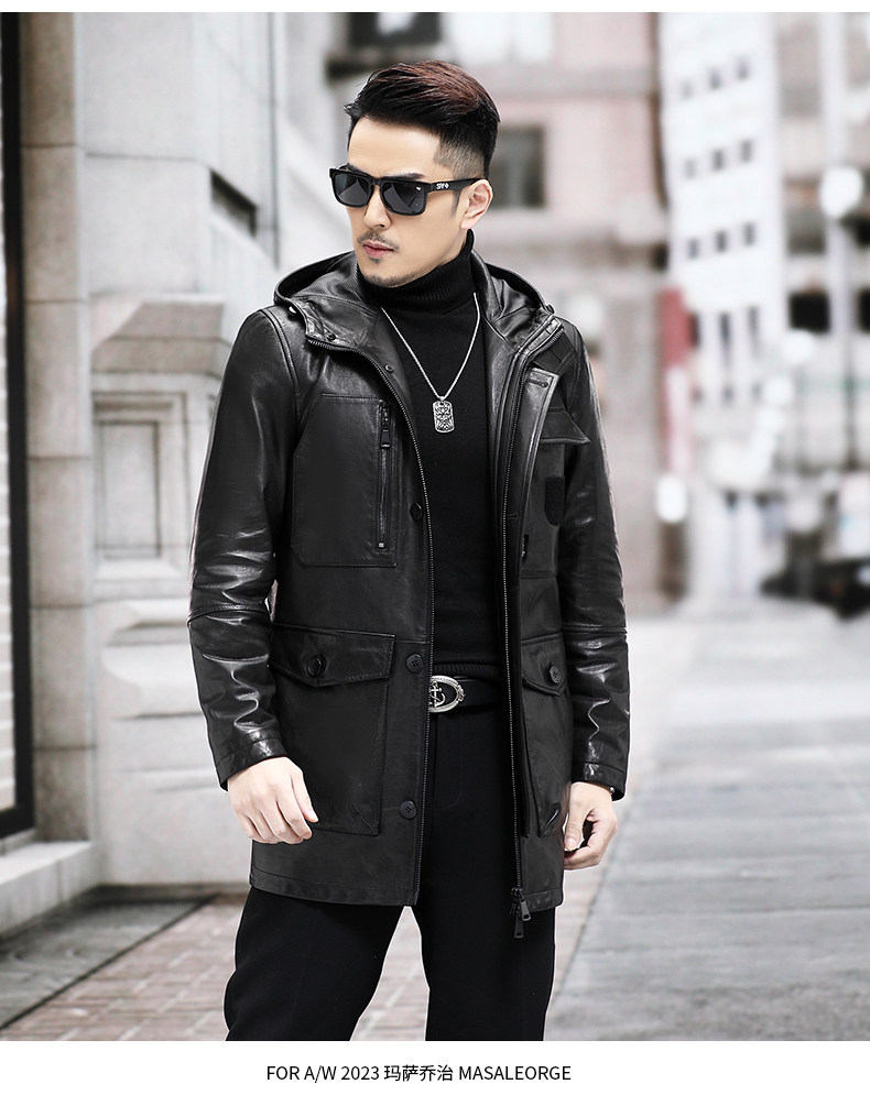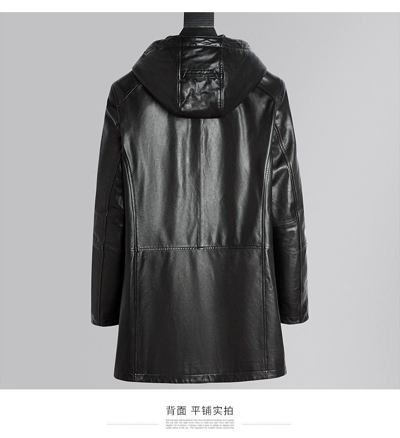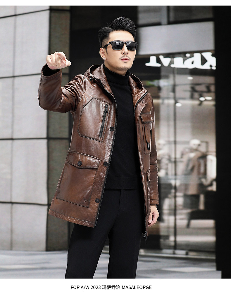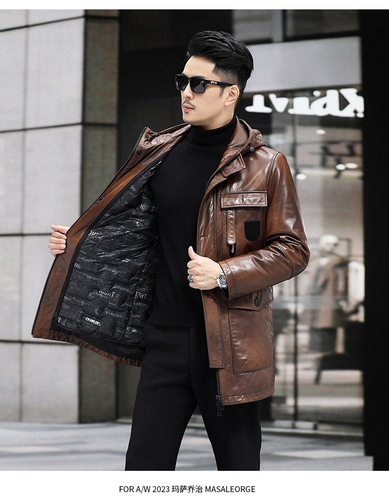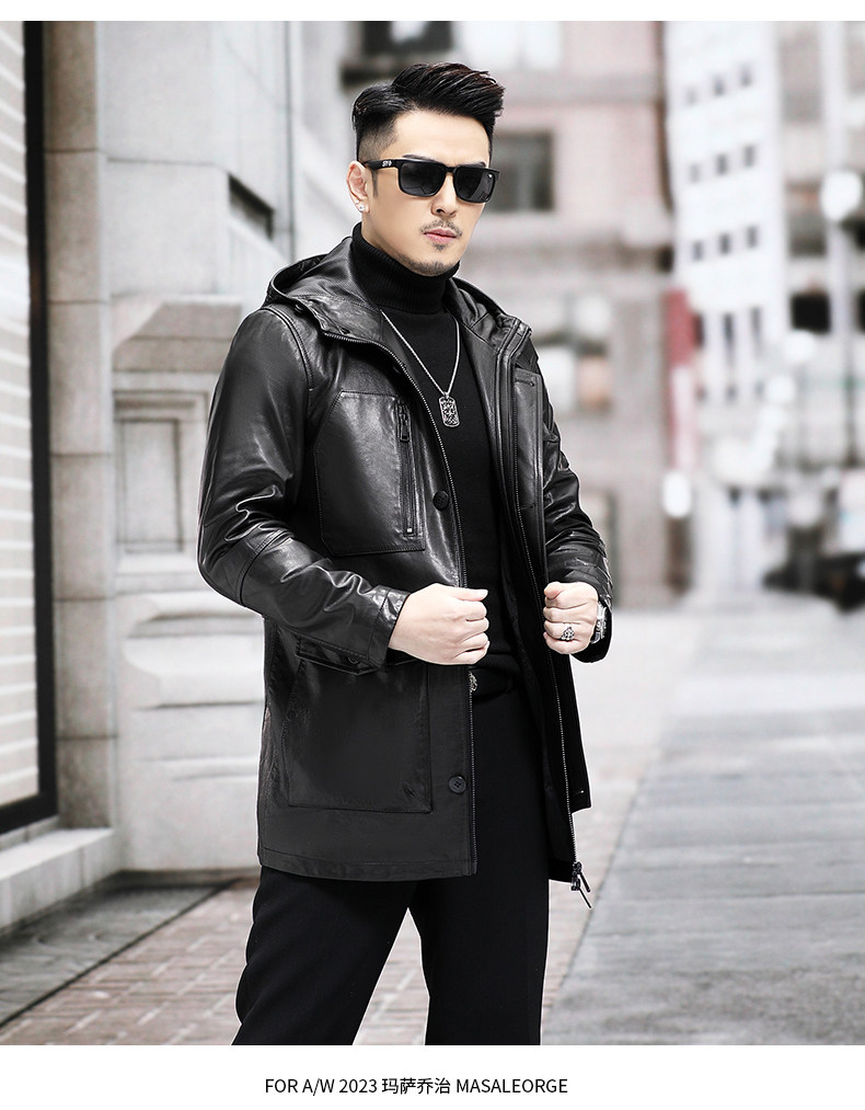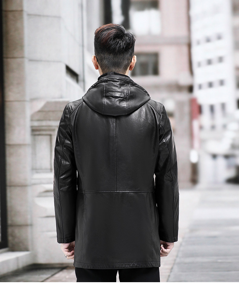 Goatskin Haining Genuine Leather Jacket for Men, Mid-Length Slim-Fit Hooded Trench Coat with Detachable Thick Goose down Liner