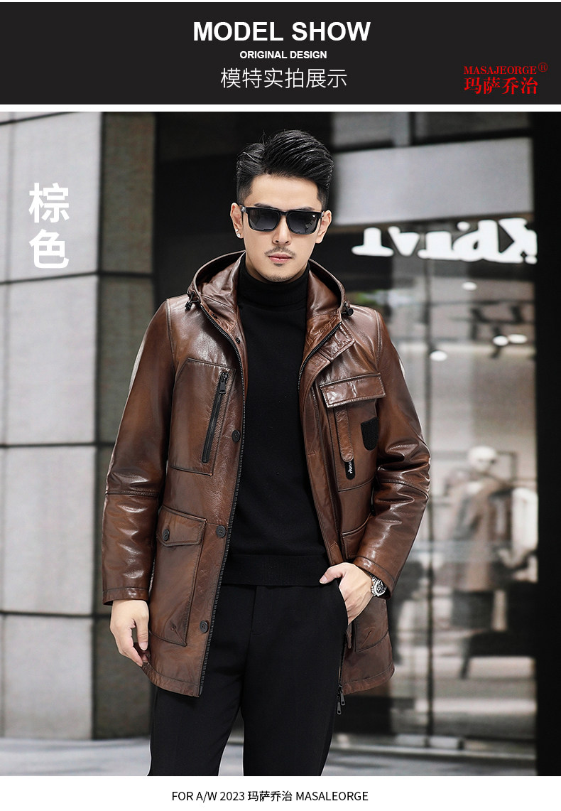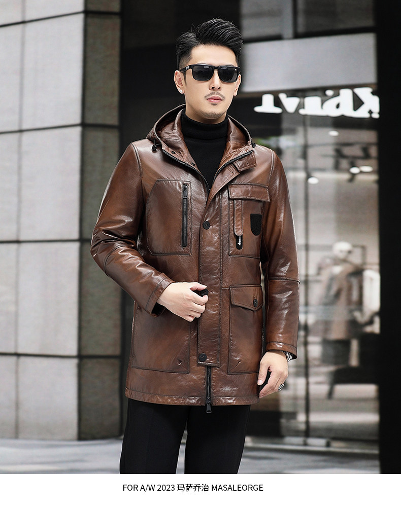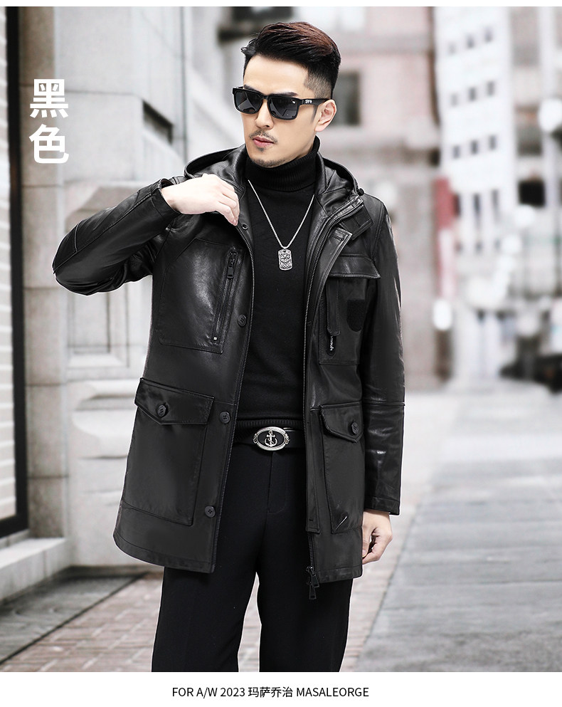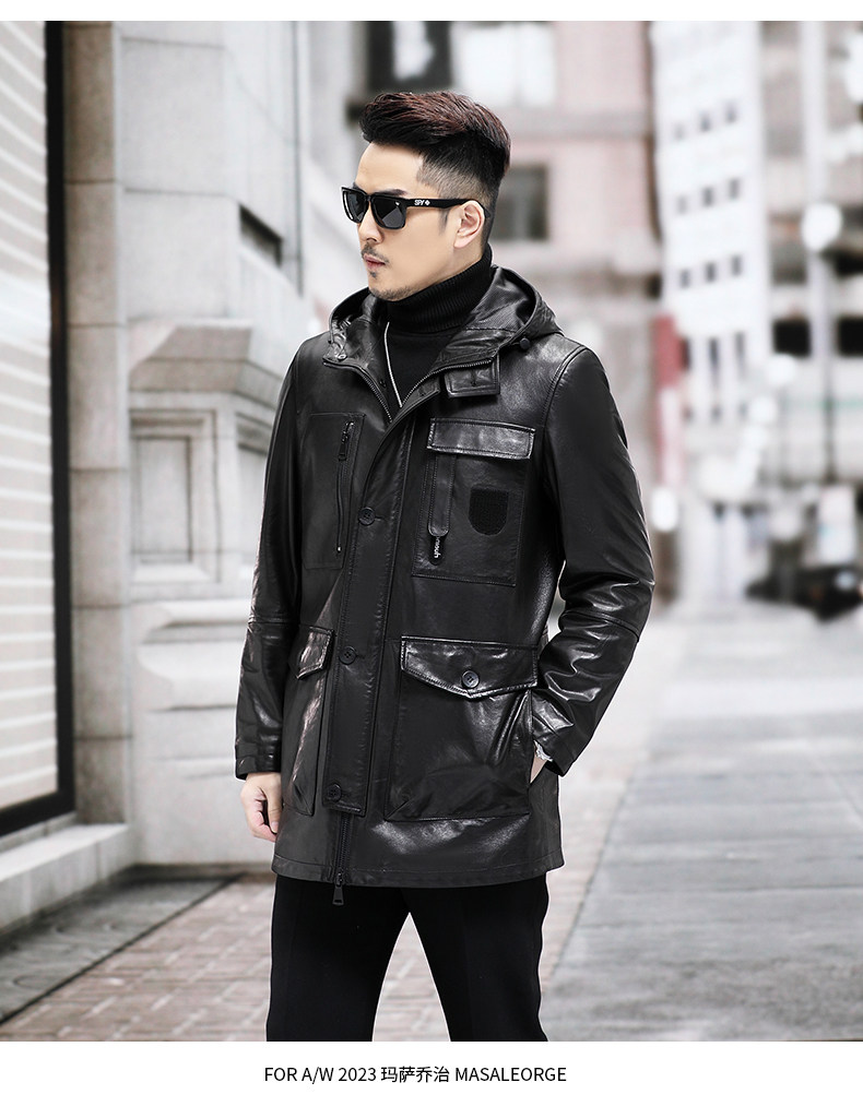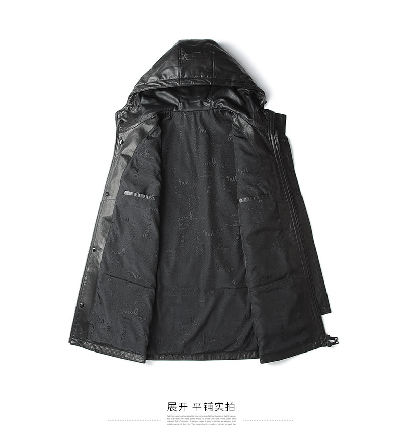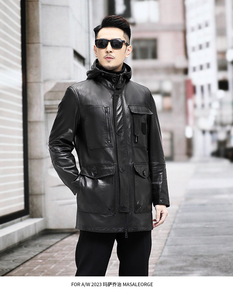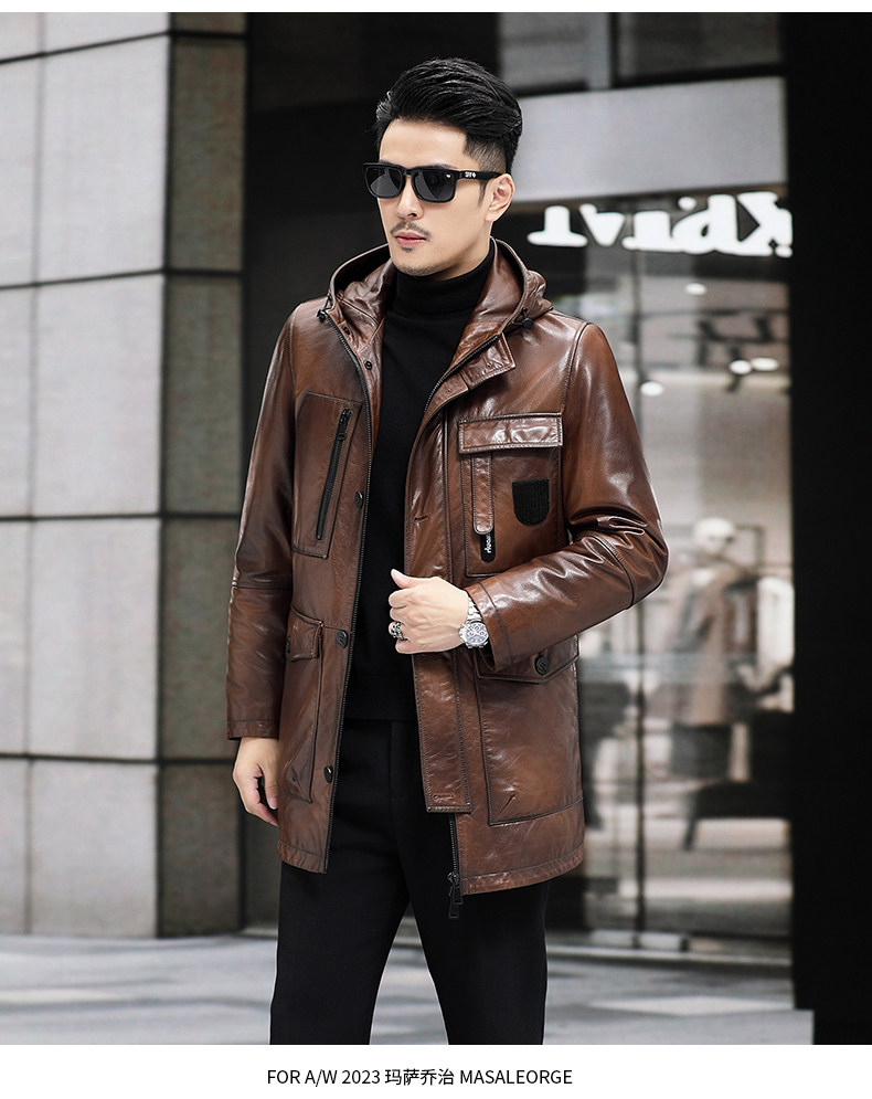 Goatskin Haining Genuine Leather Jacket for Men, Mid-Length Slim-Fit Hooded Trench Coat with Detachable Thick Goose down Liner