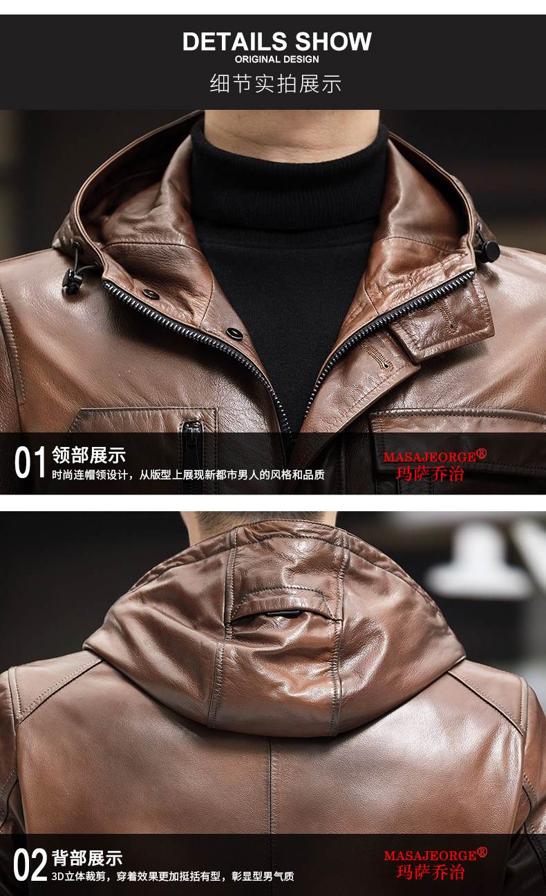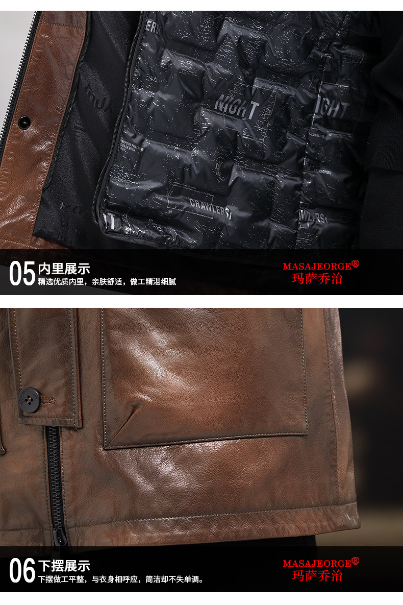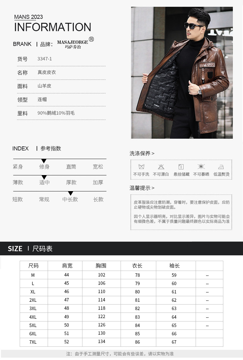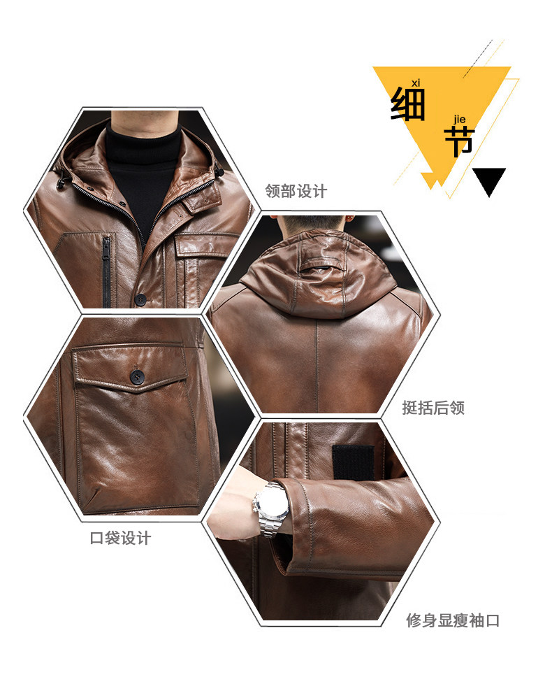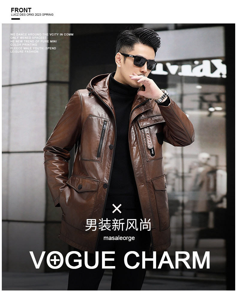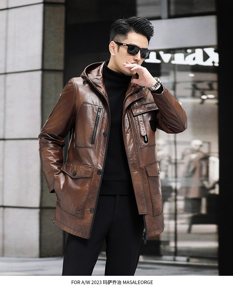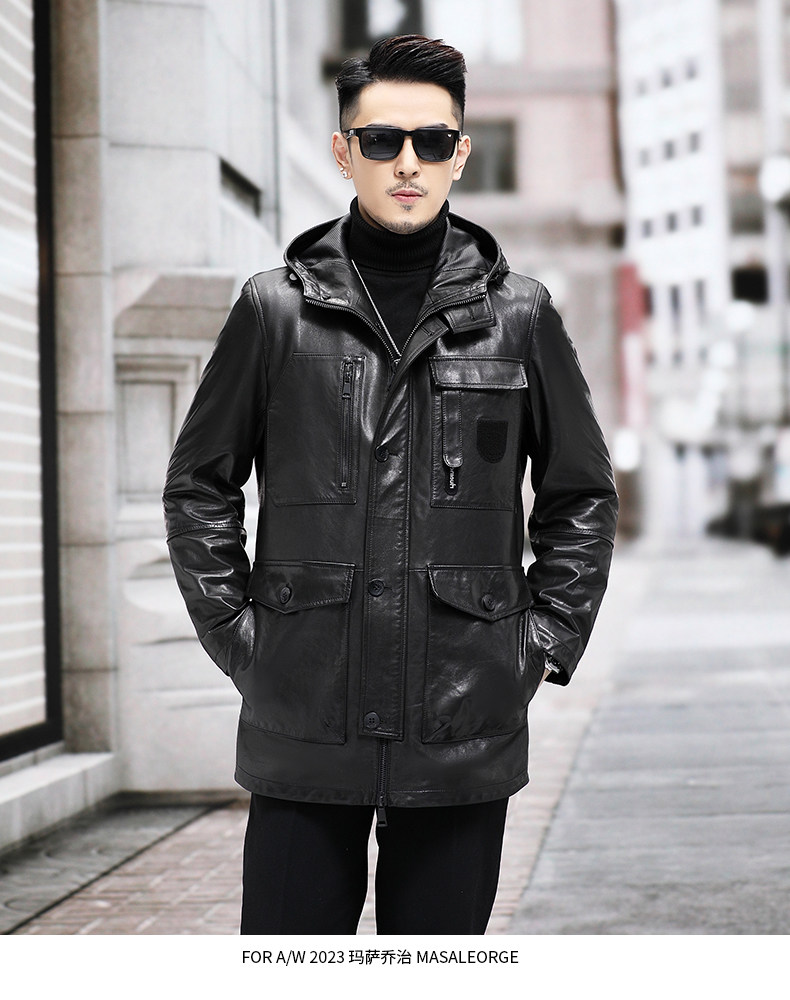 Goatskin Haining Genuine Leather Jacket for Men, Mid-Length Slim-Fit Hooded Trench Coat with Detachable Thick Goose down Liner