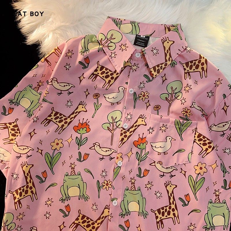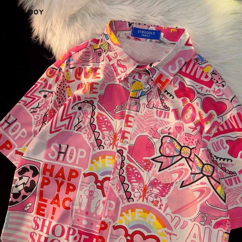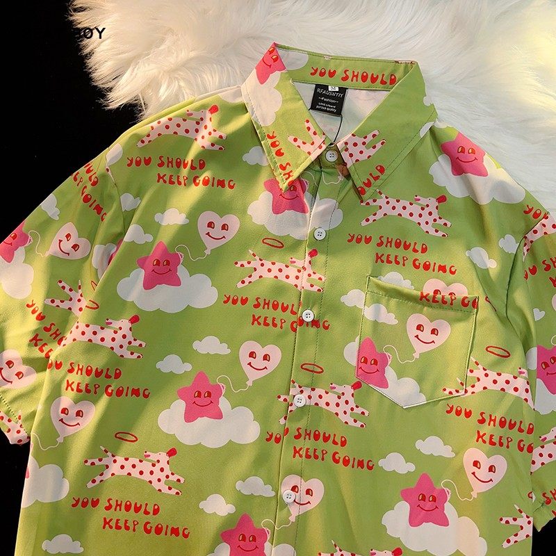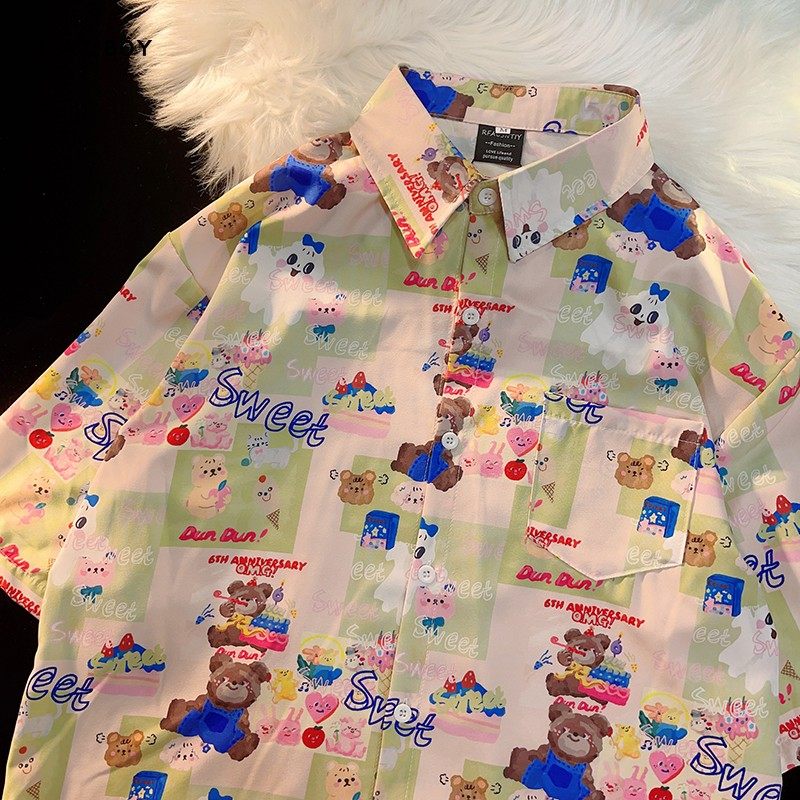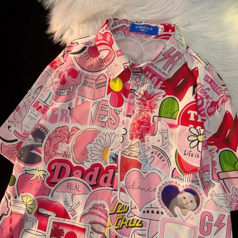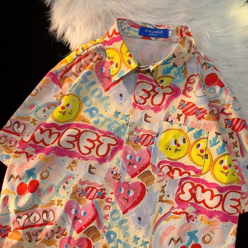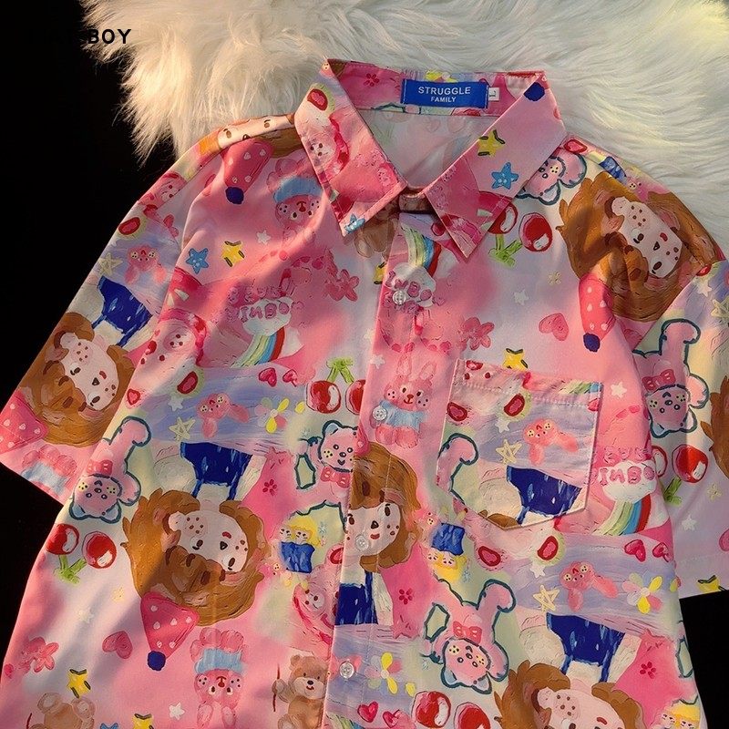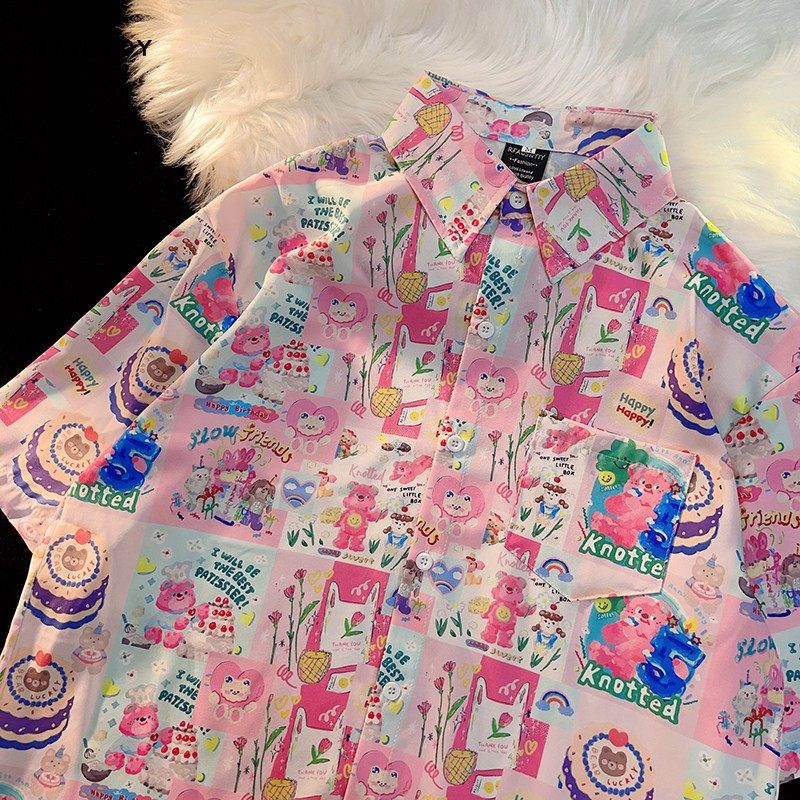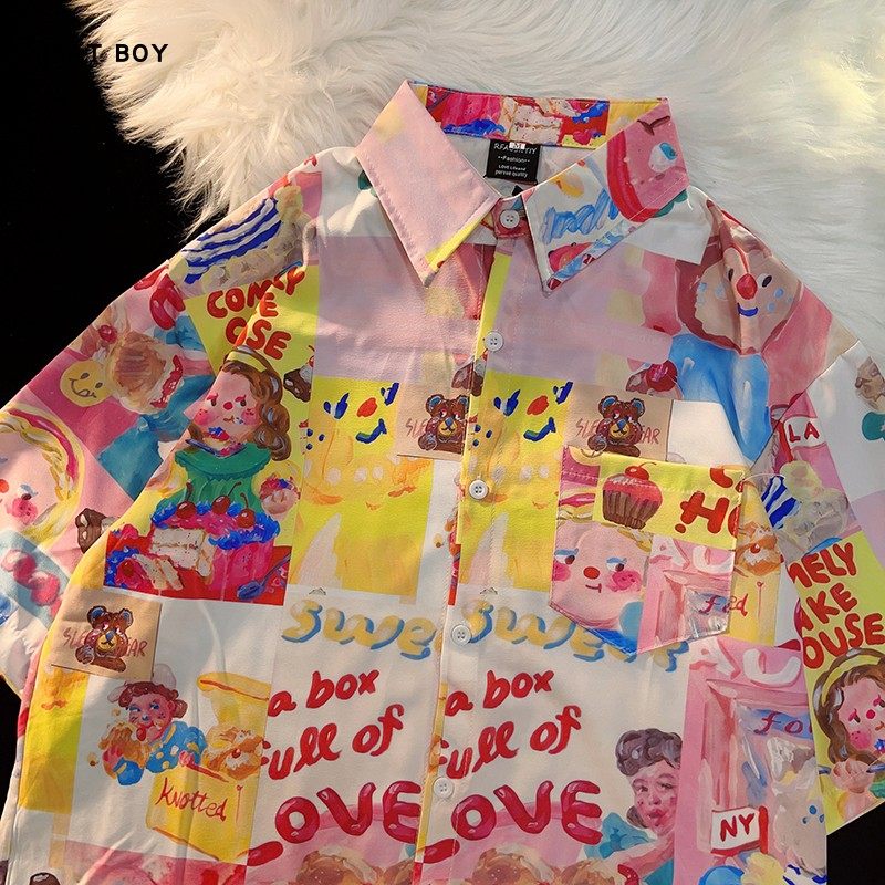 Sweet and Fun Cartoon All-Over Print Short-Sleeve Shirt for Men and Women, Summer Dopamine Outfit, Loose and Versatile Floral Shirt, Trendy