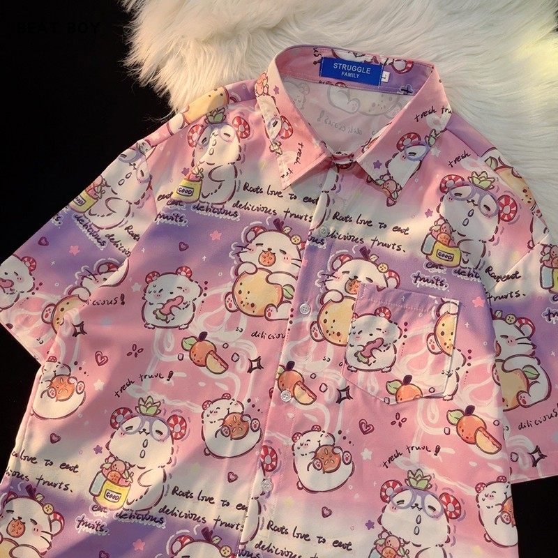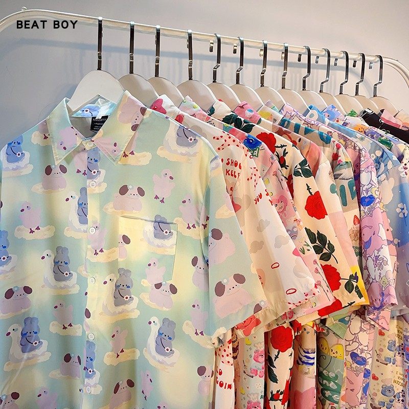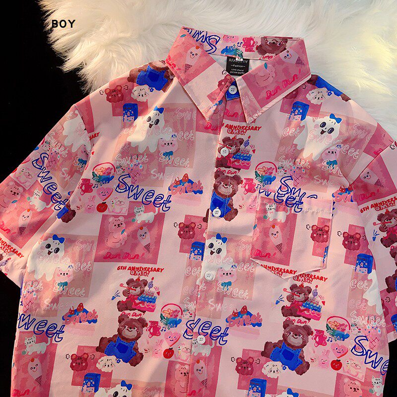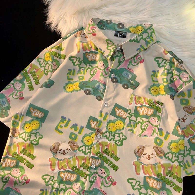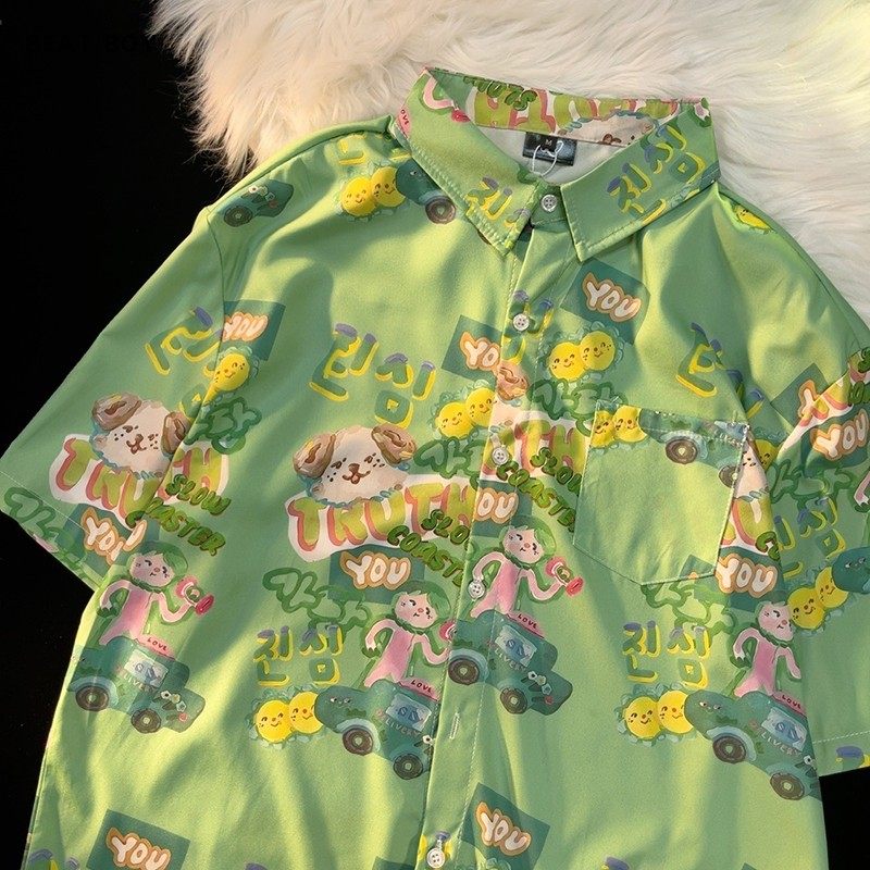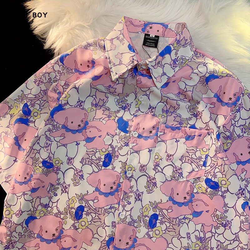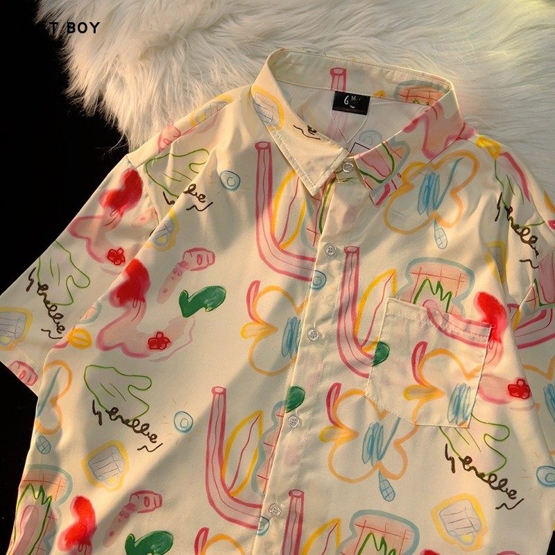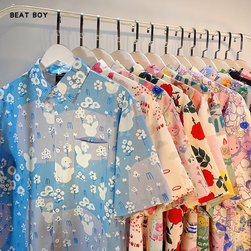 Sweet and Fun Cartoon All-Over Print Short-Sleeve Shirt for Men and Women, Summer Dopamine Outfit, Loose and Versatile Floral Shirt, Trendy