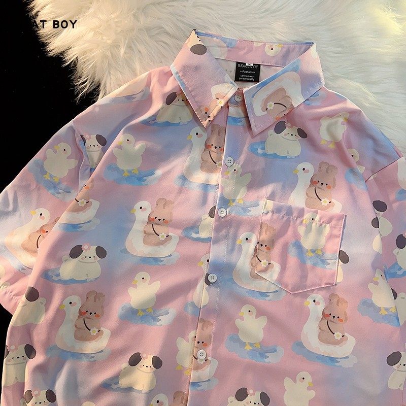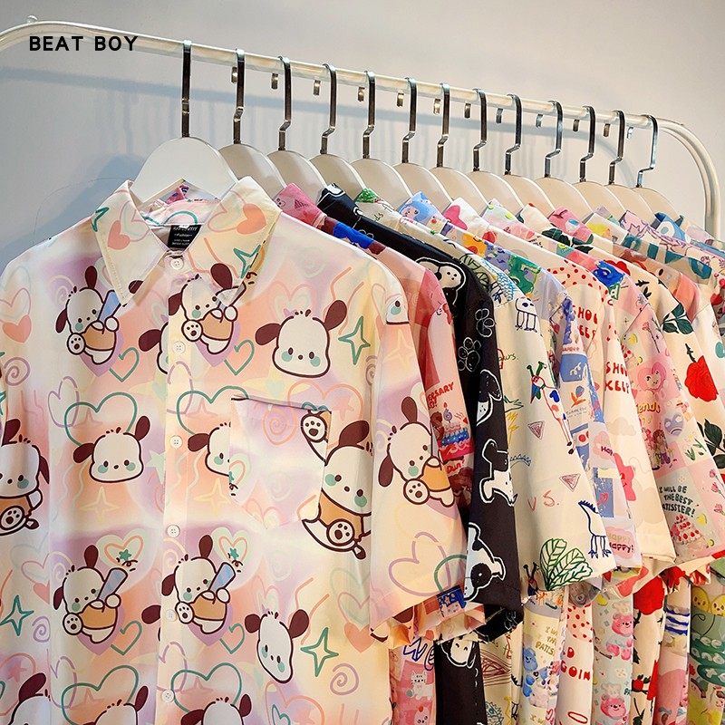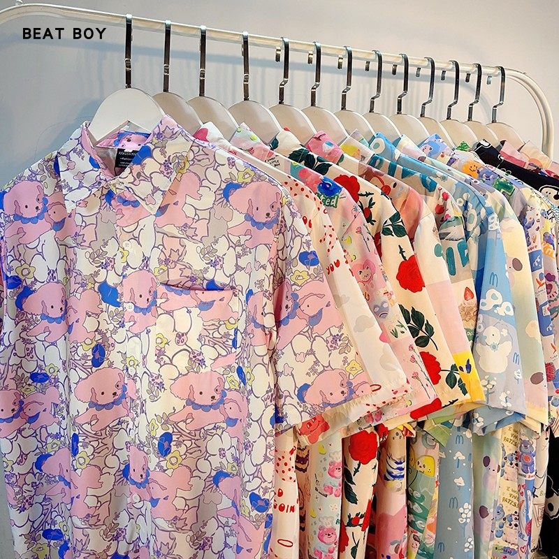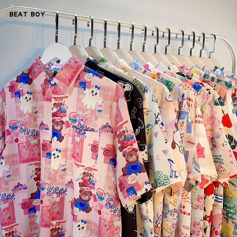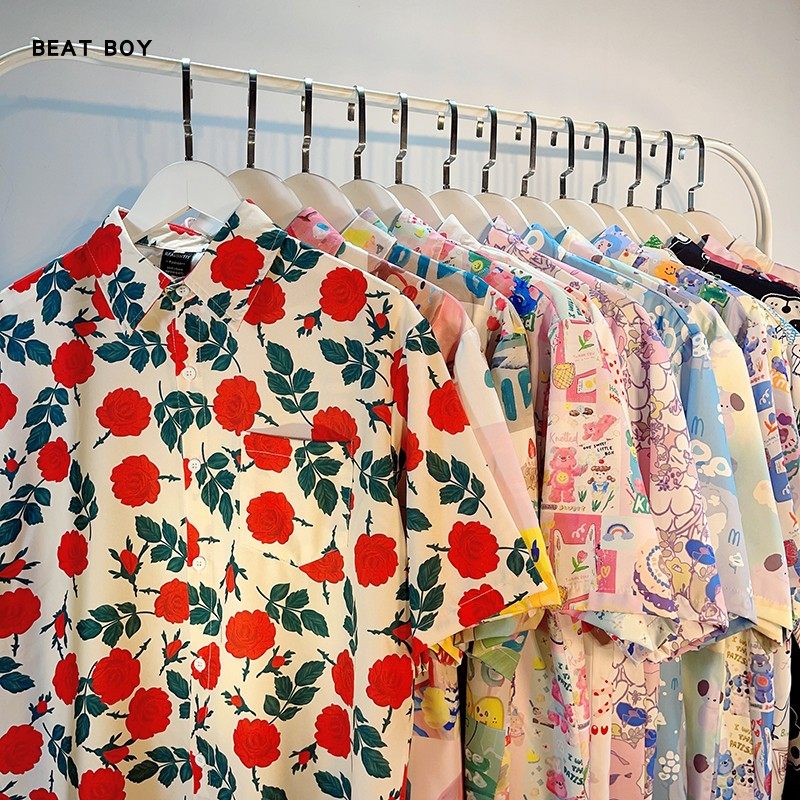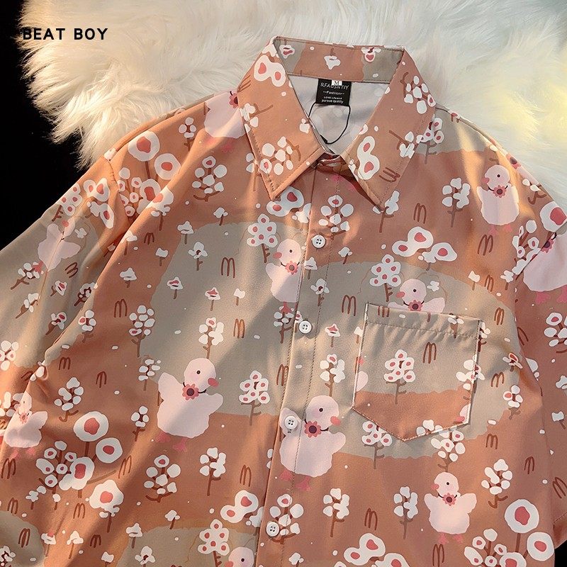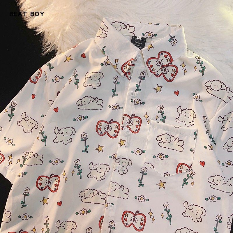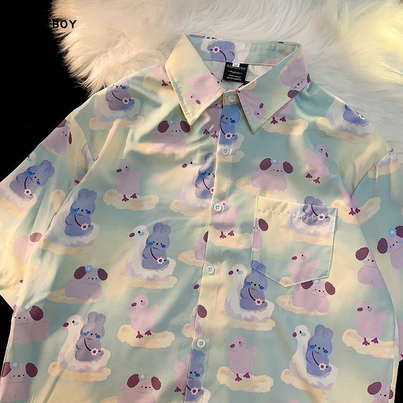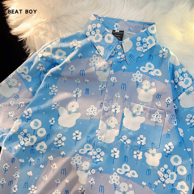 Sweet and Fun Cartoon All-Over Print Short-Sleeve Shirt for Men and Women, Summer Dopamine Outfit, Loose and Versatile Floral Shirt, Trendy