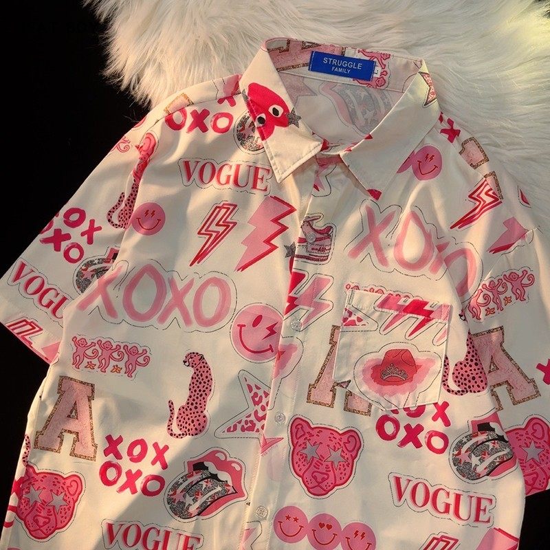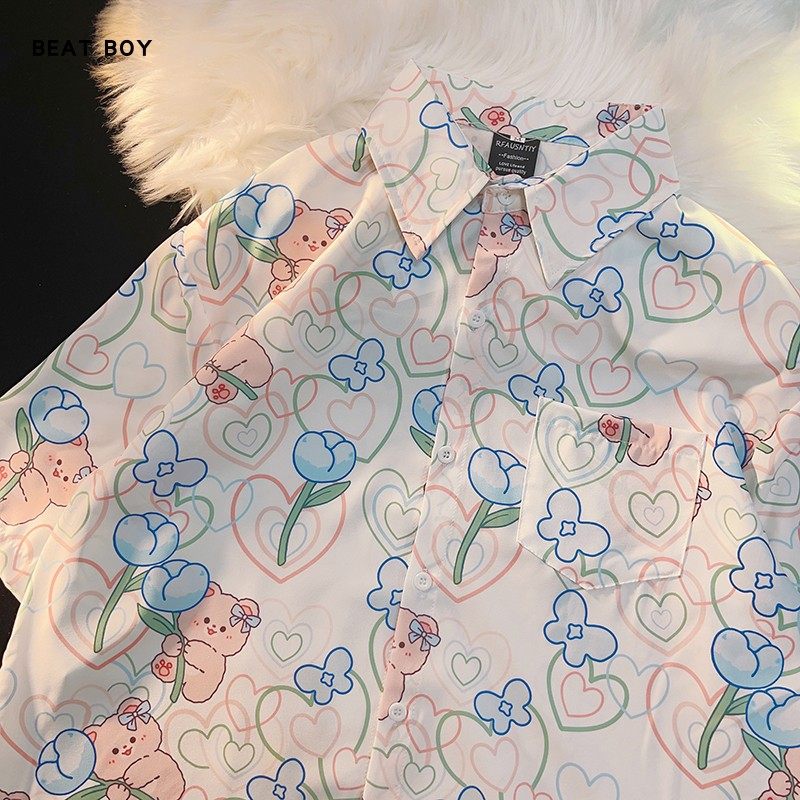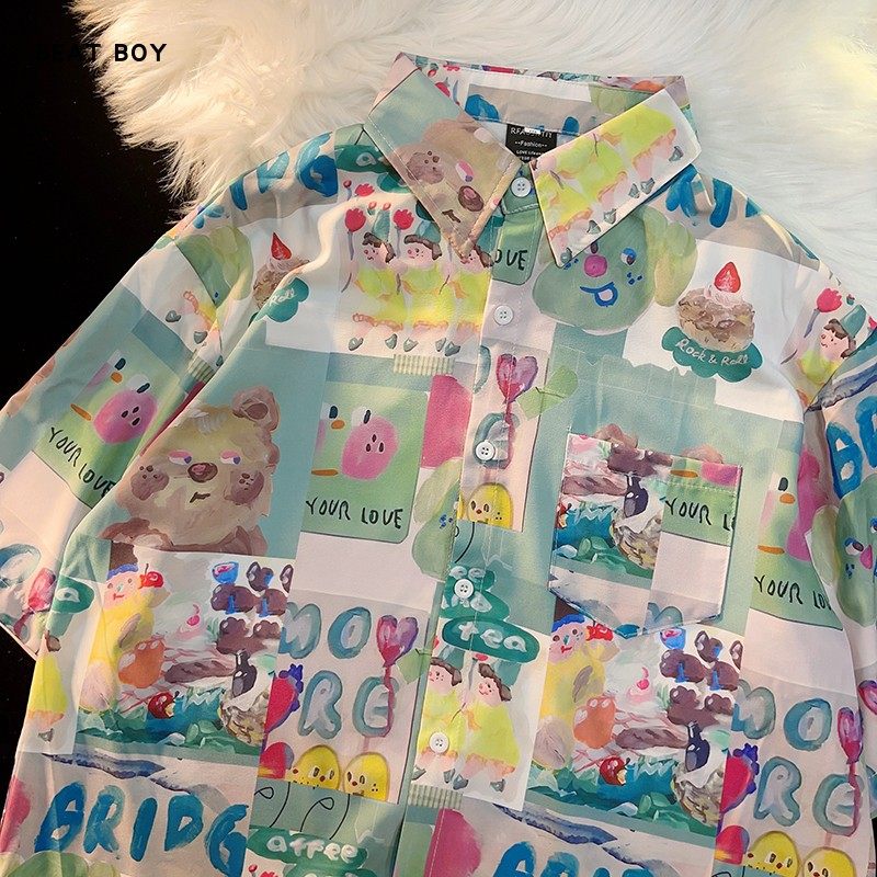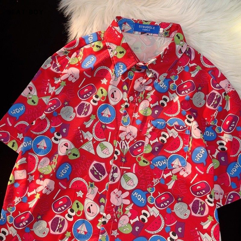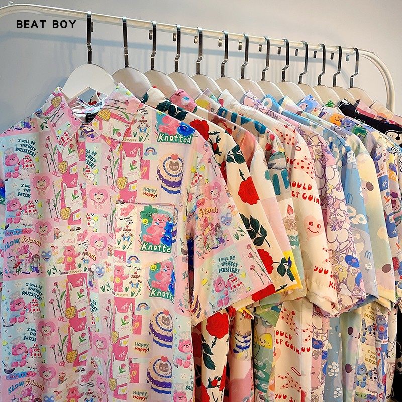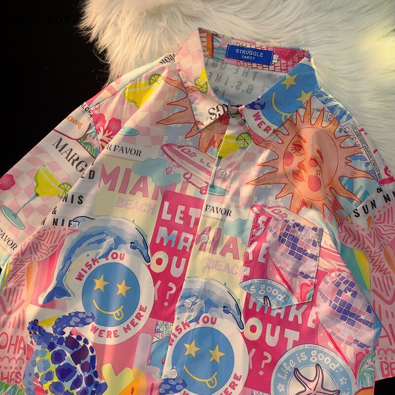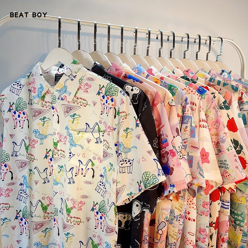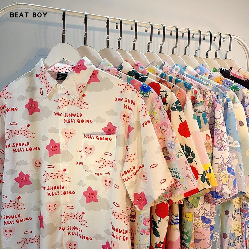 Sweet and Fun Cartoon All-Over Print Short-Sleeve Shirt for Men and Women, Summer Dopamine Outfit, Loose and Versatile Floral Shirt, Trendy