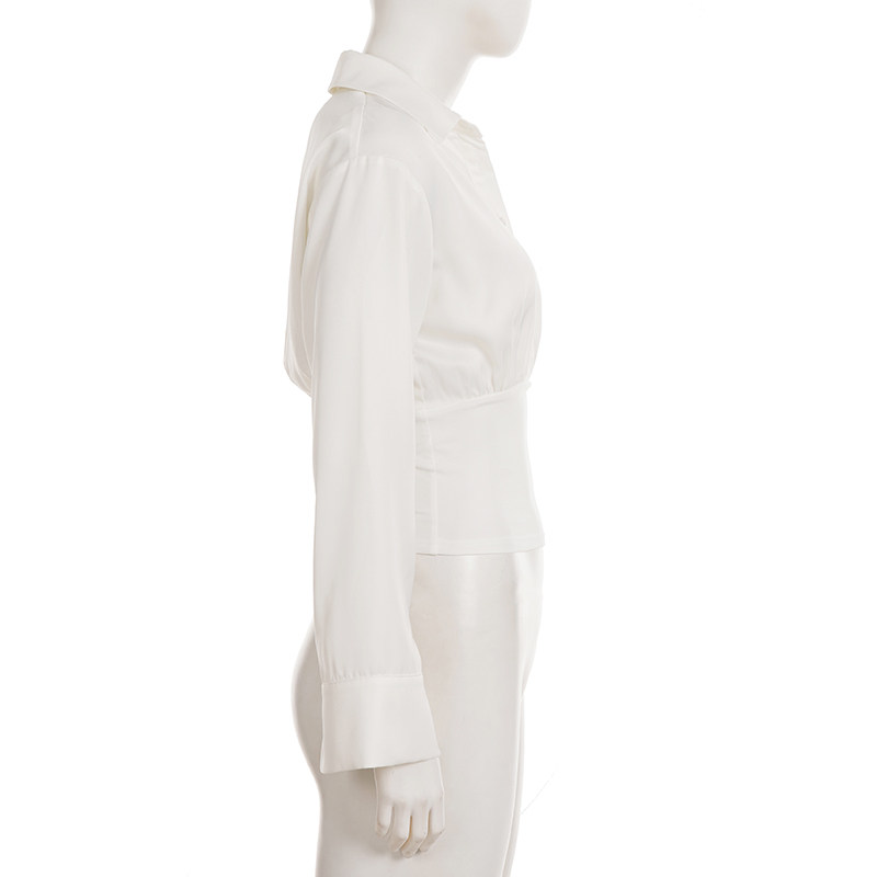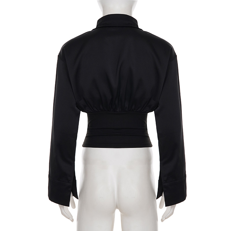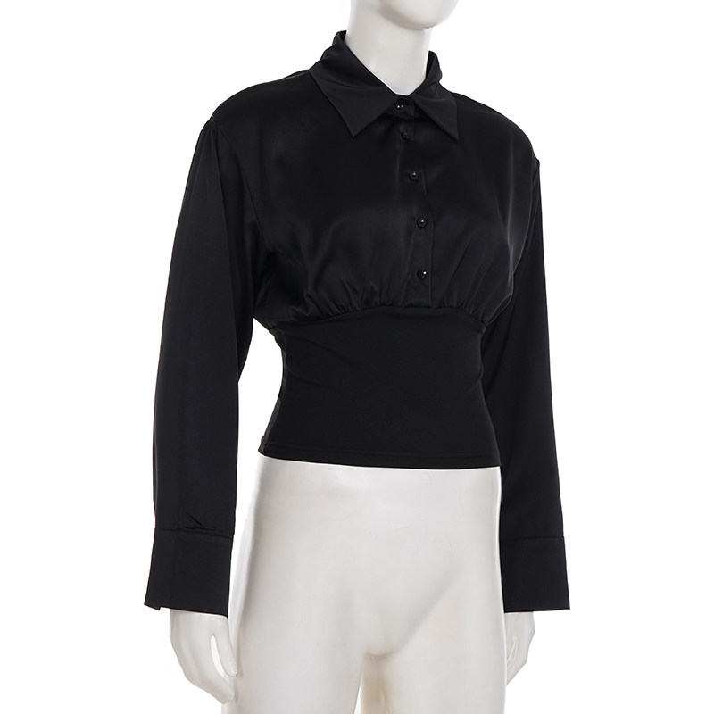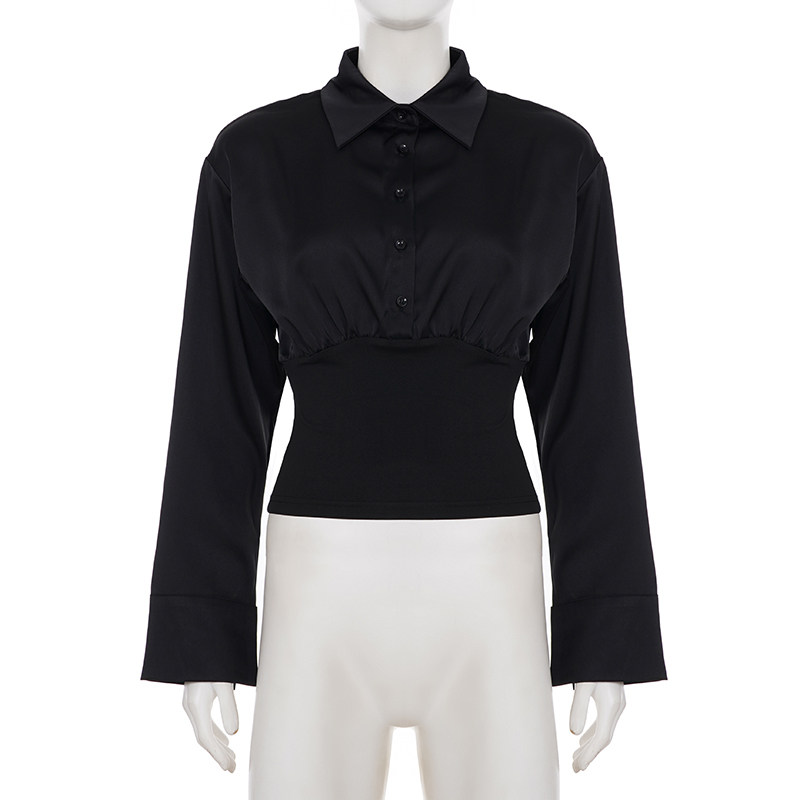 Funoff American Retro Black Button-Down Polo Collar Long-Sleeve Shirt 25 Autumn Siren Style Commuter Waist-Cinching Top